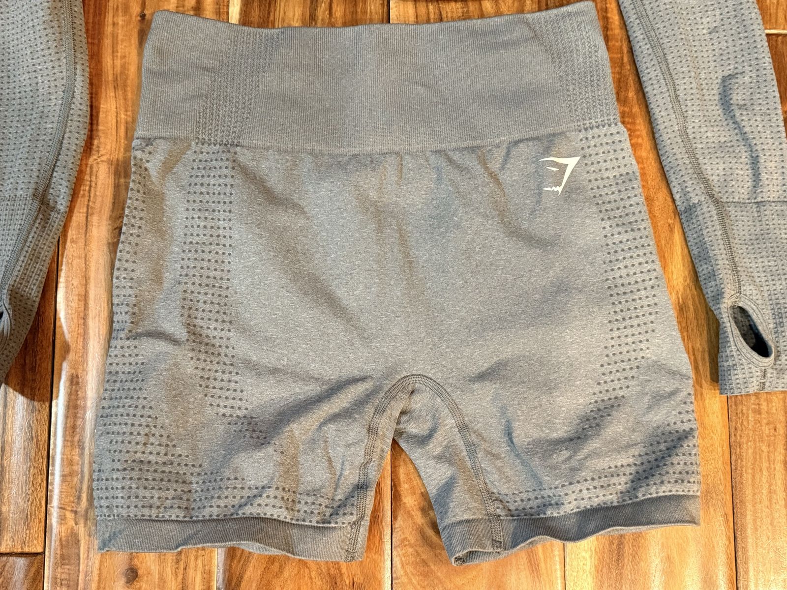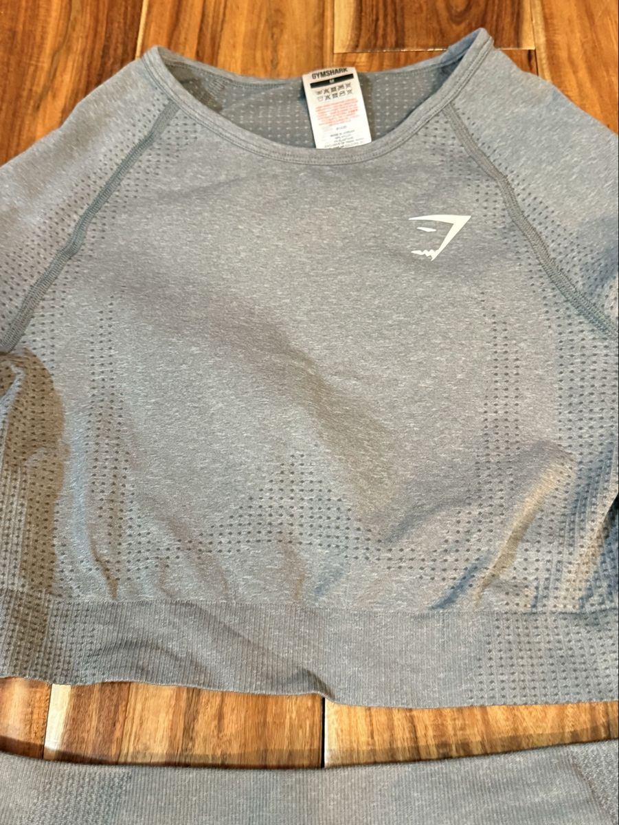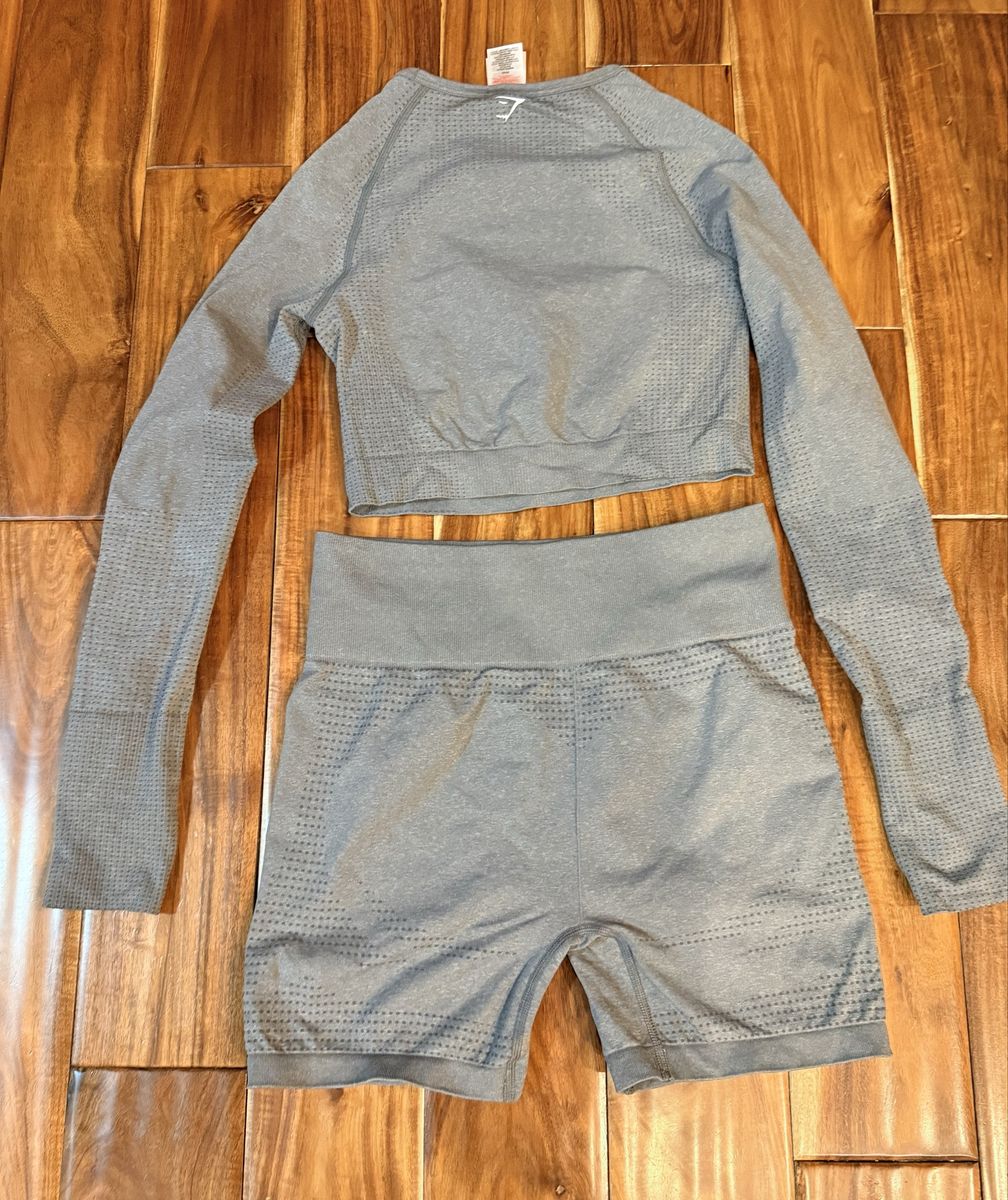 VenmoWomen Size Medium GymShark grey crop top long sleeve top and shorts set. My daughter only wore it once, so it is in great condition. Cash or Venmo. Firm on price.