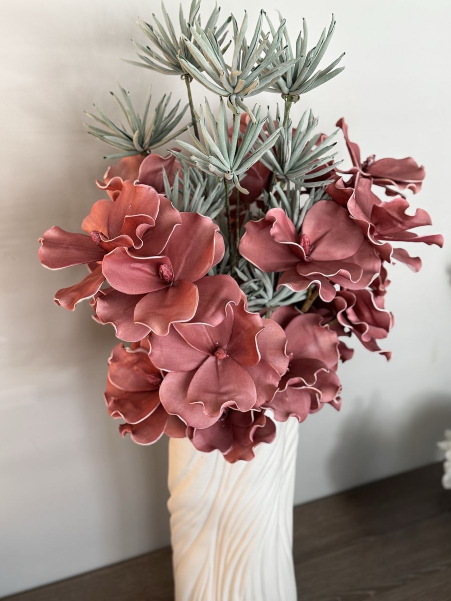 ZelleBeautiful faux floral arrangement featuring soft pink flowers and muted greenery in a stylish white textured vase. No maintenance needed—stays looking fresh year-round! Great condition.