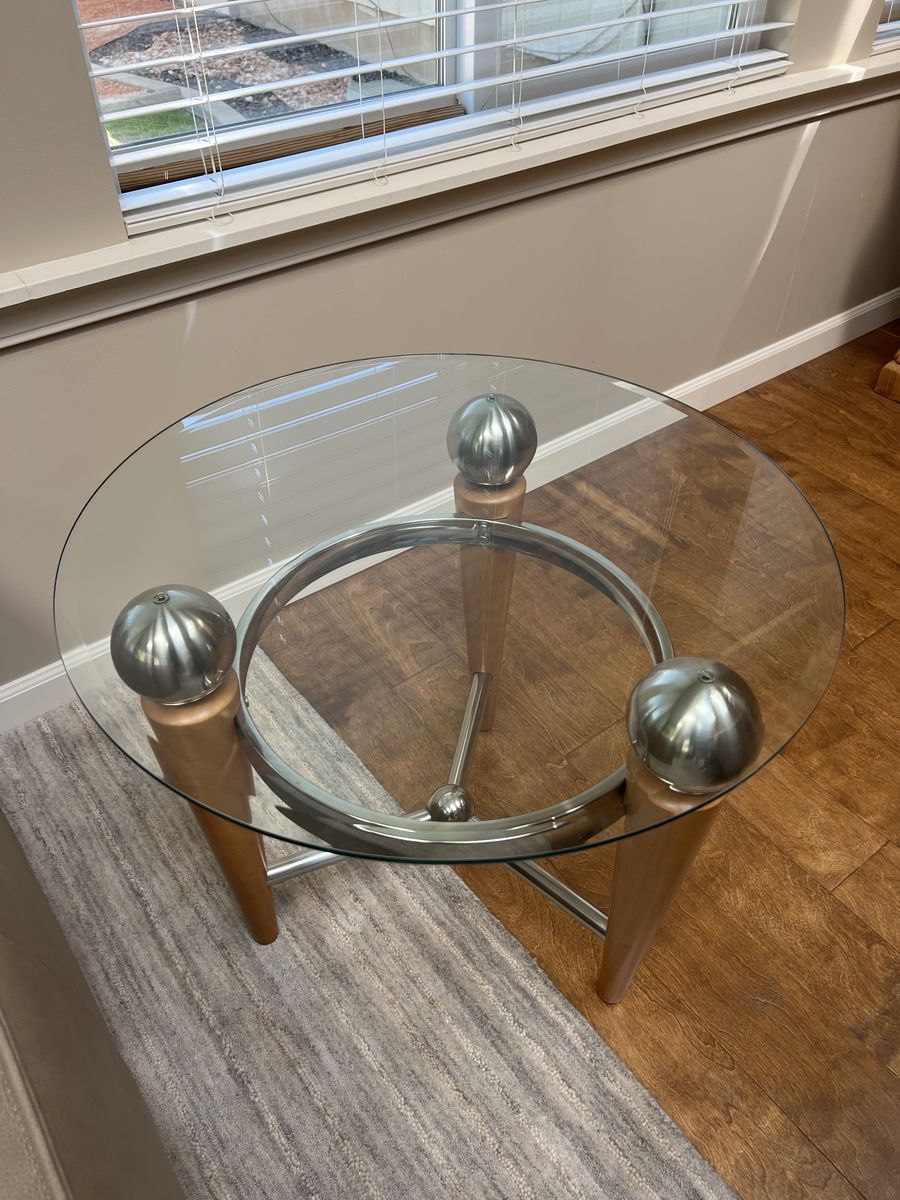 Contemporary glass and wood end table. 26W x 21H Moving Sale Estate Sale All furniture, furnishings, decorative items in the home are for sale.
