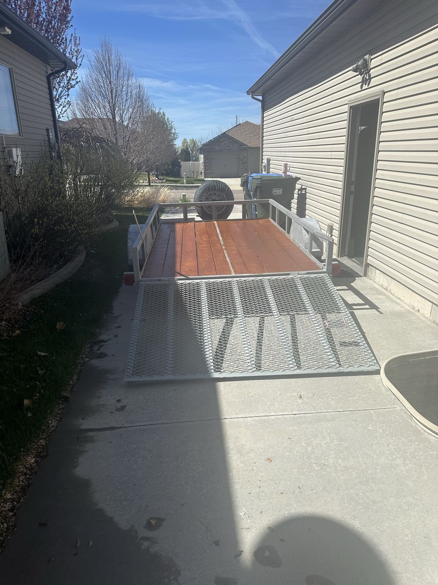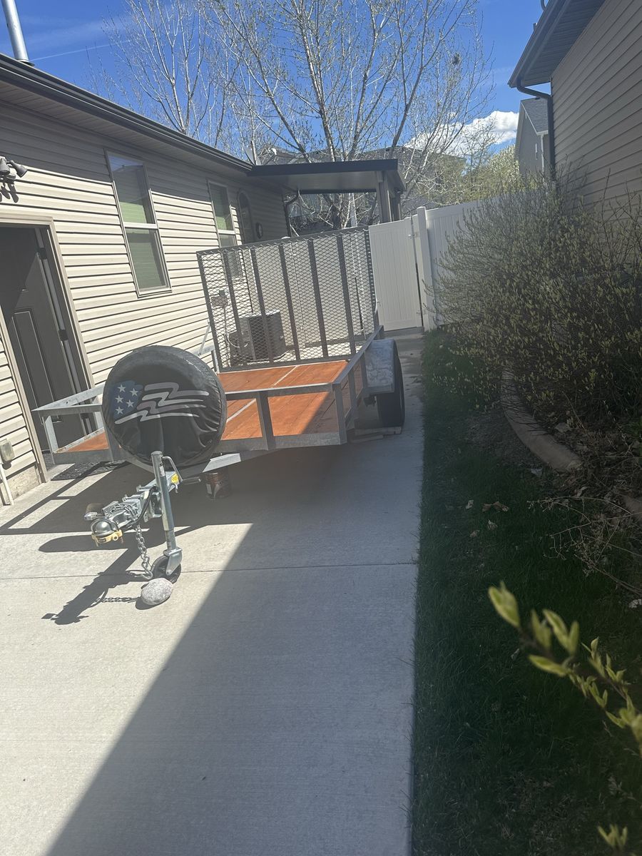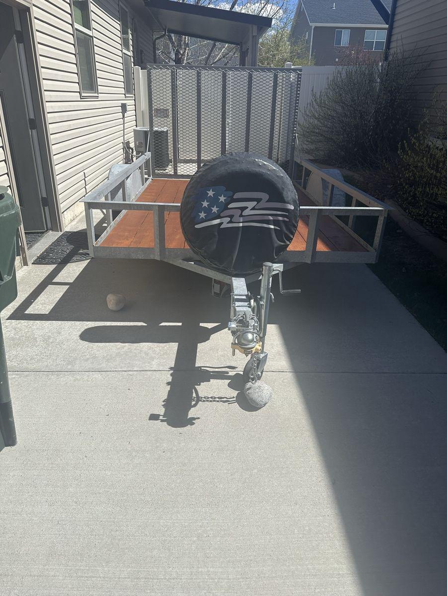 Venmo6-10 utility trailer, 73 inches width, by 120 inches 10 feet inside dimensions. Spare tire and cover 205 75 D 15., galvanized steel to prevent rusting. Sold built trailer. Front wheel to easily move around on cement. 4 prong plug.
