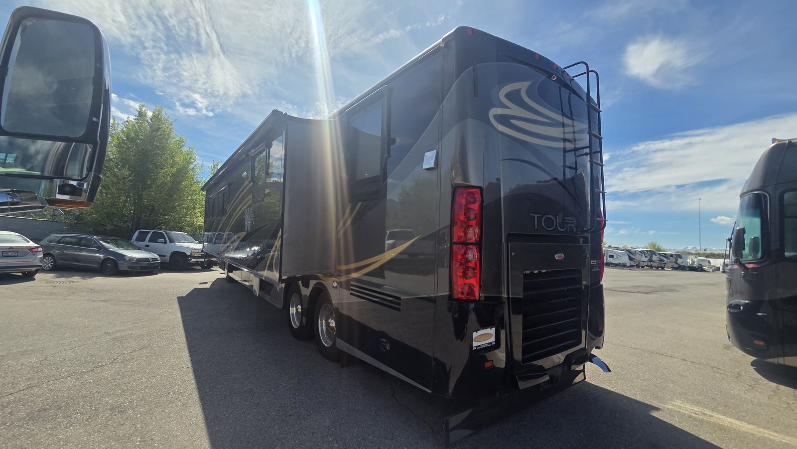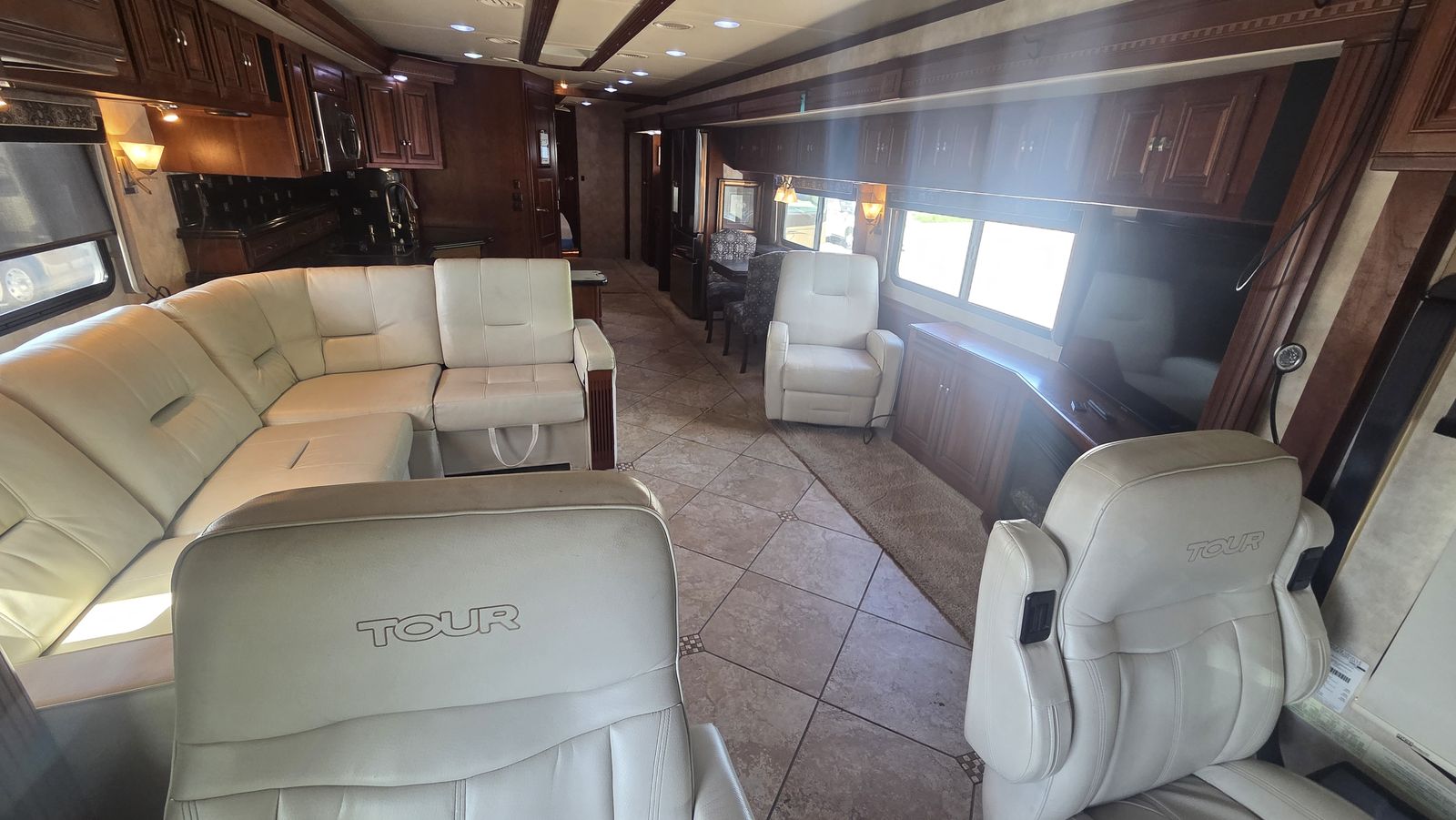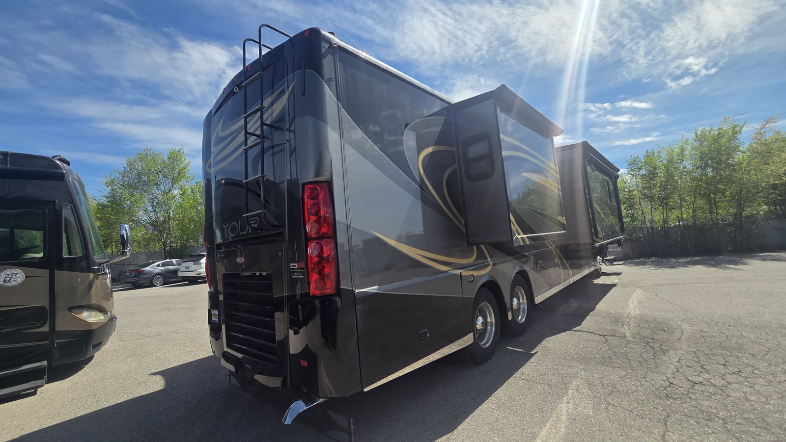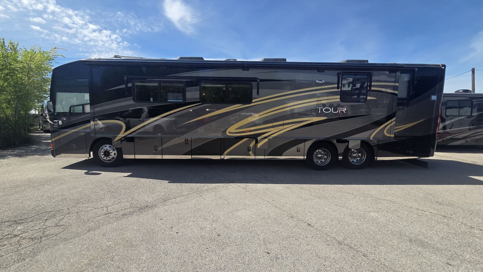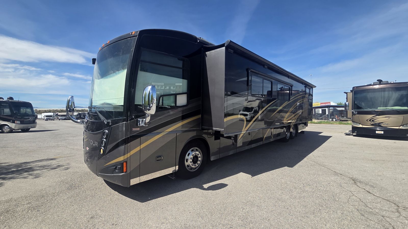 This Tour 42QD is a high-end diesel pusher with bath and a half, king bed, residential features, Aqua-Hot, and triple A/C units for maximum comfort. Built for extended travel or full-time use.