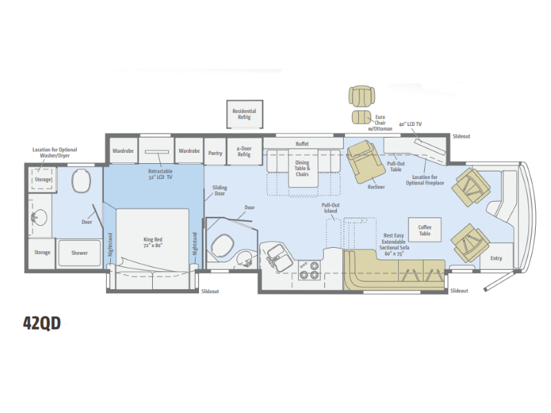 The 42QD floorplan is a bath and a half layout with quad slides, offering a spacious interior with a large living area, mid coach bath, and rear master suite with a king bed. Designed for comfort and extended travel.