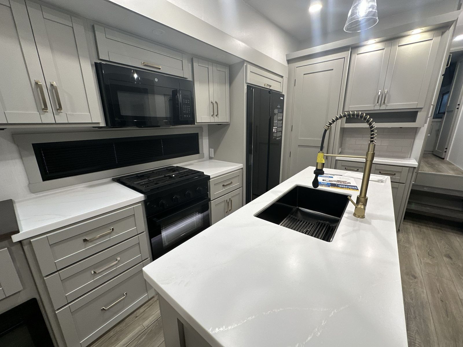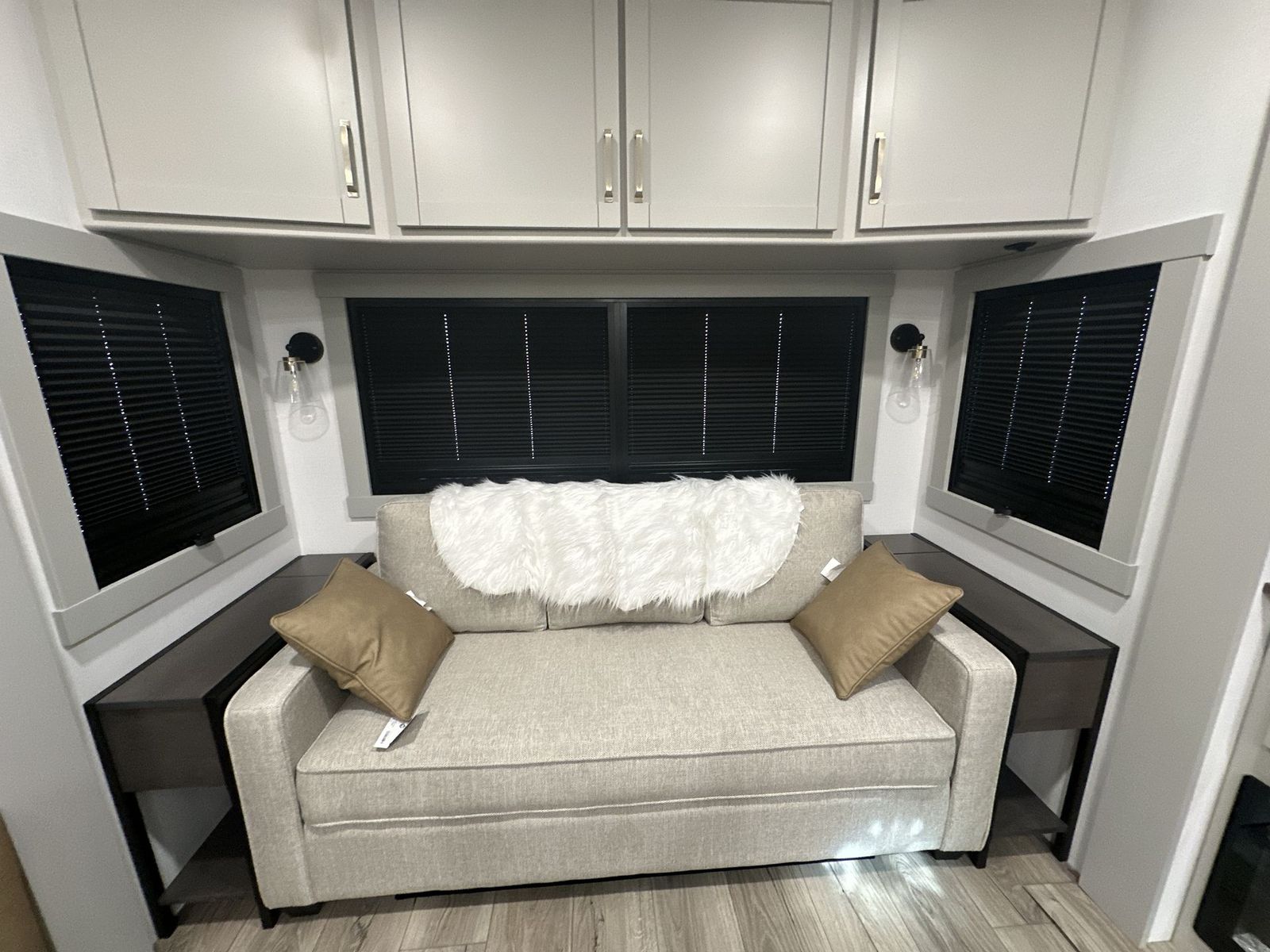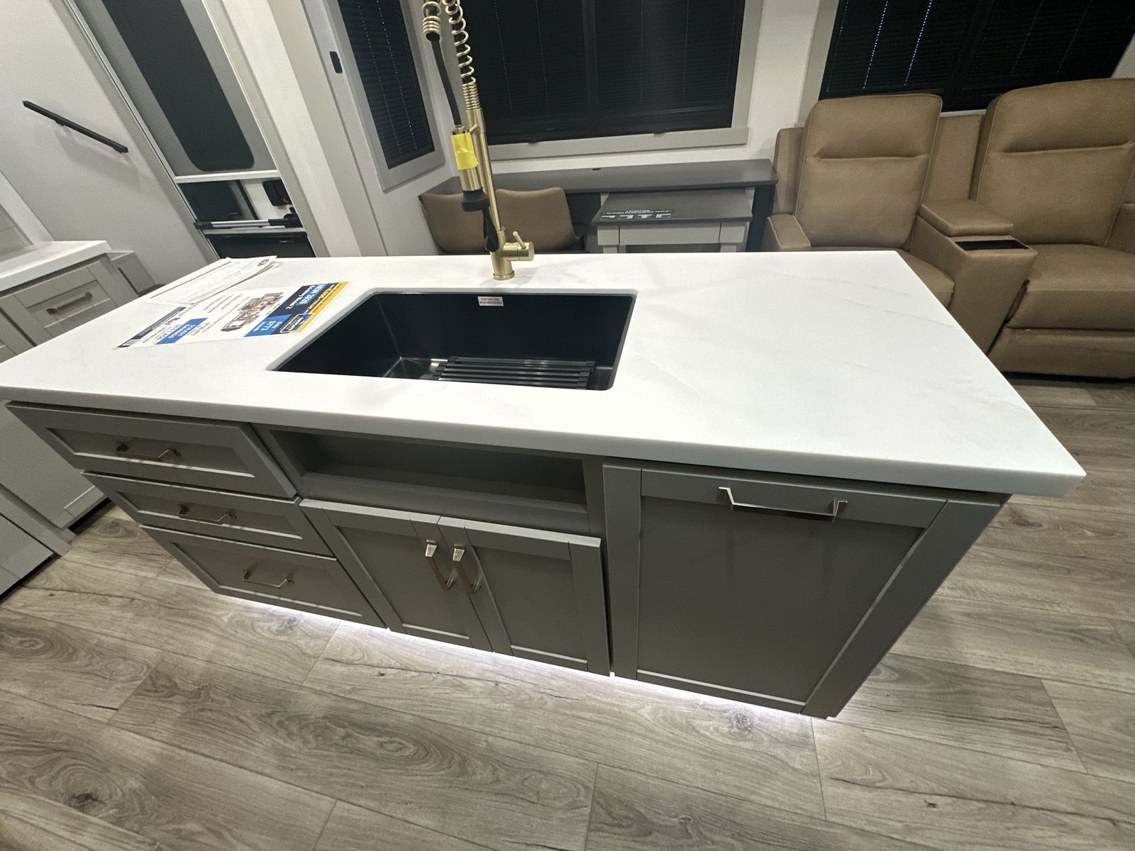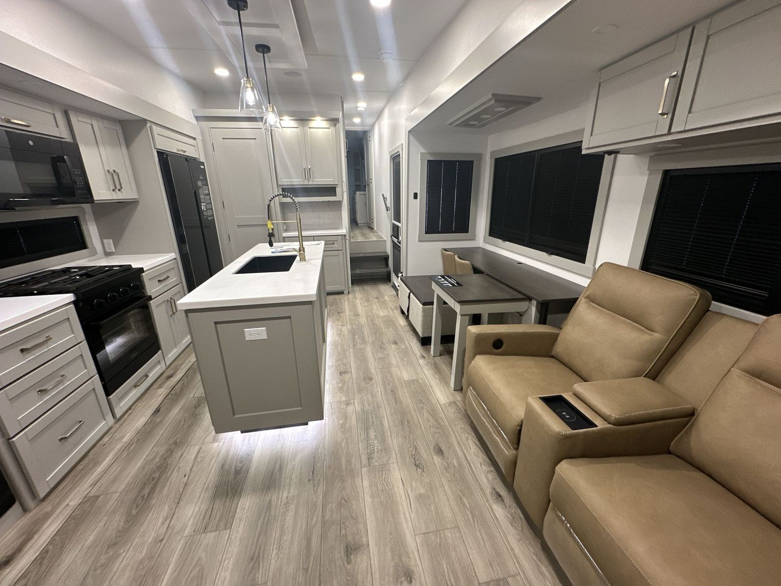 Brinkley Model Z fifth wheel 3600 highlights: Theater Seating Televator and Fireplace Integrated Pet Bowls Double Pull Out Trash Bins 16 Cu. Ft. Refrigerator Dual Bath Sinks This unit is perfect for weekends at the campground or extended stays! There is ample seating with a sliding desk/dining table, 62" theater seating, and a 72" tri-fold sofa along the rear wall. You can easily relax and enjoy the telescoping TV with a cozy fireplace below. The kitchen offers all that you need to prepare and cook meals just like home with a 16-cu. ft. refrigerator for your perishables, a 30" residential microwave oven, and three burner range top and oven. You will lovethe kitchen island all outfitted with pull-out pet bowls and double pull-out trash bins with an integrated Stow & Go paper towel holder. There is also an 84" pantry with adjustable shelves for all of your canned and dry goods.Head up the steps to a find a full bath and a private bedroom with aking bed slide all the way up front. A sliding dresser top features hidden storage which is perfect for jewelry and other personal belongings. The front wardrobe features mirrored doors, and the corner closet has been prepped for a stackable washer and dryer if you choose to add that option. The Brinkley mid-profile Model Z fifth wheels bring you clean lines and an upscale look with plenty of style and exciting new features like the industry first brass plumbing connections. These units also feature an automotive grade front cap, plenty of exterior storage, dual exterior hot and cold showers, and wide stance leveling jacks for easy set up.Residential frameless windows provide a clean look and beautiful views, and ample electrical outlets and 6 USB/USB-C outlets allow all of your electronics and appliances to easily be used and charged.