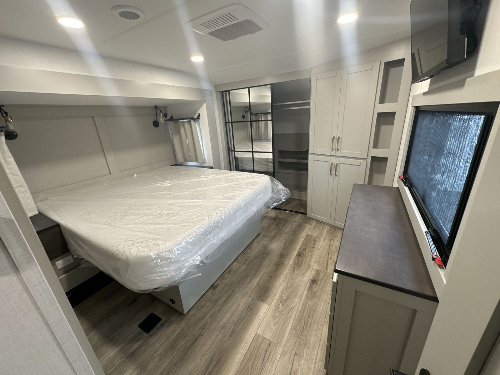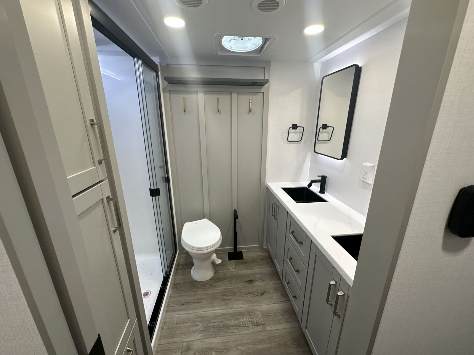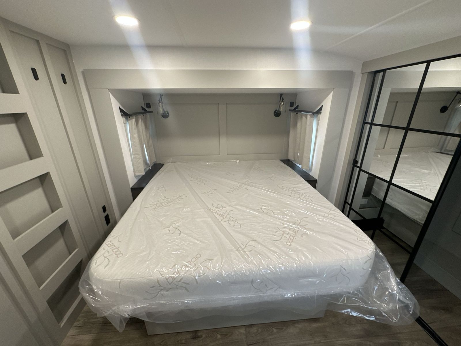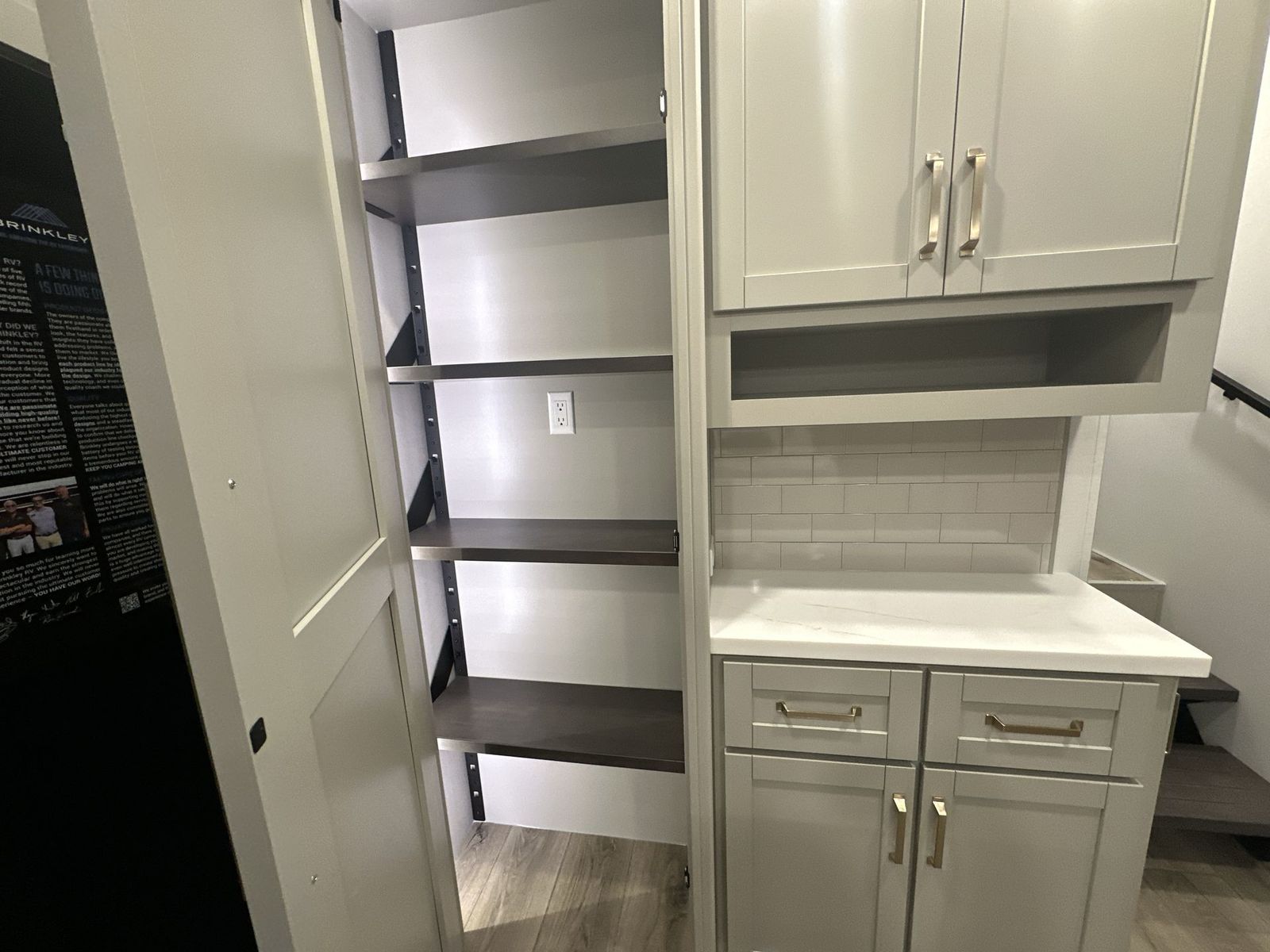 Brinkley Model Z fifth wheel 3600 highlights: Theater Seating Televator and Fireplace Integrated Pet Bowls Double Pull Out Trash Bins 16 Cu. Ft. Refrigerator Dual Bath Sinks This unit is perfect for weekends at the campground or extended stays! There is ample seating with a sliding desk/dining table, 62" theater seating, and a 72" tri-fold sofa along the rear wall. You can easily relax and enjoy the telescoping TV with a cozy fireplace below. The kitchen offers all that you need to prepare and cook meals just like home with a 16-cu. ft. refrigerator for your perishables, a 30" residential microwave oven, and three burner range top and oven. You will lovethe kitchen island all outfitted with pull-out pet bowls and double pull-out trash bins with an integrated Stow & Go paper towel holder. There is also an 84" pantry with adjustable shelves for all of your canned and dry goods.Head up the steps to a find a full bath and a private bedroom with aking bed slide all the way up front. A sliding dresser top features hidden storage which is perfect for jewelry and other personal belongings. The front wardrobe features mirrored doors, and the corner closet has been prepped for a stackable washer and dryer if you choose to add that option. The Brinkley mid-profile Model Z fifth wheels bring you clean lines and an upscale look with plenty of style and exciting new features like the industry first brass plumbing connections. These units also feature an automotive grade front cap, plenty of exterior storage, dual exterior hot and cold showers, and wide stance leveling jacks for easy set up.Residential frameless windows provide a clean look and beautiful views, and ample electrical outlets and 6 USB/USB-C outlets allow all of your electronics and appliances to easily be used and charged.