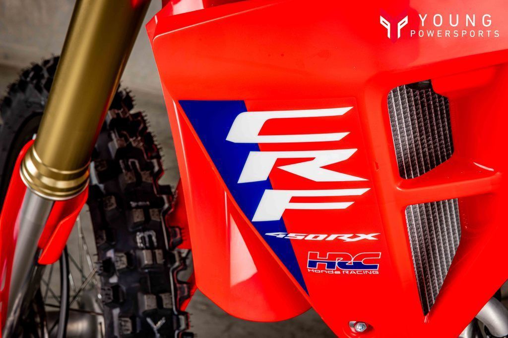 2026 Honda® CRF450RXTrack built. Trail tuned.Built on the race-proven CRF450R platform, the CRF450RX is loaded with off-road essentials like terrain-taming Showa suspension and an 18-inch rear wheel. From tight trails to wide open spaces, this bike delivers podium-grade performance with Honda’s signature durability. Fast. Tough. Ready for wherever the course takes you.Features may include:Performance450cc Unicam® engineHonda's Unicam® cylinder heads combine single- and double-overhead-cam designs to create a compact engine with a narrow valve angle. This allows for a higher compression ratio and lower center of gravity.Decompression systemCompared to the previous generation, our engineers improved the motorcycle's auto-decompression hardware, moving it from the right side of the cam to the left. This results in less stalling at low rpms and better rideability, especially when turning.HandlingResponsive frameA superior frame is crucial for excellent handling, and the chassis delivers. It's lightweight and responsive, with narrow main spars, and was designed with direct input from Team Honda HRC riders.Tripleclamps, axle, and steering stemCompared to the previous generation, we revised the tripleclamps, frame, fork, and steering stem for improved chassis rigidity and responsiveness to give the bike better cornering feel.EngineeringHydraulic clutchThis bike has a hydraulically actuated Nissin clutch, which is the same design as our Grand Prix MX machines and has a ten percent lighter pull. You won't need to make clutch-cable adjustments, even during long events.StyleRace stylingLike our factory racebikes, the CRF logo is stacked and features our "in-mold" graphics, designed to remain durable after repeated track sessions and cleaning.Comfort & ConvenienceOne-piece radiator shroudsOur engineers used Computational Fluid Dynamics to fine-tune the radiator shrouds for increased cooling efficiency. The one-piece design ensures consistent power output and prevents overheating.