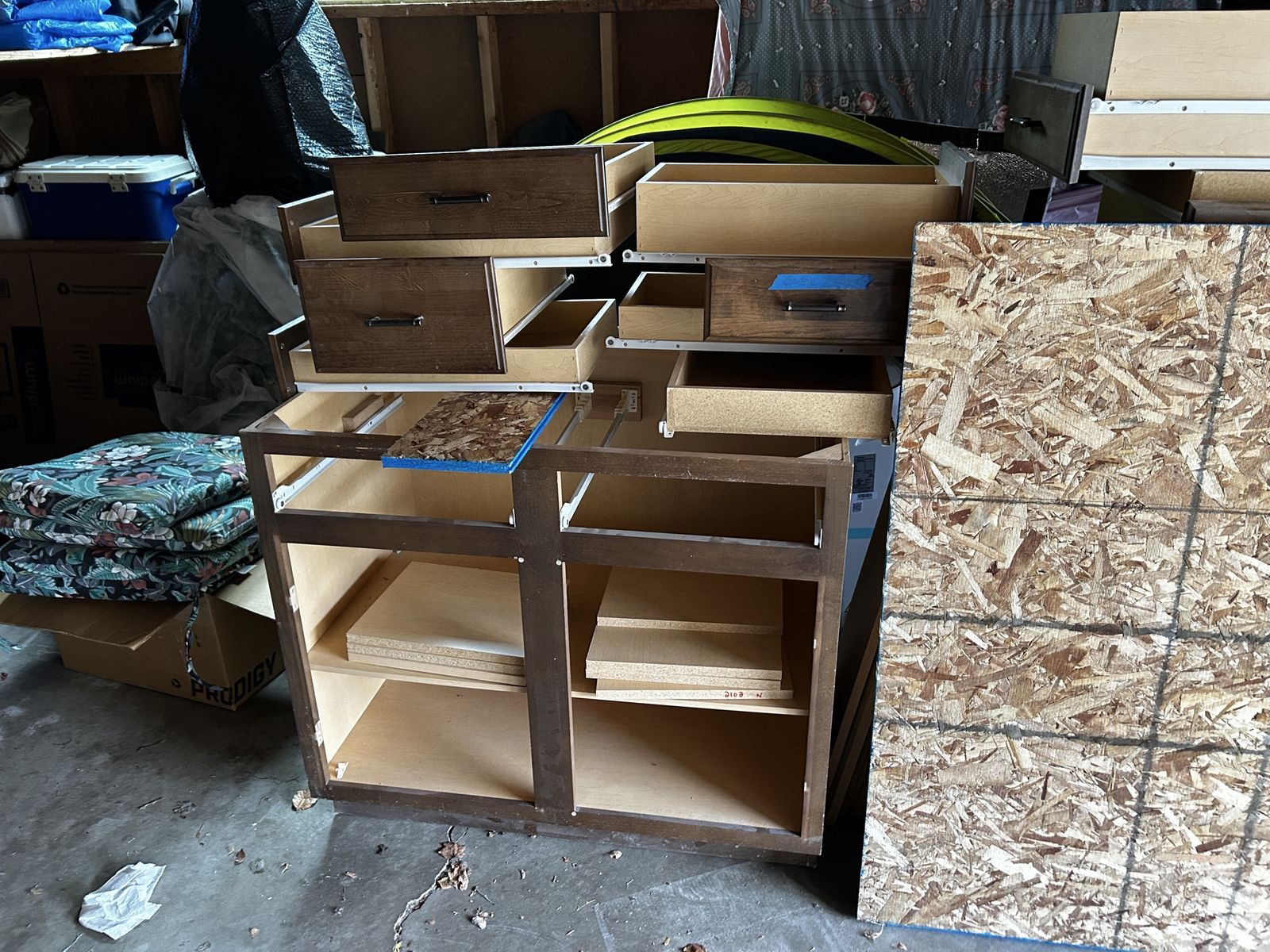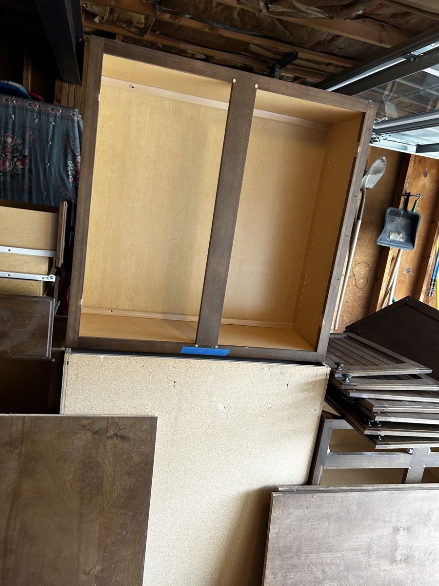 2-36 inch bases - shelves 1-18 inch base - drawers 1-15 inch base- drawers 1-42 inch wide upper 1-42 inch tall 18 inch wide upper 1-36 inch wide 36 inch tall upper 2 - 8’ x 30” solid panels) fridge liners All come with matching drawers and doors. Pick up in Provo evenings and weekend only. Remodel extras.