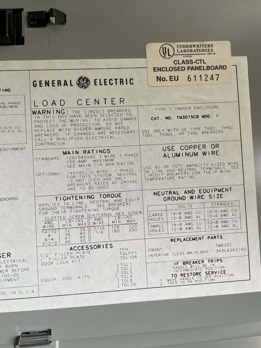 New GE 150 amp ccircuit breaker panel for residential use. 150 amp main breaker in panel with 30 breaker spaces. 120/240 volts. Asking $100. cash sale. No venmo. Local sale. Located in Eagle Mountain, Utah Valley, Utah. Contact John at 801 7876415. Text OK. No emails.