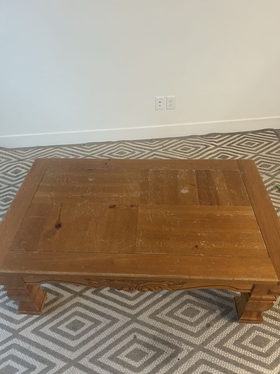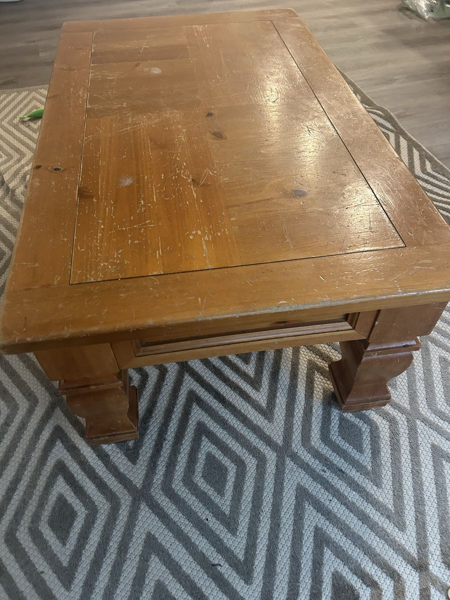 Coffee table in okay shape. Moving and need it gone. About 18 in. to 2 feet tall 4 feet long. Some scratches but all around in good shape.