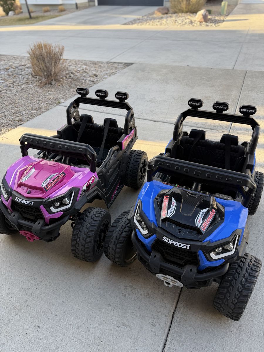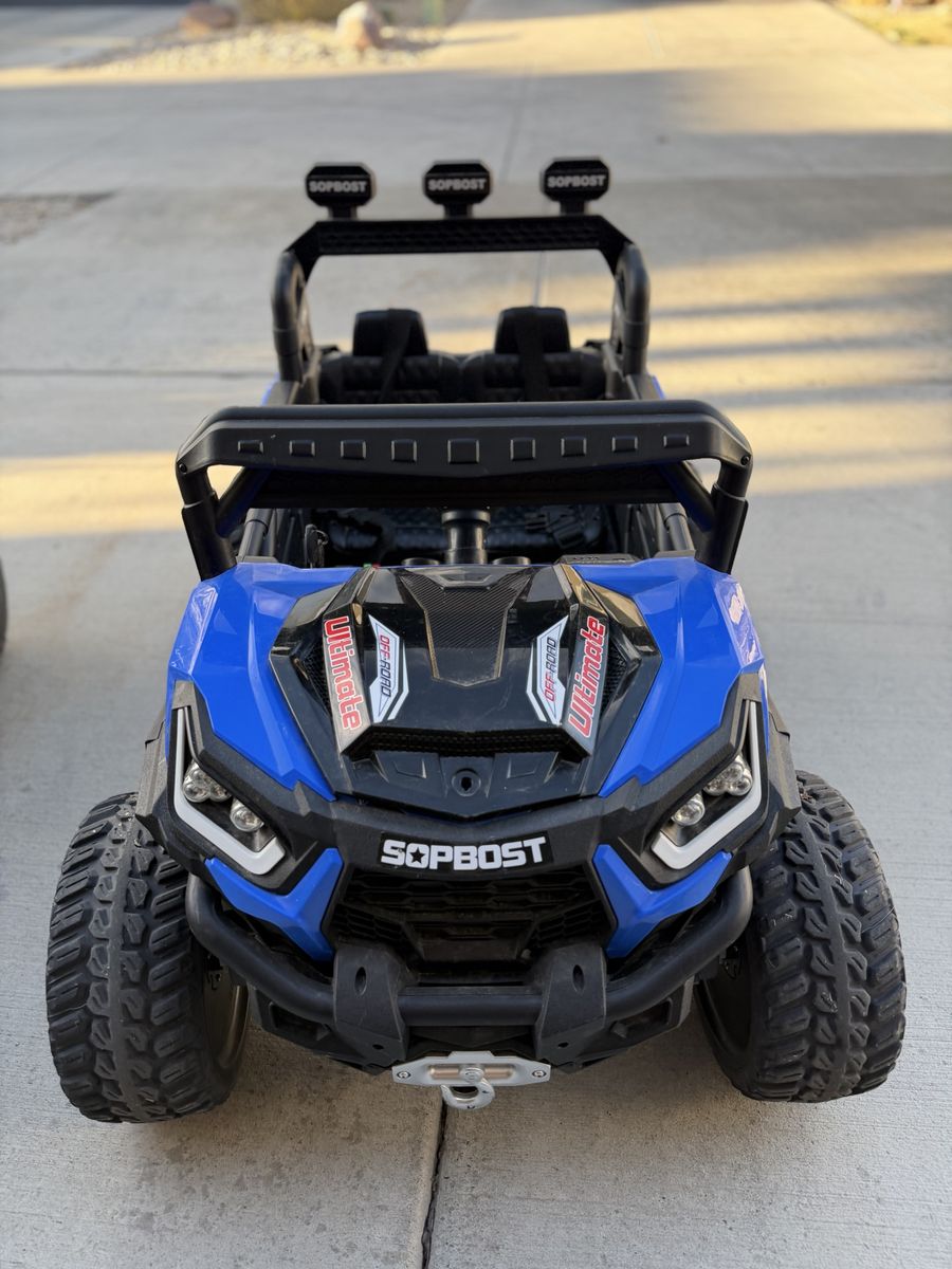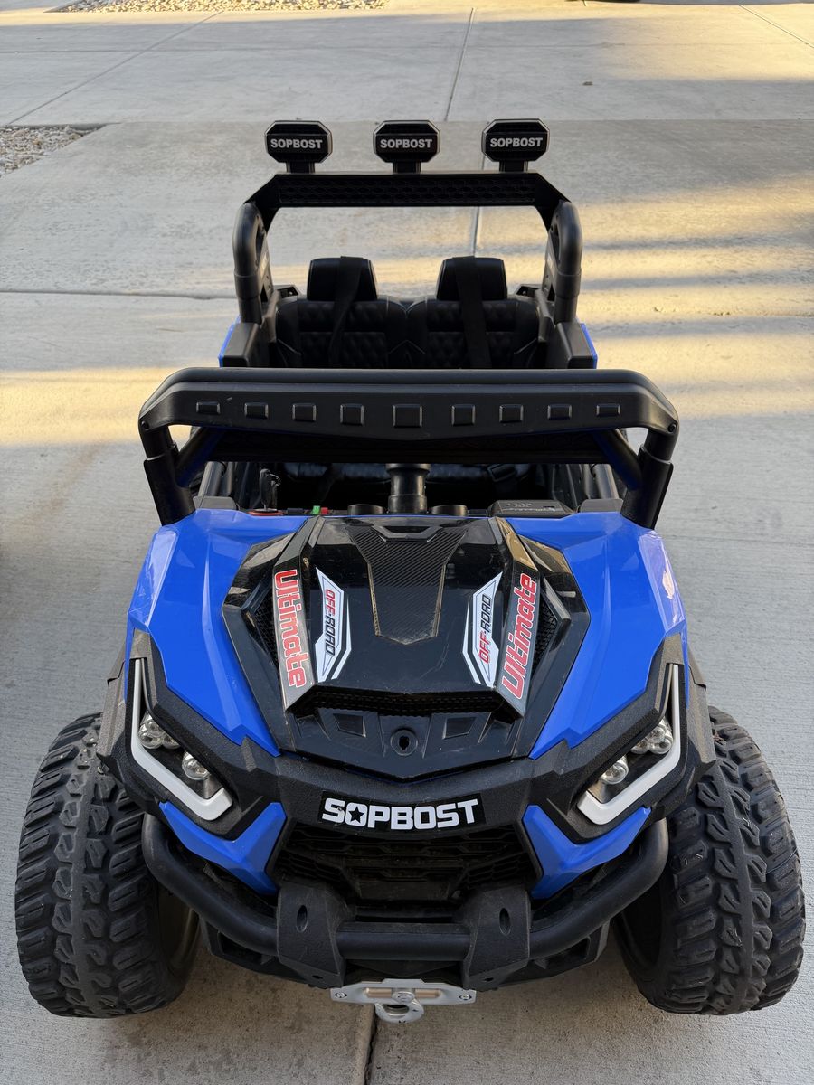 Selling a blue kids electric ride-on UTV style car. This thing is super fun and perfect for kids who want their own little off-road vehicle. It has rugged tires, working lights, and a cool off-road design that makes it look like a real side-by-side.