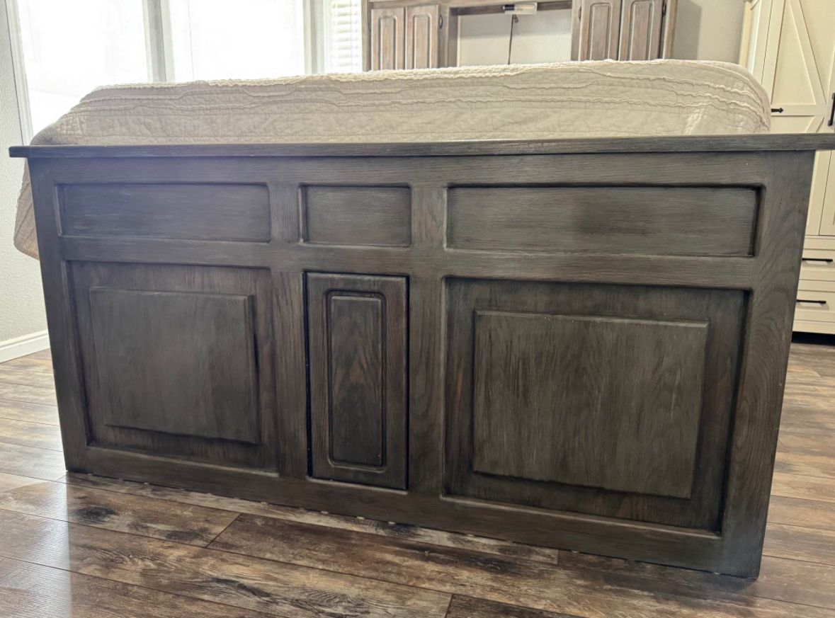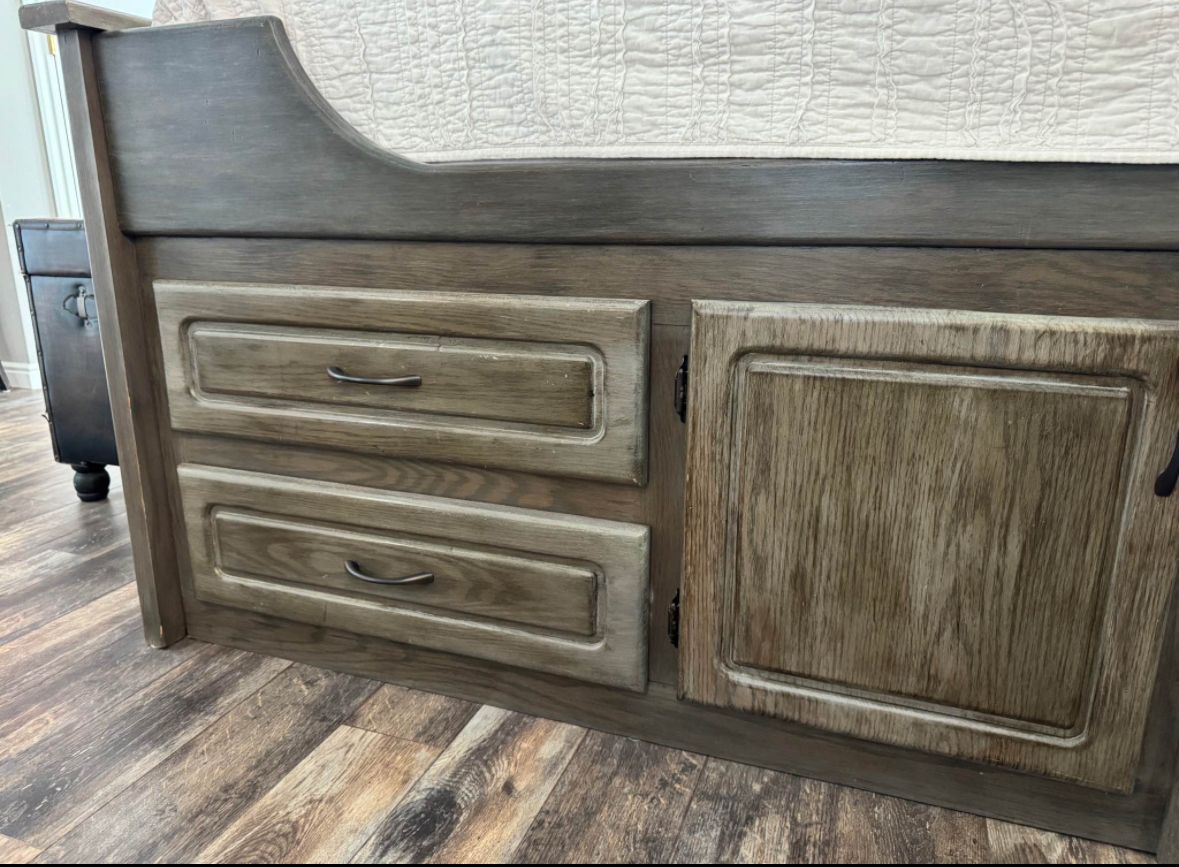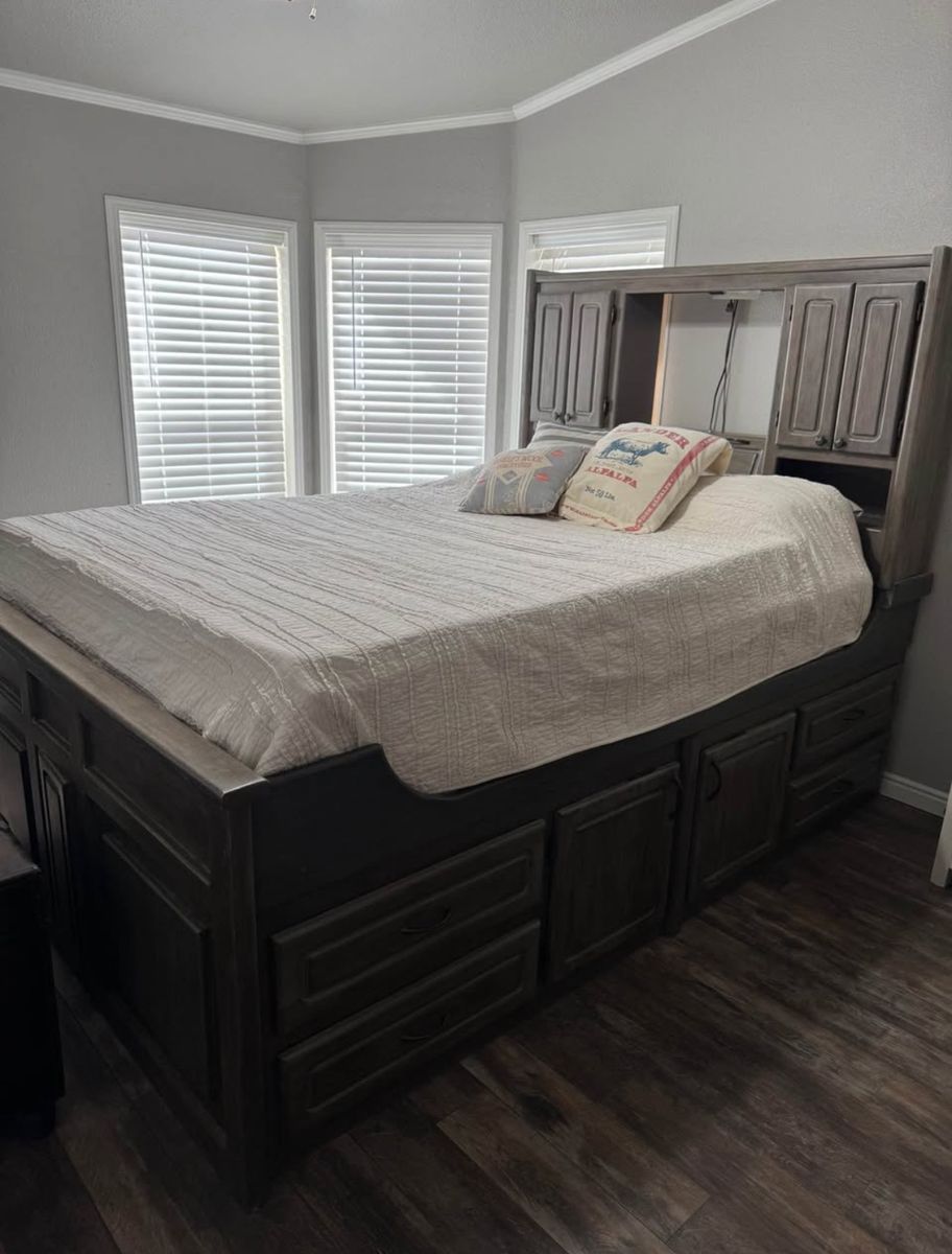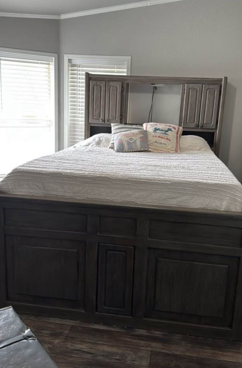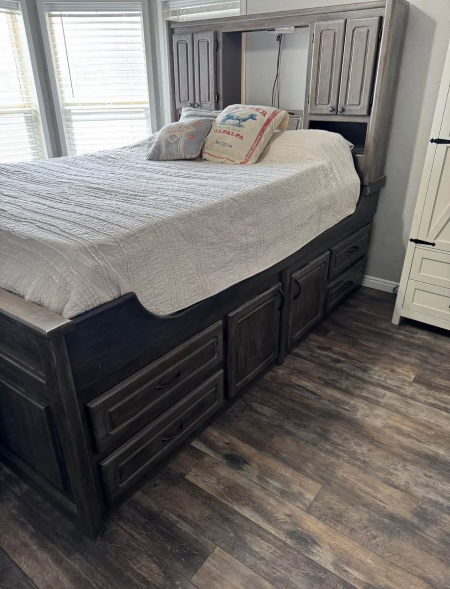 PayPalHeavy duty Queen captains bed. 4 drawers and 2 cupboards on each bottom side. Door on end of bed to store things under the bed. Storage cupboards and light in headboard. This is a great bed to help save space! Refinished with gel stain for a barn wood look. All drawers work/slide. Mattress not included.