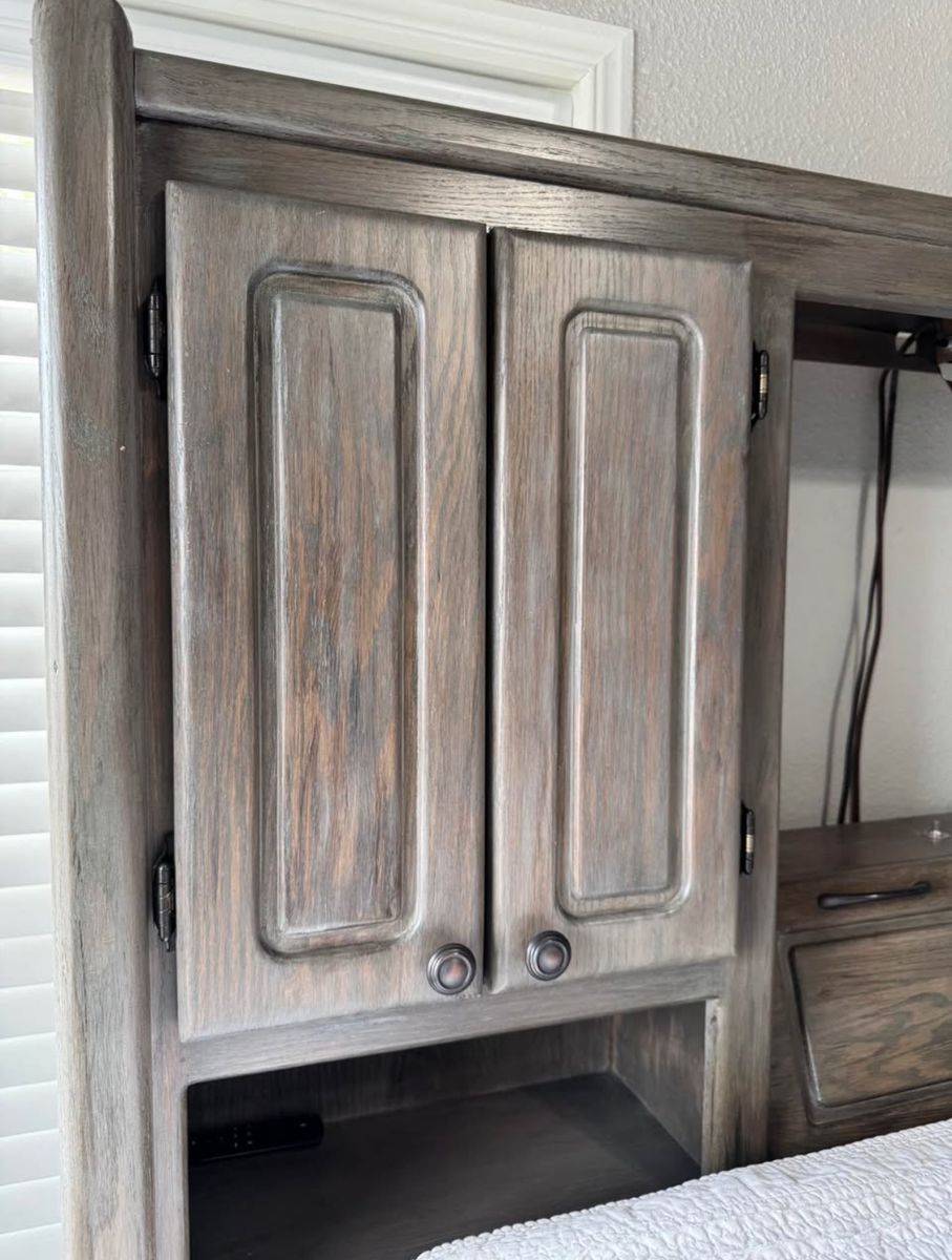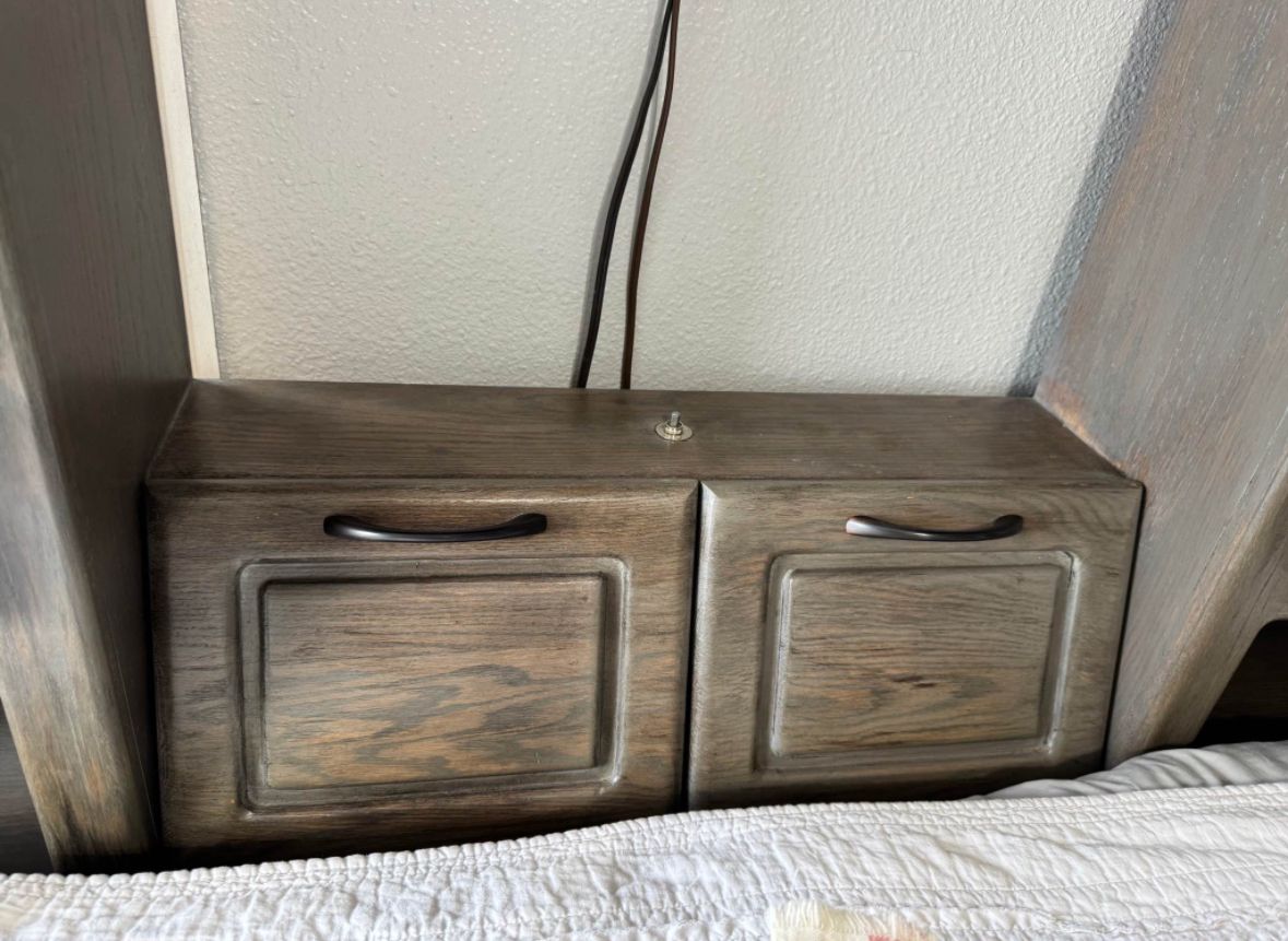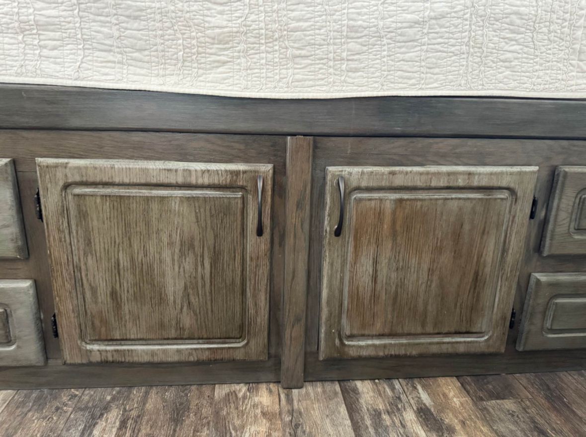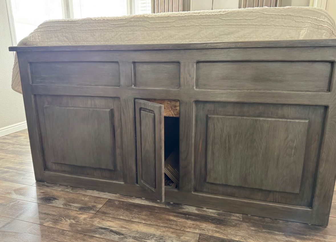PayPalHeavy duty Queen captains bed. 4 drawers and 2 cupboards on each bottom side. Door on end of bed to store things under the bed. Storage cupboards and light in headboard. This is a great bed to help save space! Refinished with gel stain for a barn wood look. All drawers work/slide. Mattress not included.