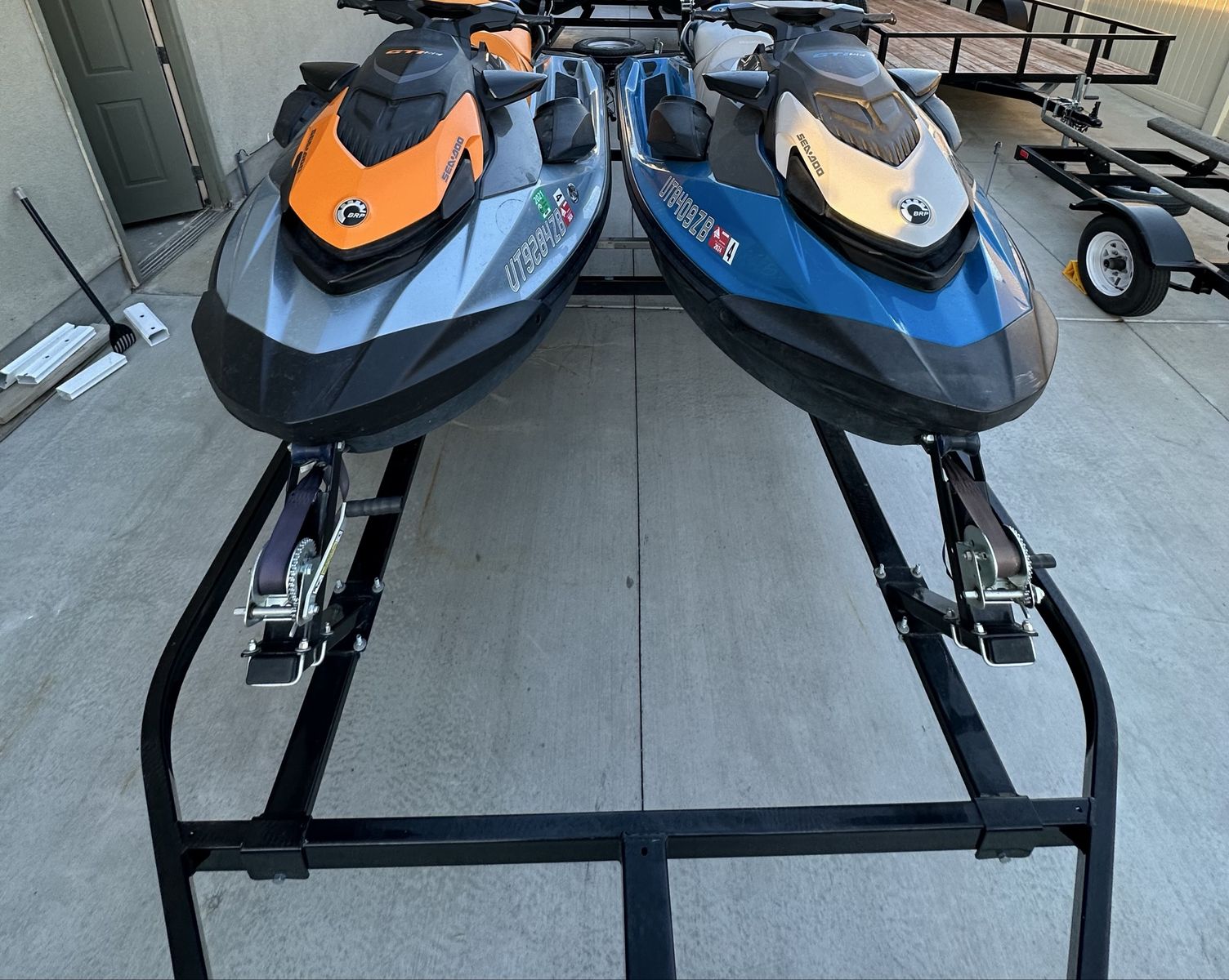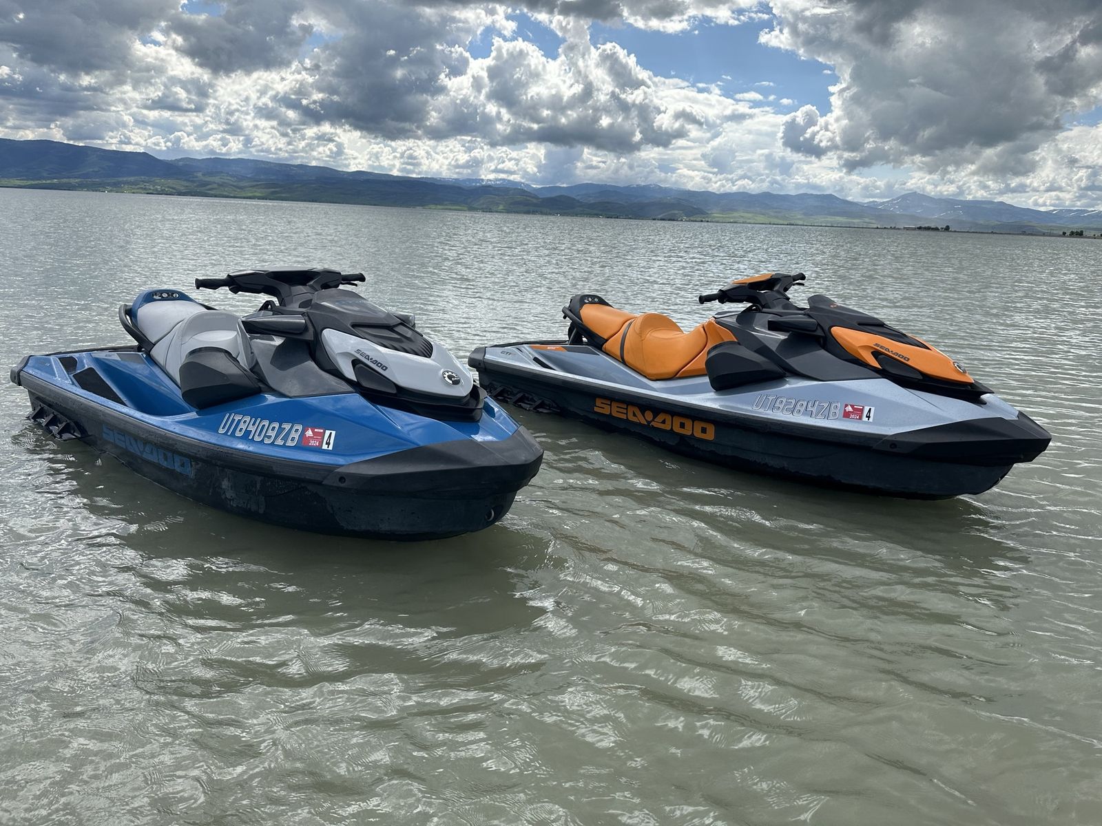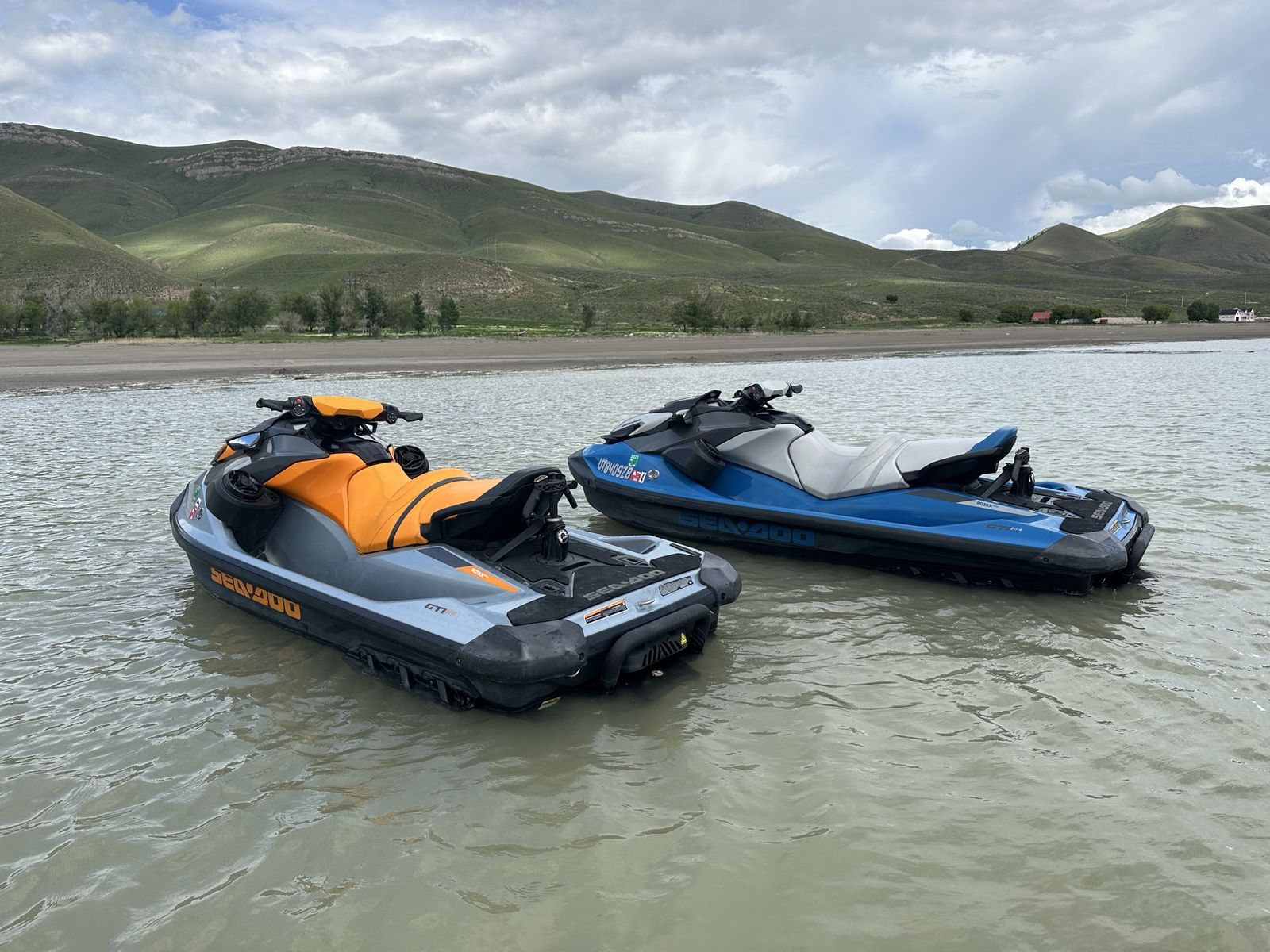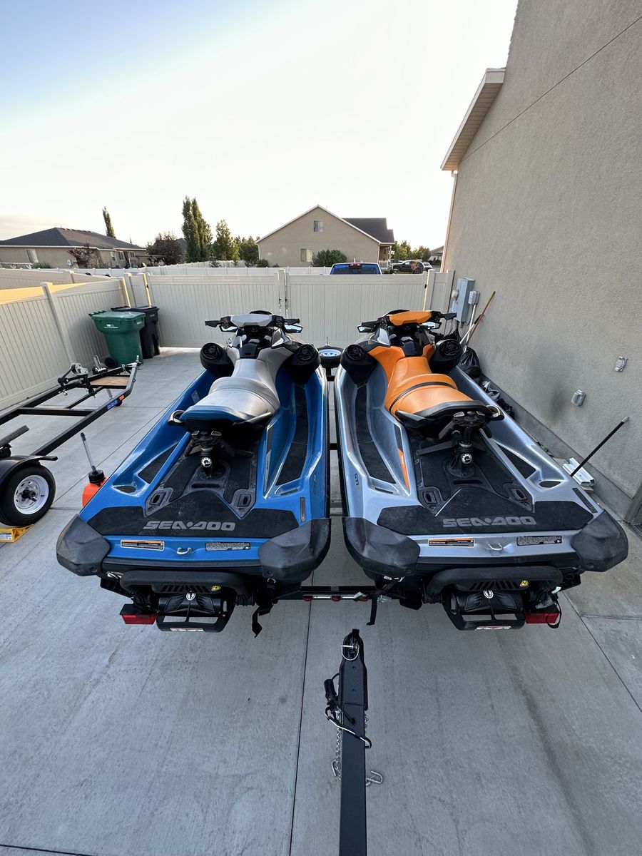 Pair of 2020 GTI SE, both machines are three seaters, with bluetooth sound system, boarding step ladders to make it easy get on from the water, Retractable Ski Pylon so you can tow your tubes with them, and anchors to tie them off the beach. Both machines comes with a cover Orange has 152.9 hours Blue has 193.5 hours Comes with a 2021 SeaDoo Move Il trailer.