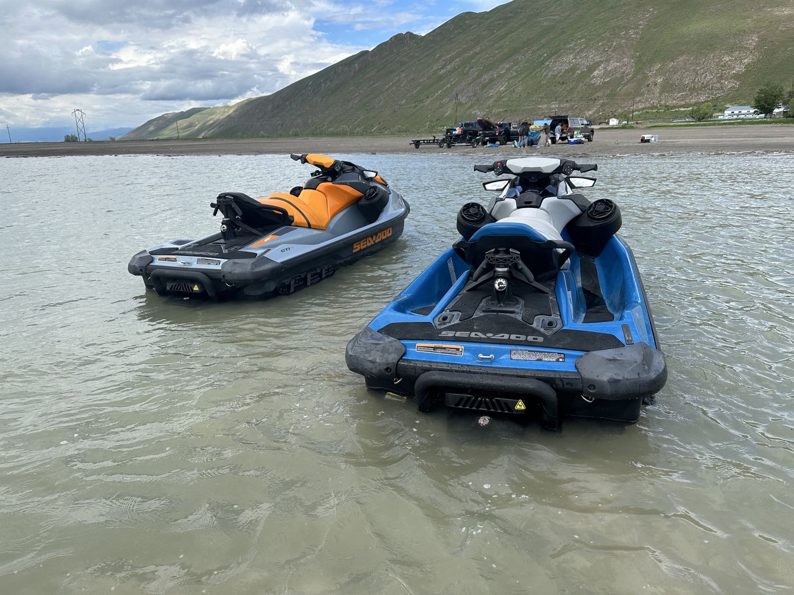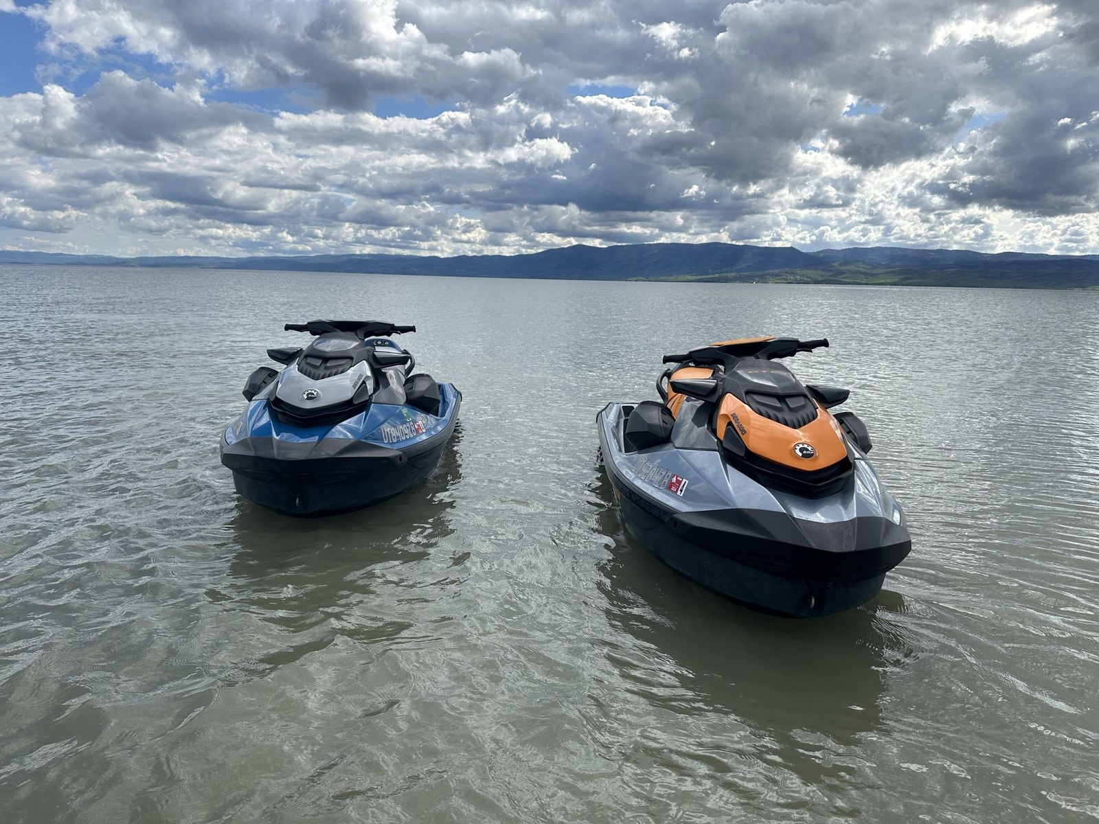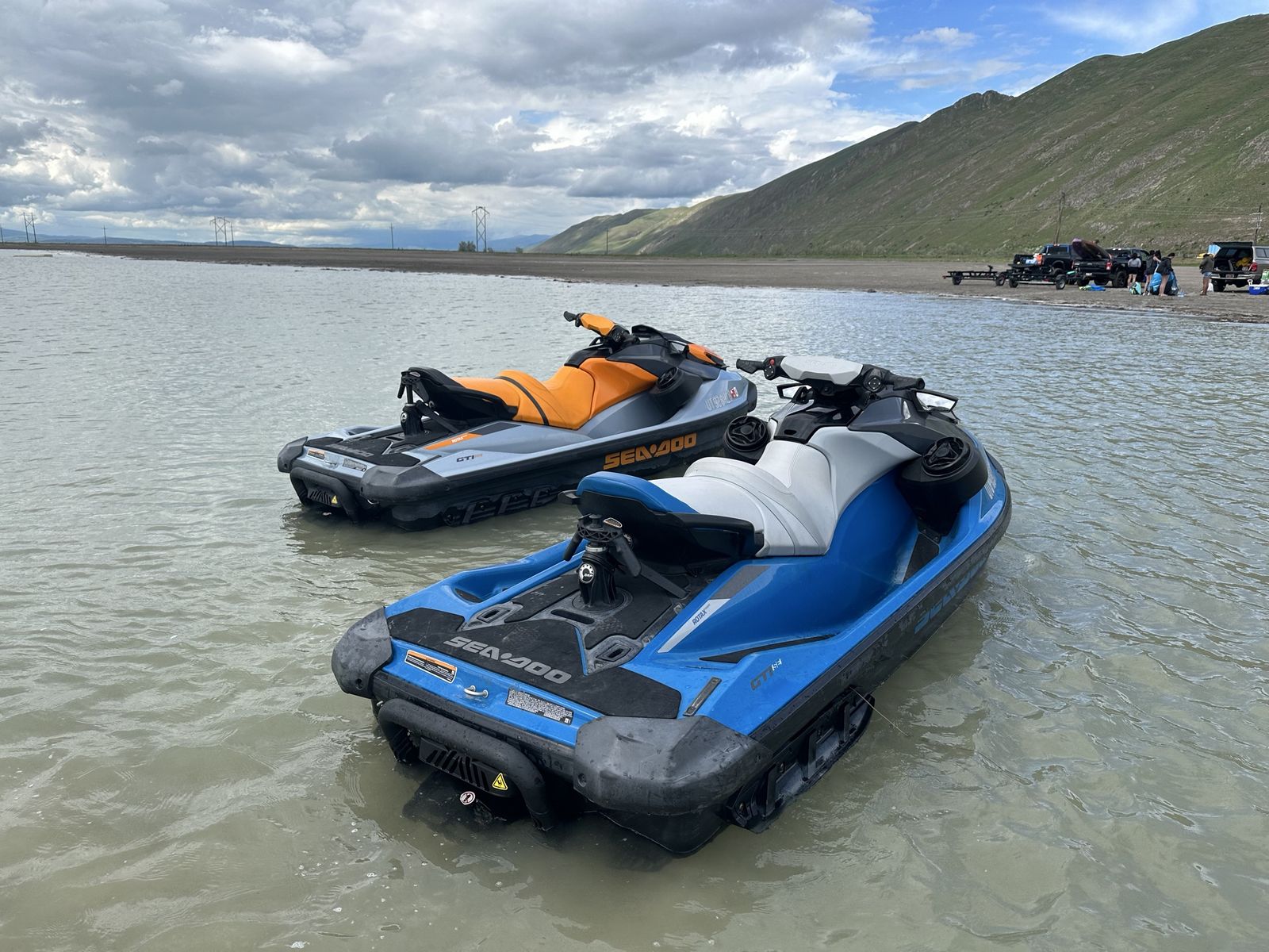 Pair of 2020 GTI SE, both machines are three seaters, with bluetooth sound system, boarding step ladders to make it easy get on from the water, Retractable Ski Pylon so you can tow your tubes with them, and anchors to tie them off the beach. Both machines comes with a cover Orange has 152.9 hours Blue has 193.5 hours Comes with a 2021 SeaDoo Move Il trailer.