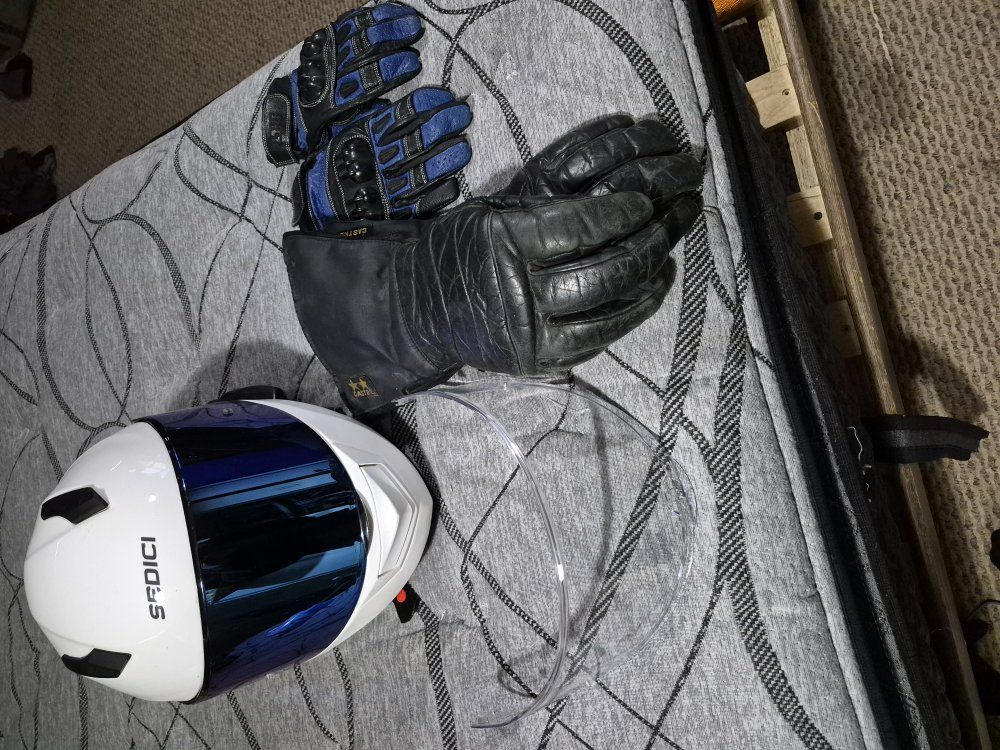 CashAppSelling my riding gear have a Sedici strada 2 helmet like new condition with blue tinted visor and a clear visor also has the flip down black tinted visior built inside and has the sena comms and Bluetooth system on it can control music volume and skip songs also has the pass through sound so if your talking to someone next to you, you can hear them better the call quality and mic sound is amazing size is medium,and have the storage bag it came with