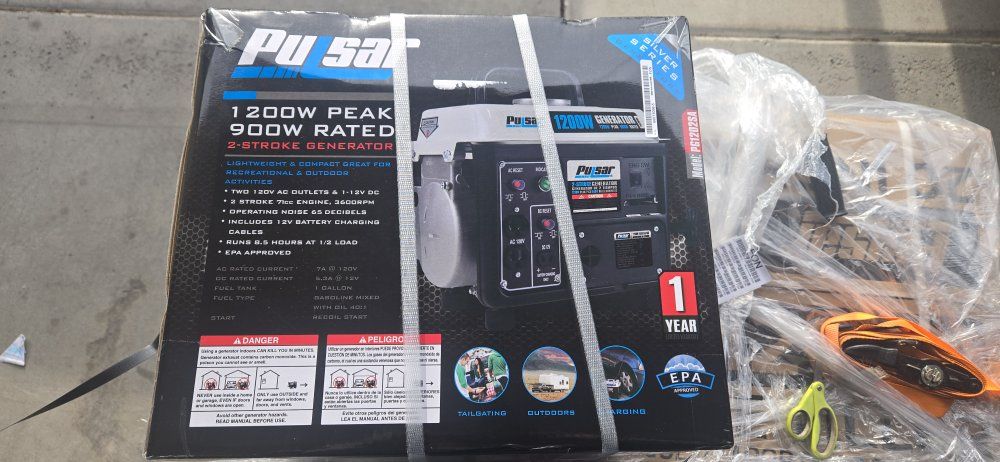PayPalPeak Power Output: 1200 peak watts and 900 running watts for light-duty use. Portable Design: Weighs just 35 lbs with a built-in handle. Easy to carry and transport. Reliable Engine: 69cc, 2HP air-cooled 2-stroke engine offers consistent performance. Fuel Efficiency: 1.1-gallon tank provides up to 5 hours of runtime at 50% load. Simple Start-Up: Recoil start system for quick and easy operation. Versatile Outlets: Two 120V AC outlets and one 12V DC outlet with included cable for battery charging. Low Maintenance: Uses a 30:1 gas-to-oil mix. No complicated maintenance or oil changes.