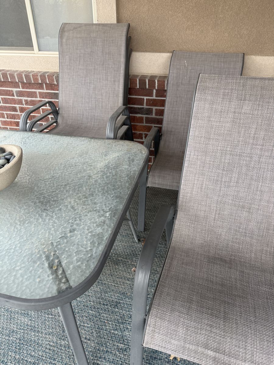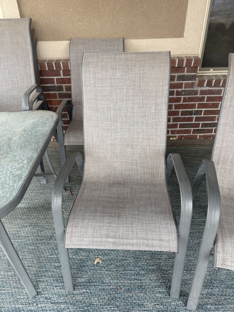 Selling a beautiful outdoor dining set featuring a sturdy glass-top table and six matching chairs.