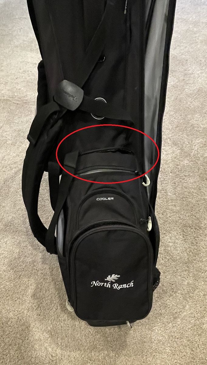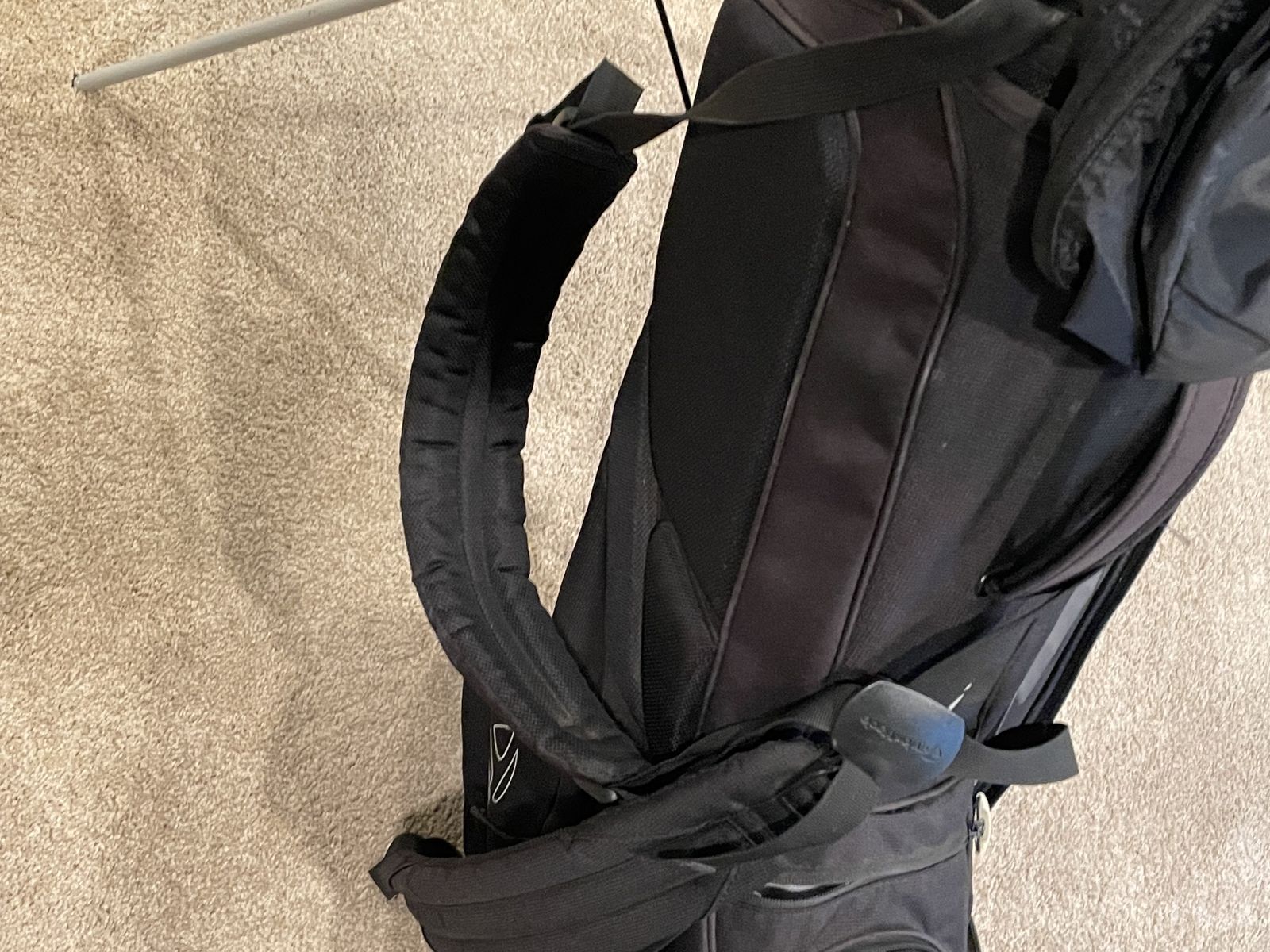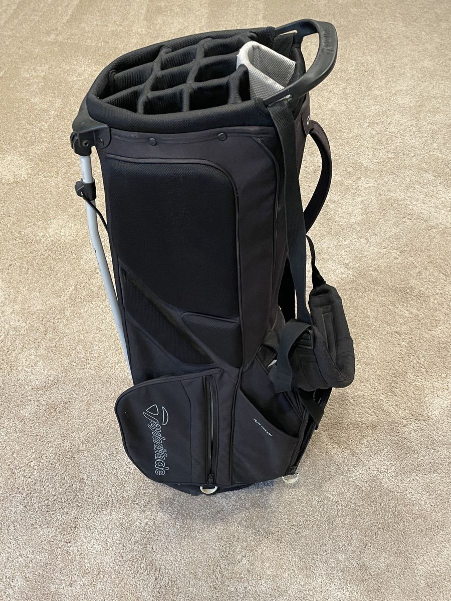 Black Taylormade bag. Everything works fine and it has the rain cover. It does have a logo on the ball cover. Overall it is in good shape, however, a seam separated above the storage area (last two pictures). You can reach both sides so it can probably be repaired/stitched fairly easily if you have those skills - I'm just not that handy so probably not an option for me. - opting to put on KSL for a week or two before looking into repairing it. $100 OBO