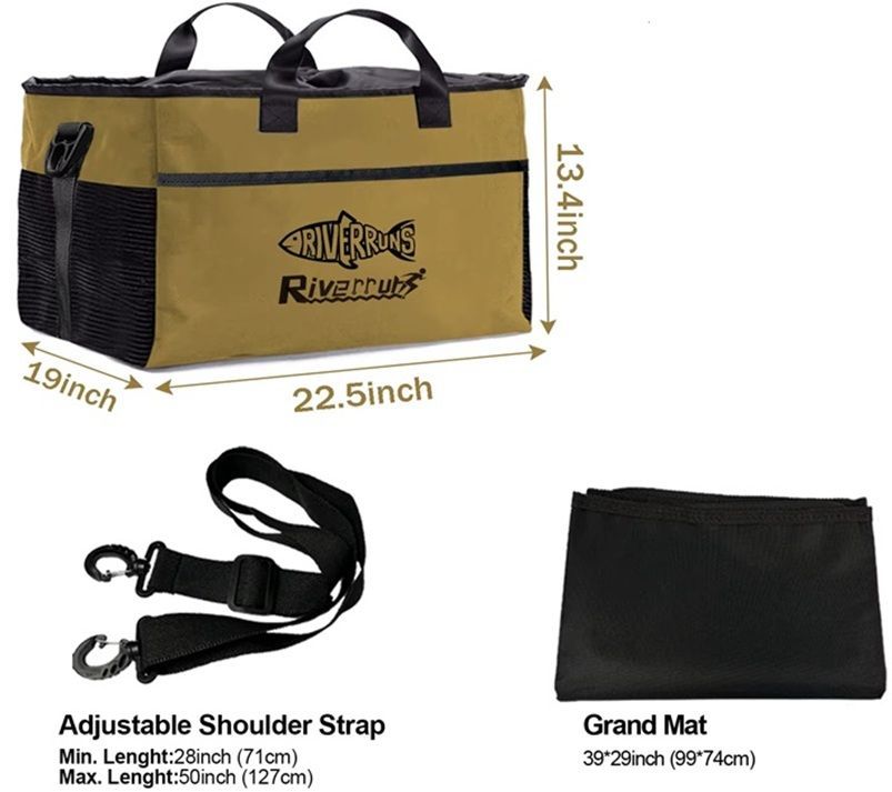 Made from 1000D high-density nylon fabricInner fabric lined with PU waterproof coatingSmooth, heavy-duty zipperThick stitched seams and sturdy nylon carry handlesDesigned to perform in wet and harsh environmentsSmart, Functional DesignBreathable mesh panels plus four eyelets promote airflow (helps wet gear dry and reduces moisture buildup)Drawcord top closure allows the bag to fully close when loaded with waders or bootsZippered exterior pocket for small essentialsIncludes a changing mat so you can stand on a clean surface when changing