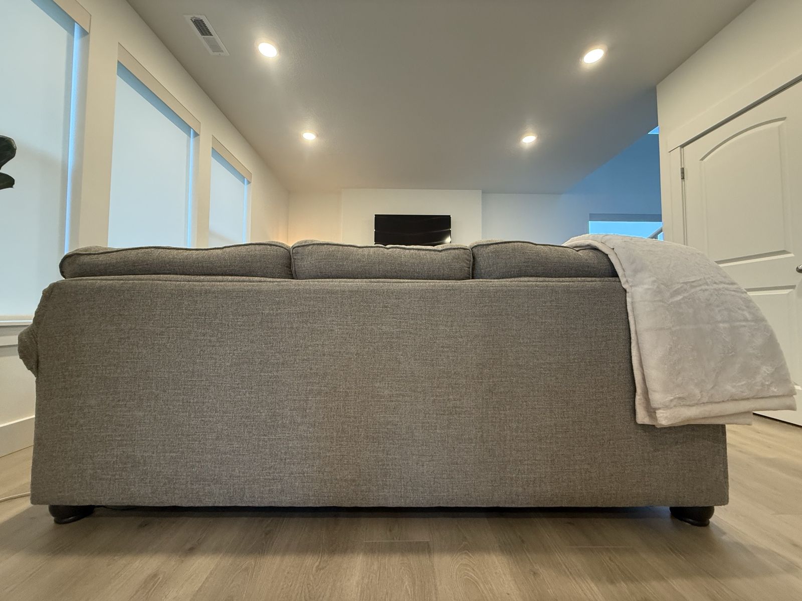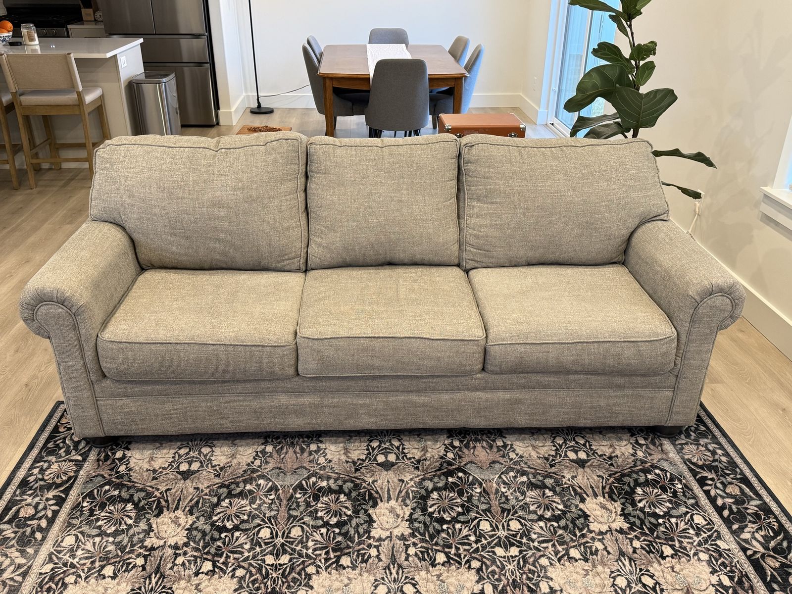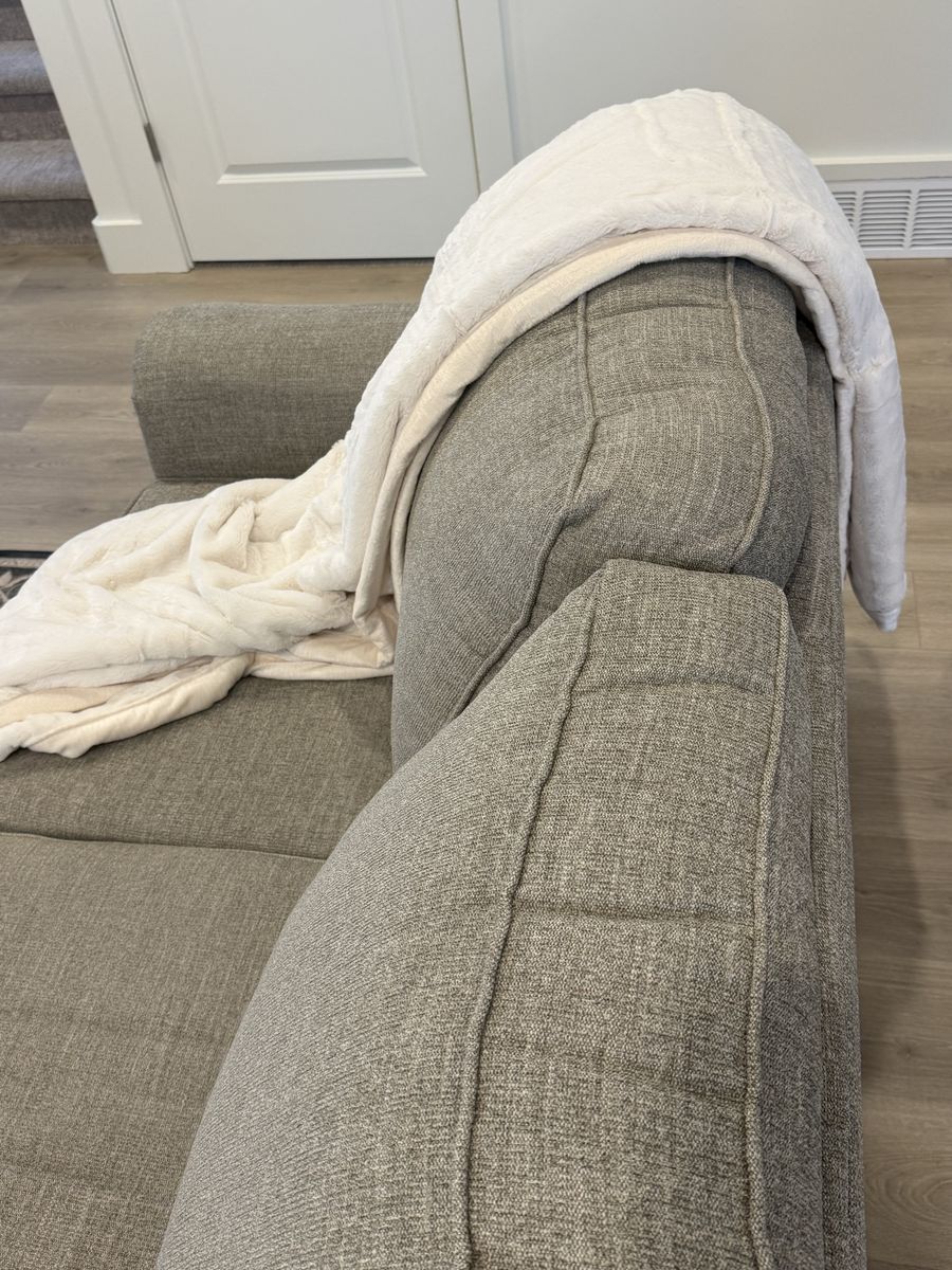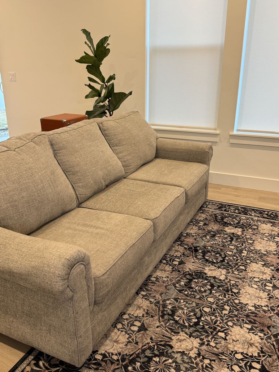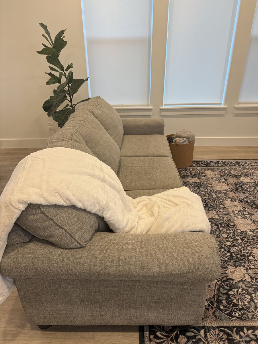 Like new, comfortable 3-seat fabric sofa purchased new from RC Willey. Light heather gray color matches most décor styles. Cushions are supportive and in perfect condition. No stains, rips, or odors. From a clean, smoke-free, pet-free home. Looks and feels like it's brand new!