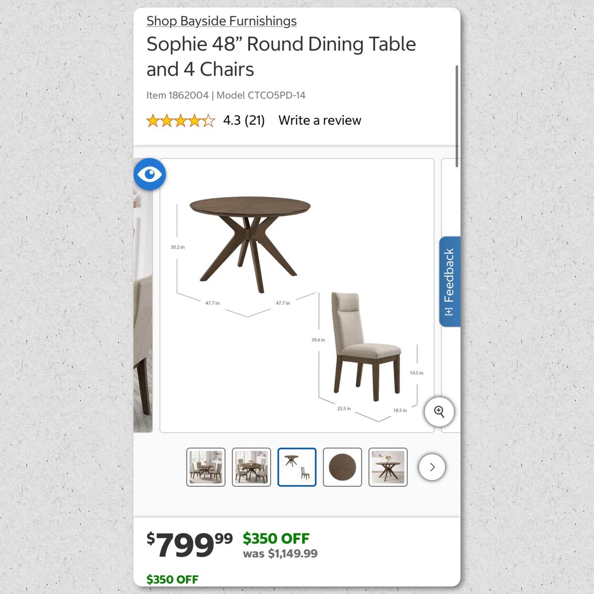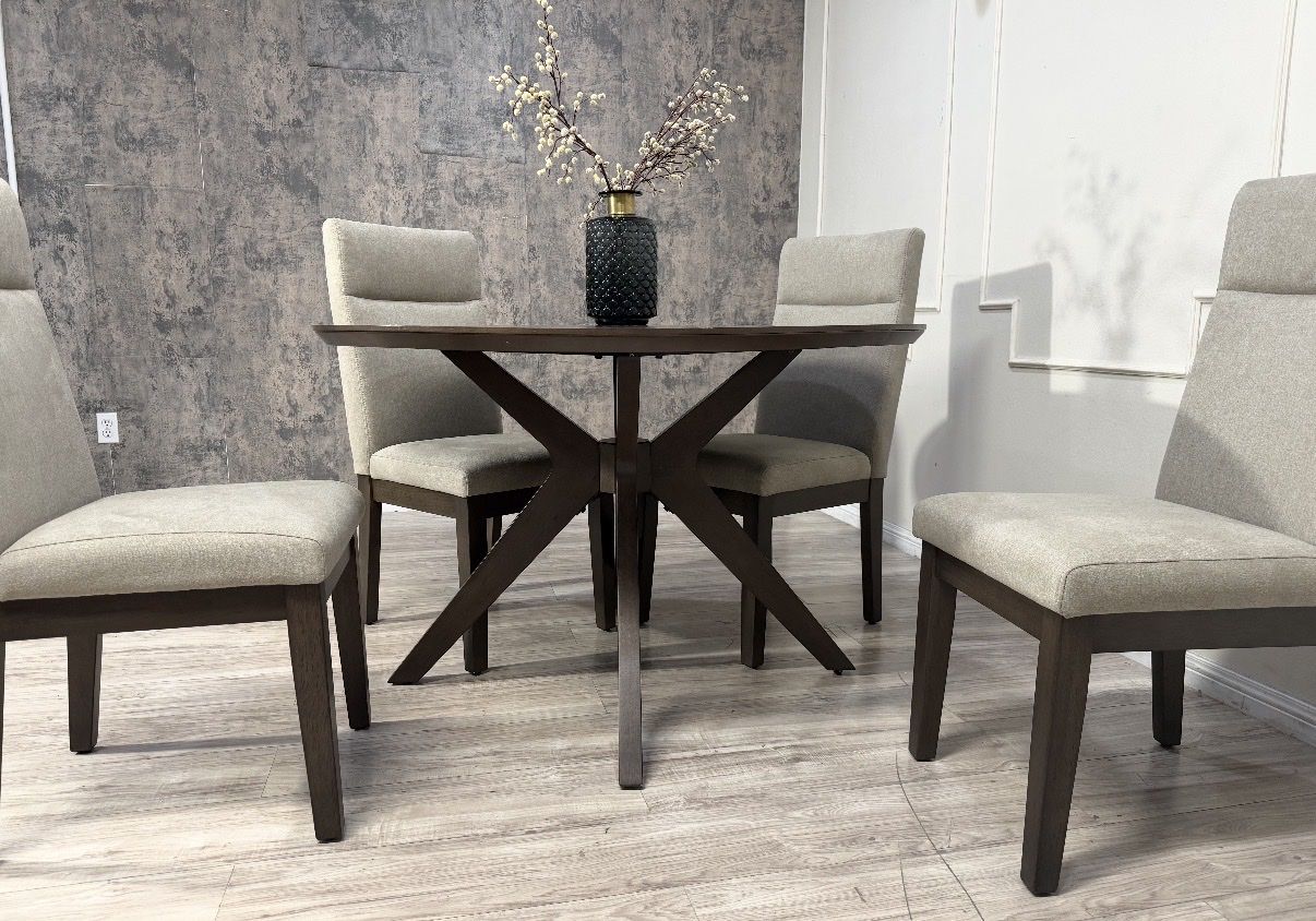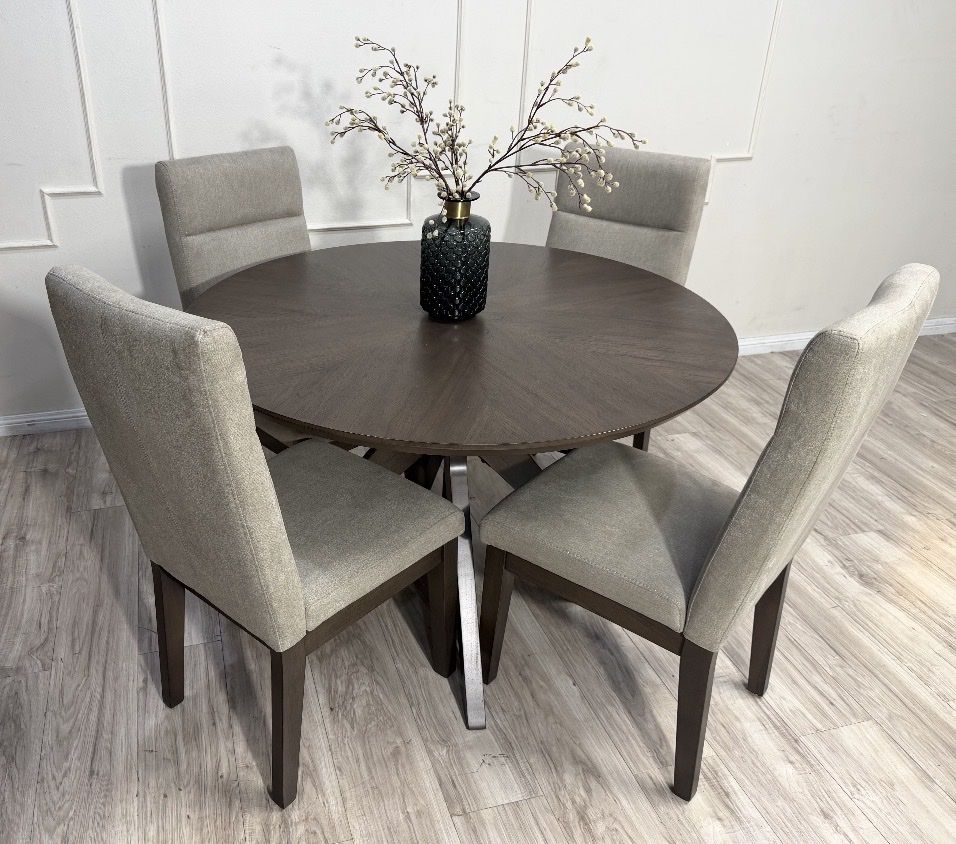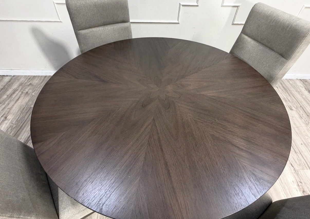 The Sophie 5-Piece Dining Set brings a hint of elegance and a whole lot of comfort. A modernized retro star base table with solid rubberwood construction and starburst patterned walnut veneers provide a focal point to any space. Four complementing fully upholstered fabric chairs with plush backrests set the stage for good food and great conversation.