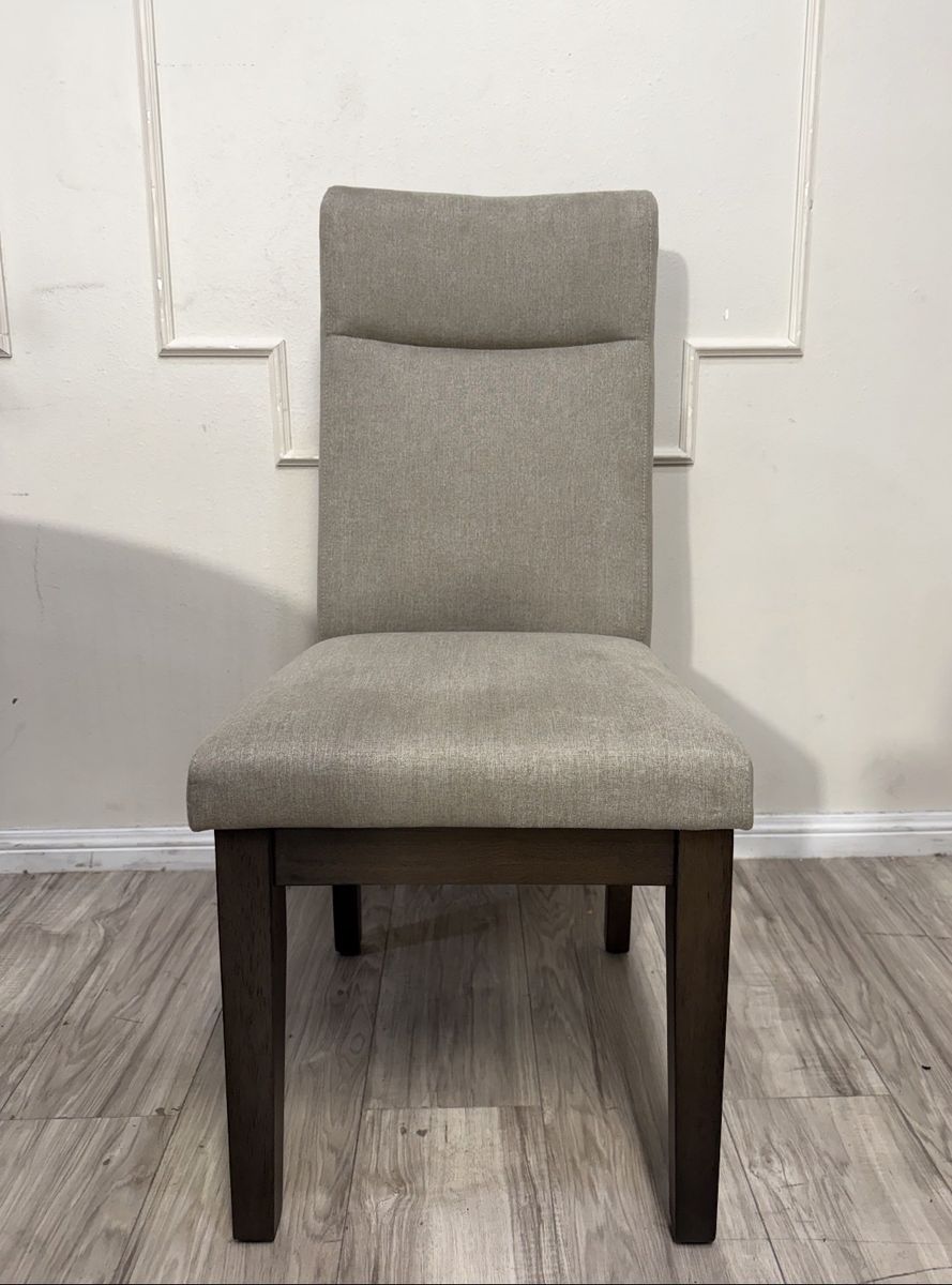 Constructed from Rubberwood Solids with Walnut Veneers Chairs Upholstered in a Gray Fabric Hand-Applied, Multi-Step Finish Protective Floor Glides on Chairs