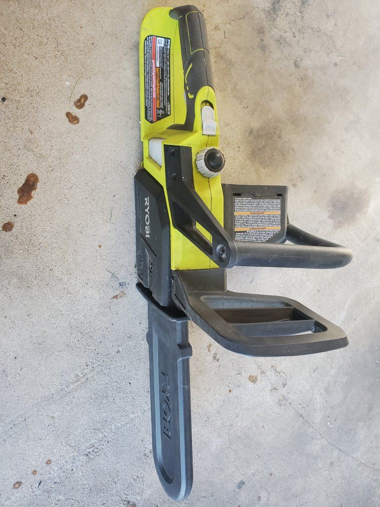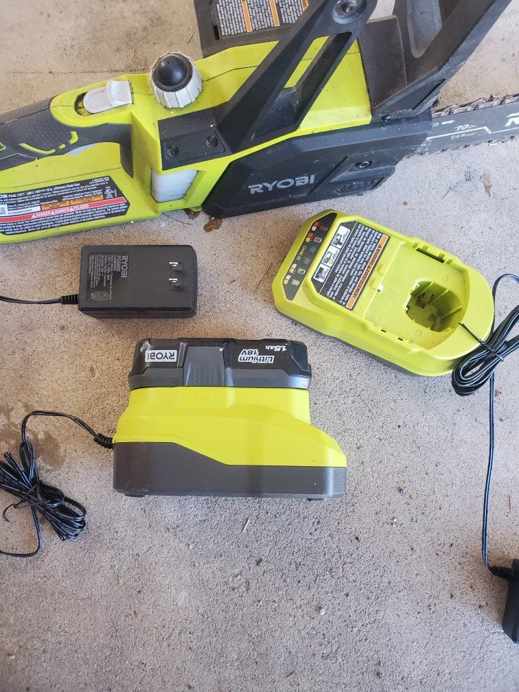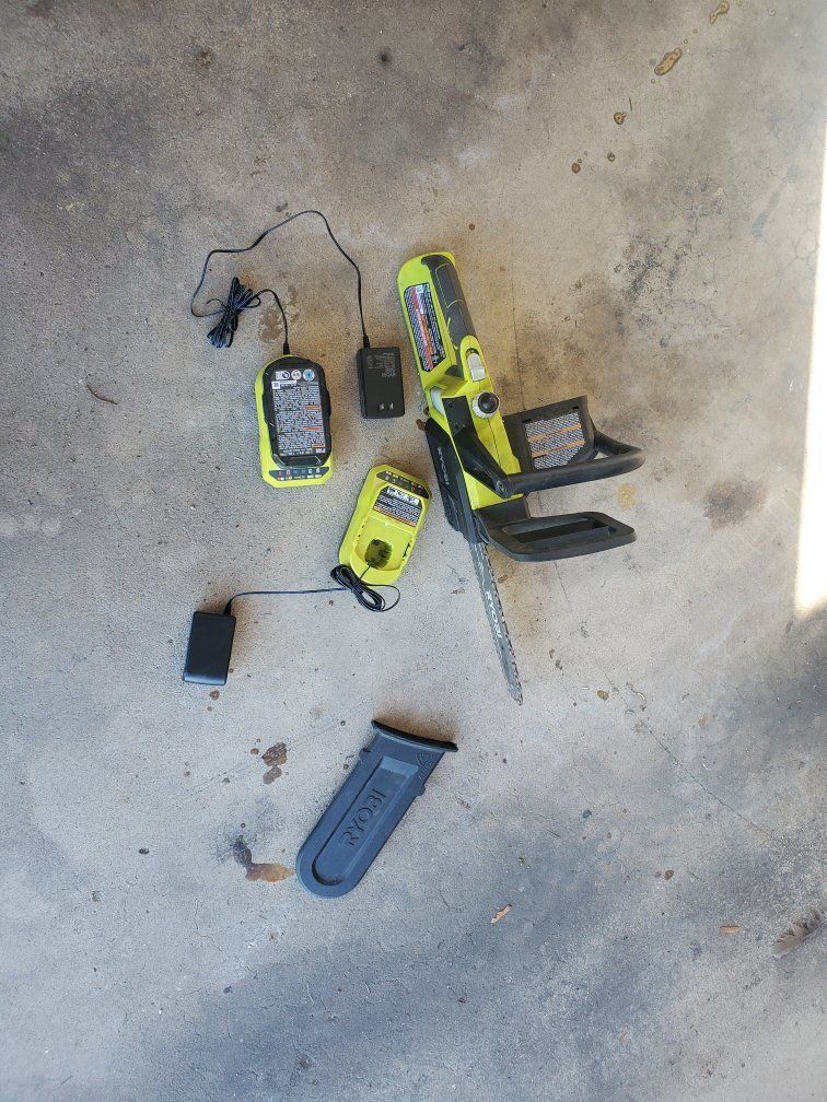used 18 volt ryobi chain saw. has original chain, comes with one charger 1 battery. everything works. lubricated chain everytime I used it. I used the ryobi bar and chain lubricant only in it. brand new cost around 200 with charger and battery