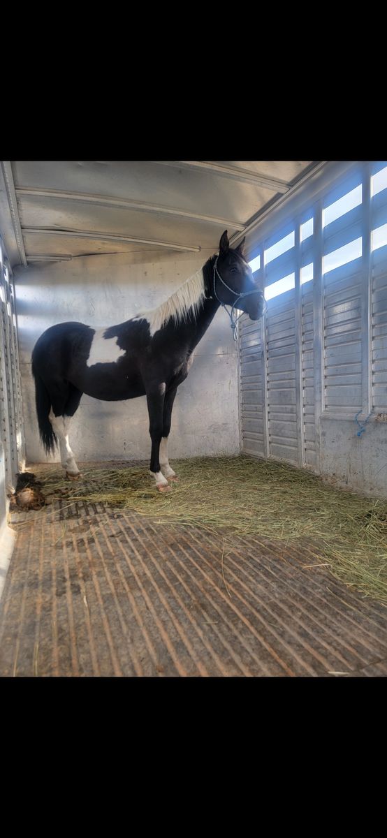 Gelded colt, coming 2 in May. Straight legs, leads, loads, ties, ponies. Has had feet trimmed several times, but still working on him standing nicely for it. Calm personality overall once that halter is on. He has been saddled without moving an inch. Without halter on, he has some toddler colt spice to him. Should fill out into a gorgeous boy. Had his shots at the vet when he was gelded recently. Should be around 14.3h when mature.