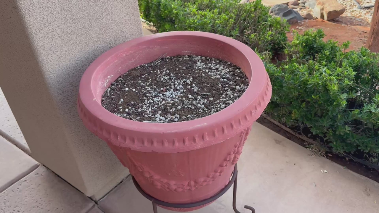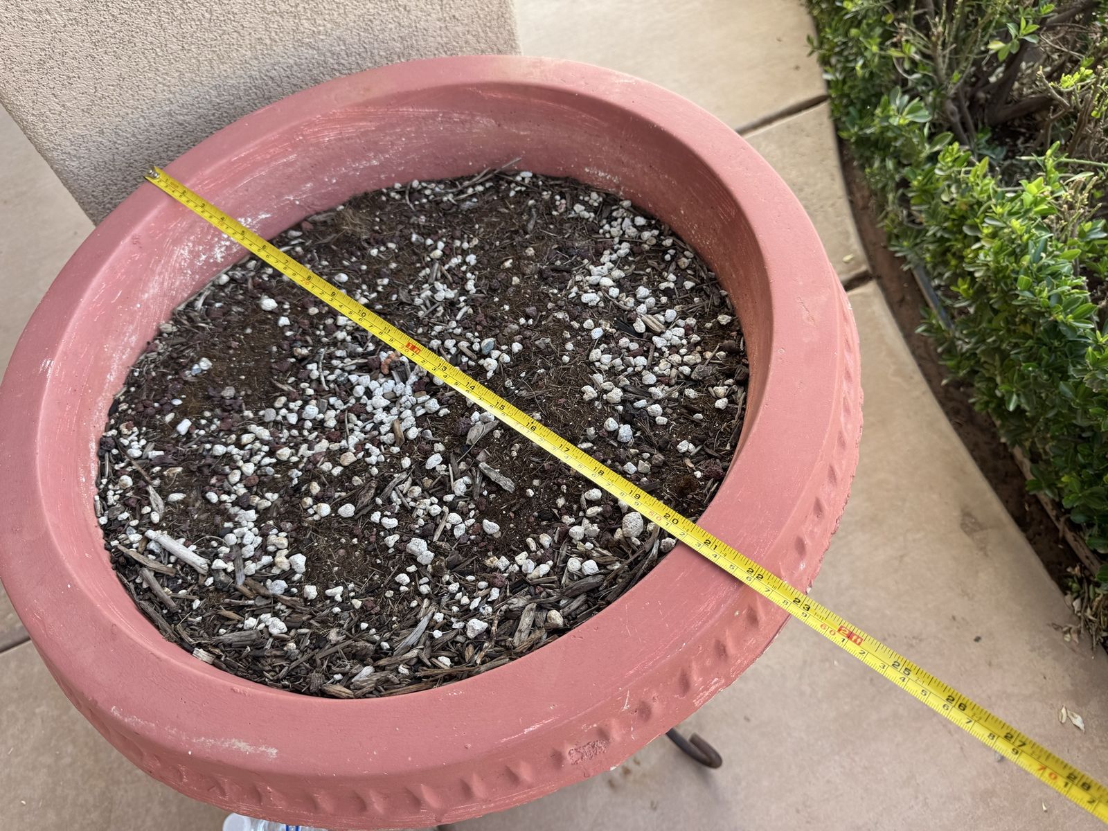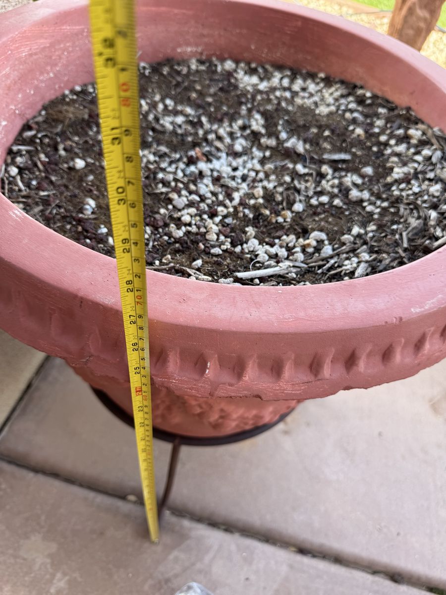 Beautiful terra cotta planter with decorative detailing, comes with a sturdy metal stand. Large size (see water bottle for scale)—perfect for a patio or entry statement piece.