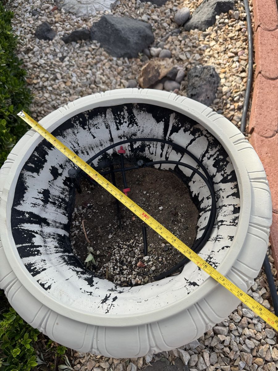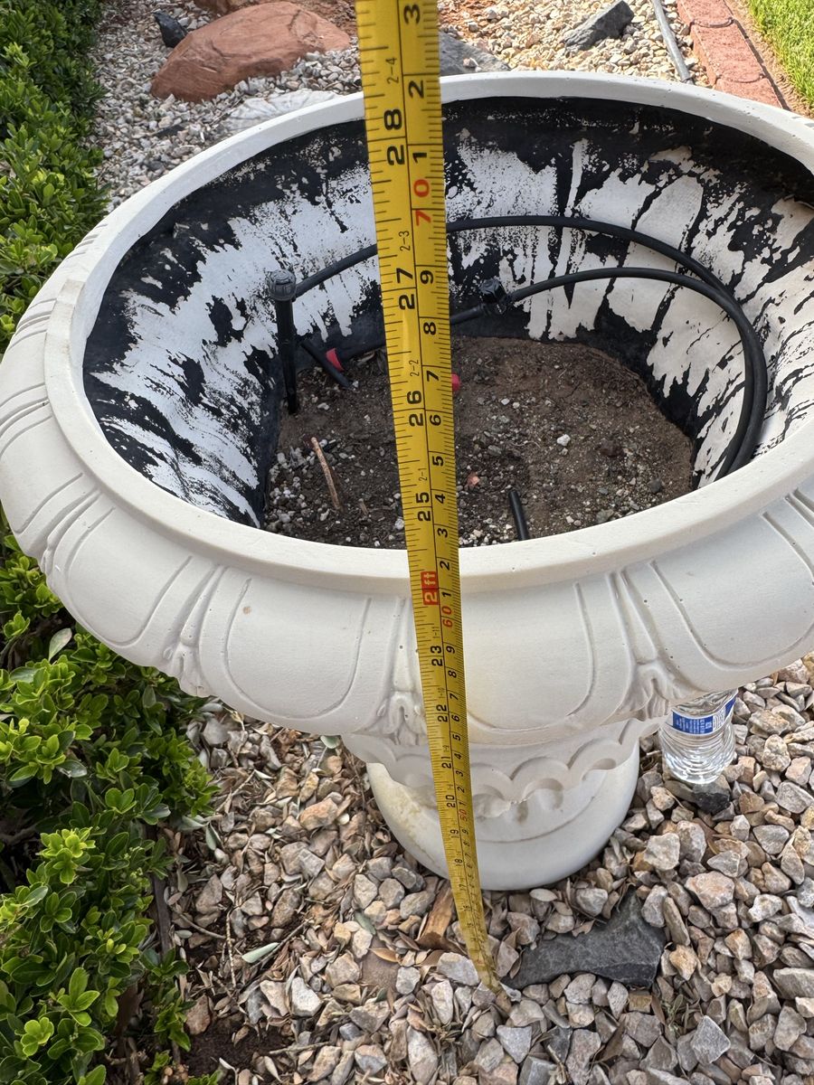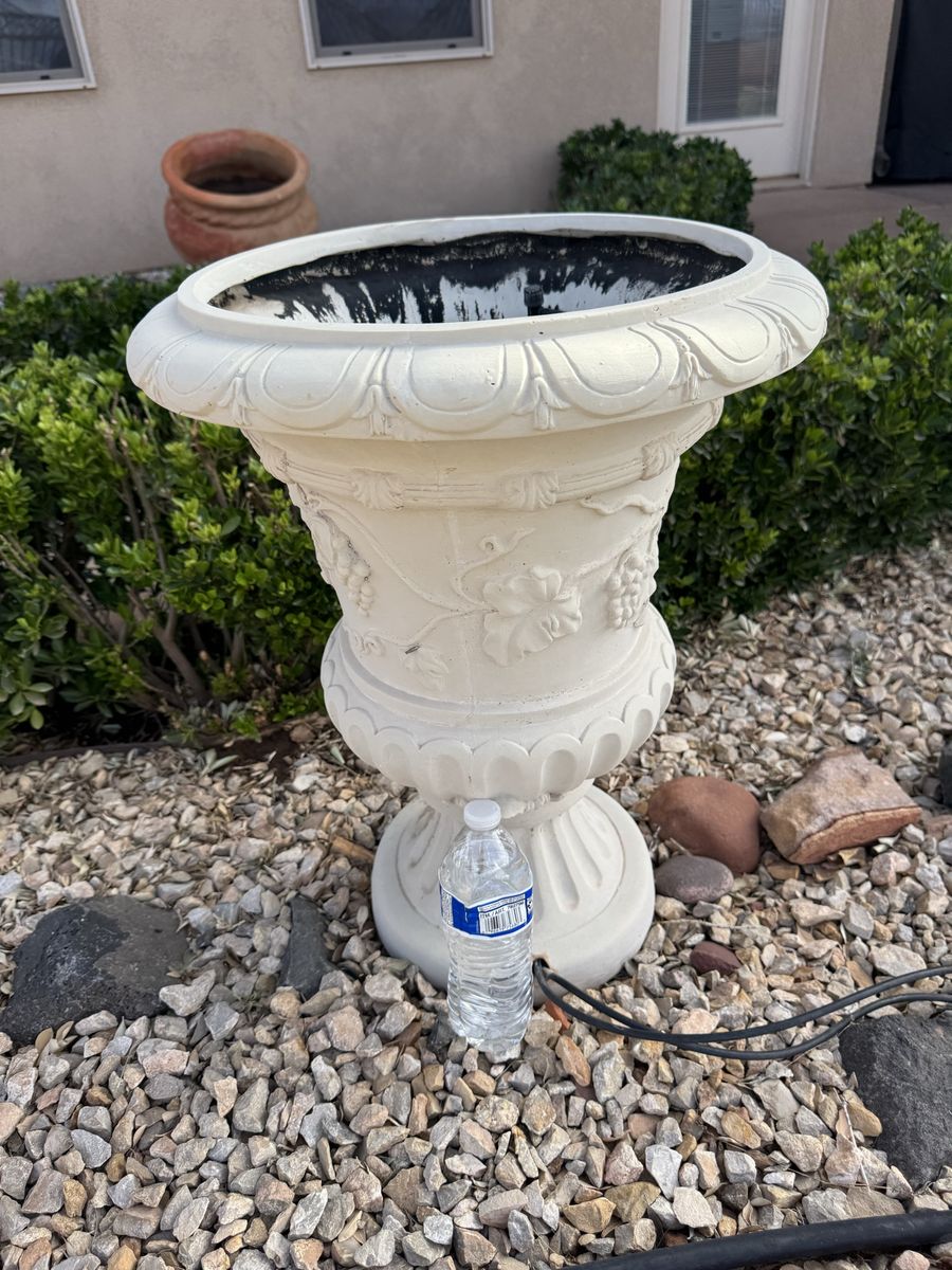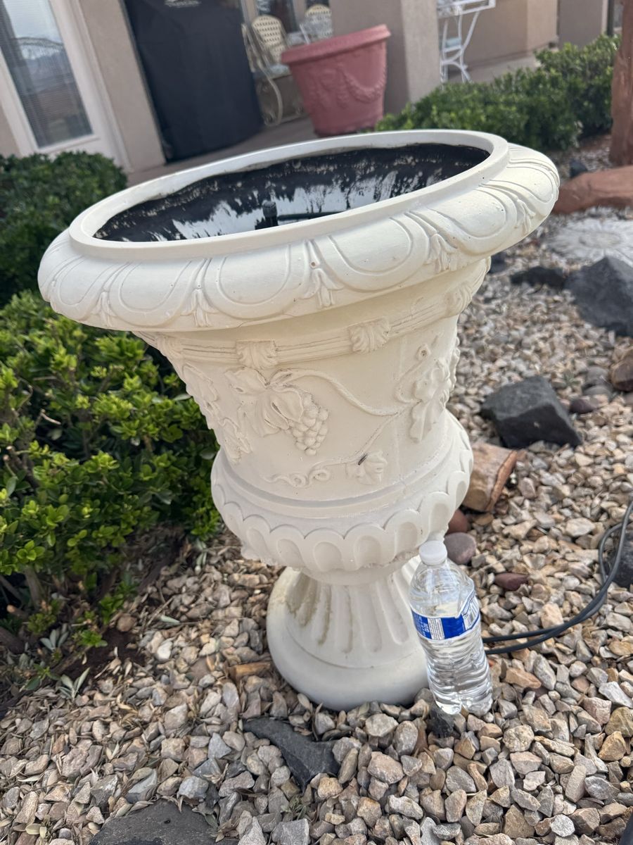 Beautiful concrete planter with decorative features. Large size (see pics for measurements and water bottle for scale)—perfect for a patio or entry statement piece.