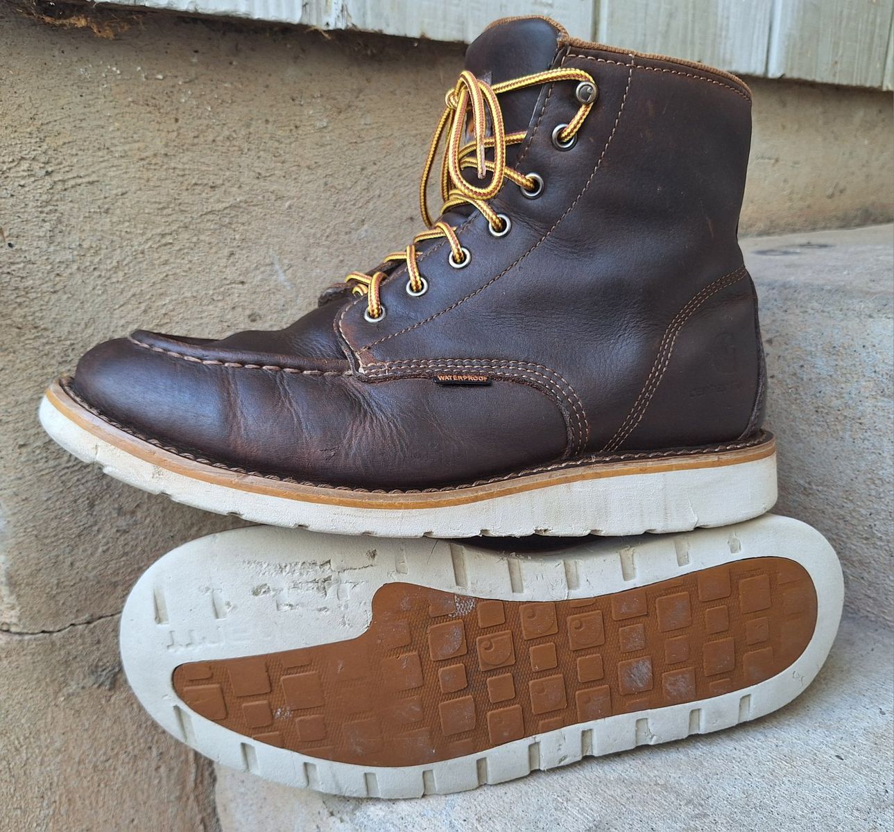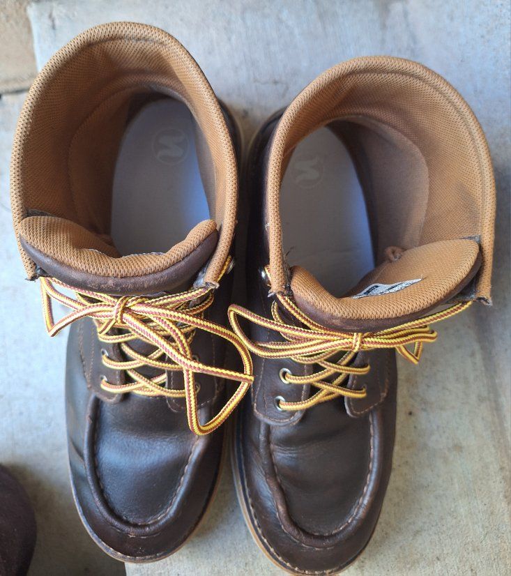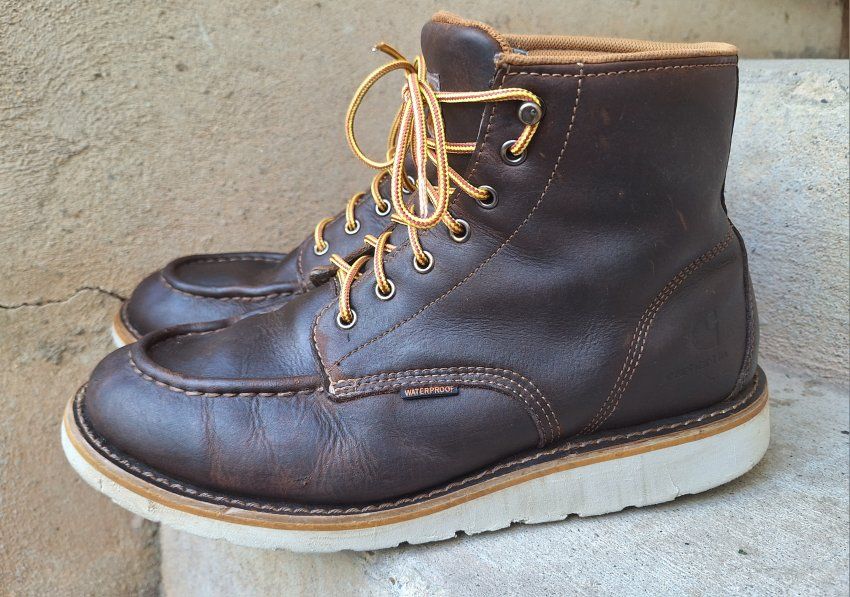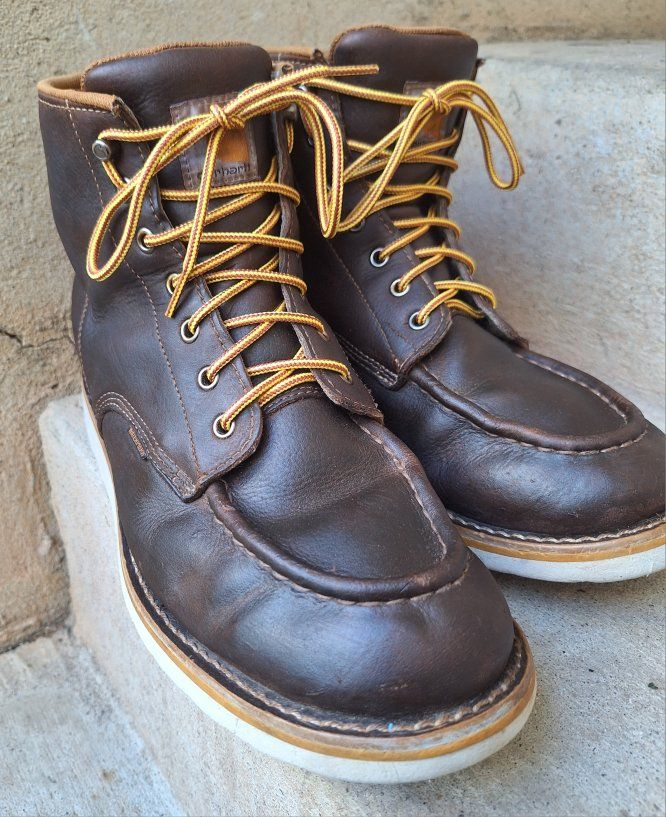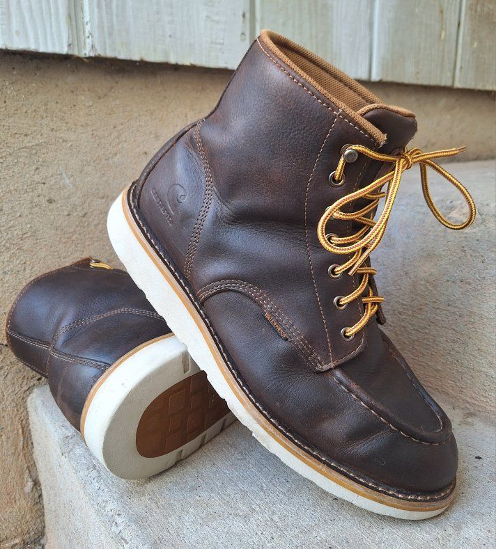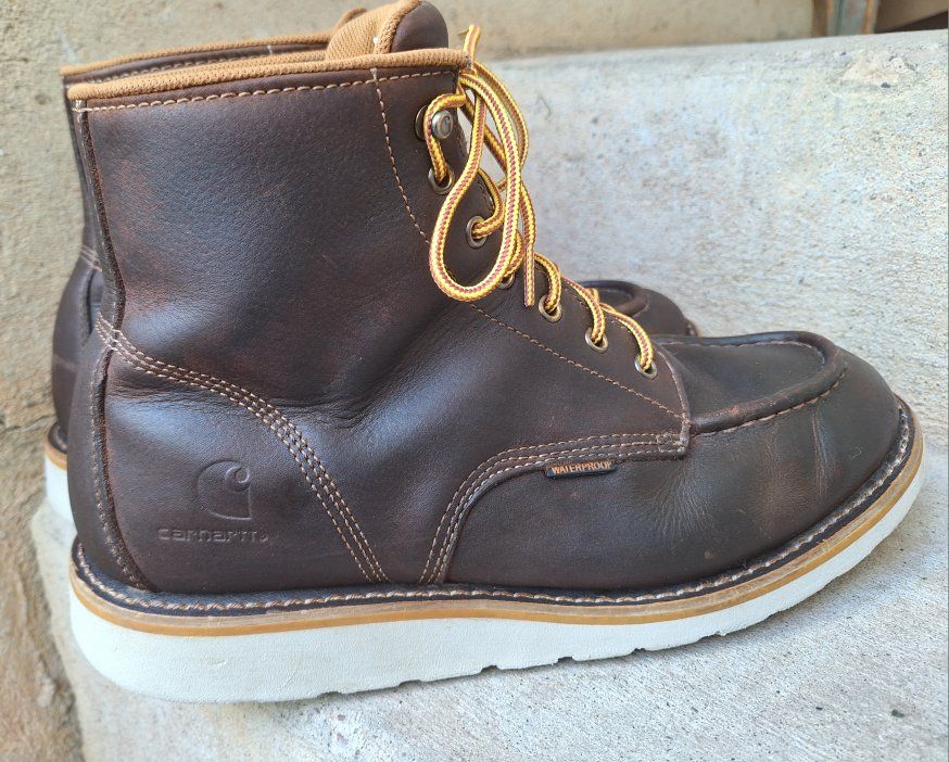 CashAppNice pair of Men's Carhartt waterproof brown leather moc toe work boots in US size 11. The boots have a round toe, ankle shaft style, lace-up closure, and rubber outsole for durability. With a solid brown color these boots are designed for workwear and are suitable for all seasons. The quality and waterproof feature make them a reliable choice for men looking for sturdy and comfortable footwear. I just reconditioned these, put new laces, and new insoles in them. They're ready to go to work. Comes from a clean smoke and pet free environment. Please see photos for closer details, thanks for looking!