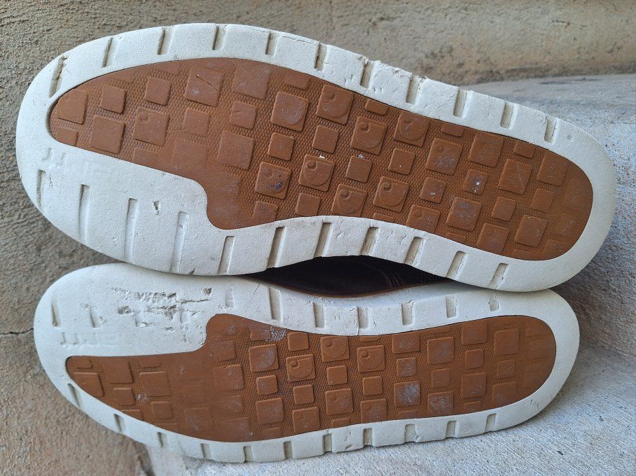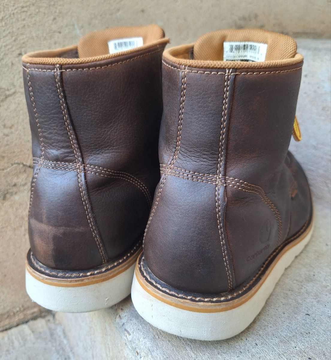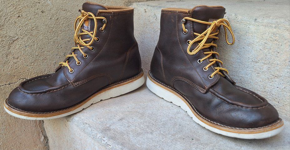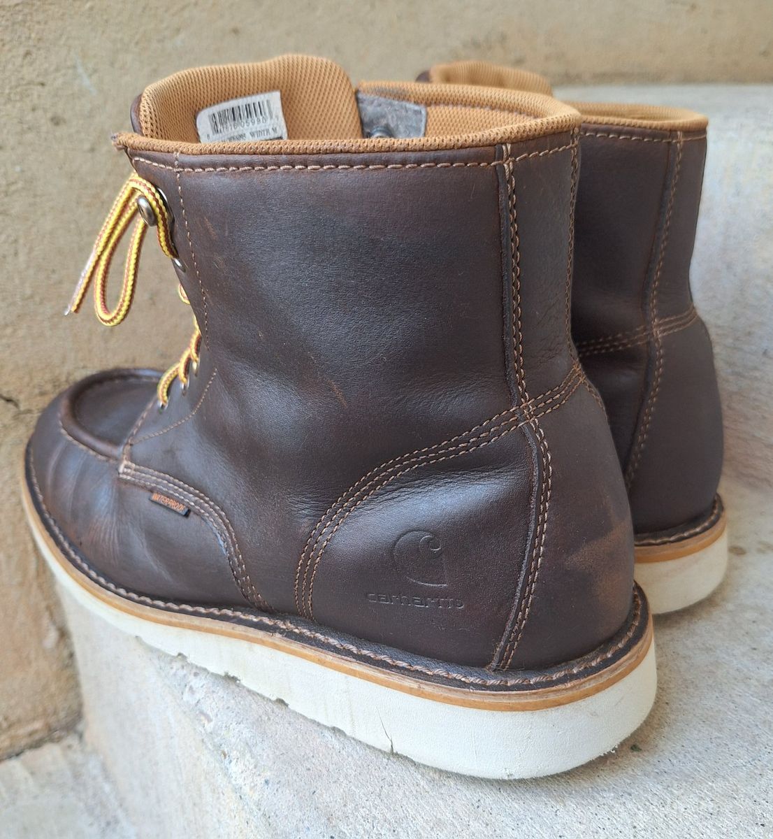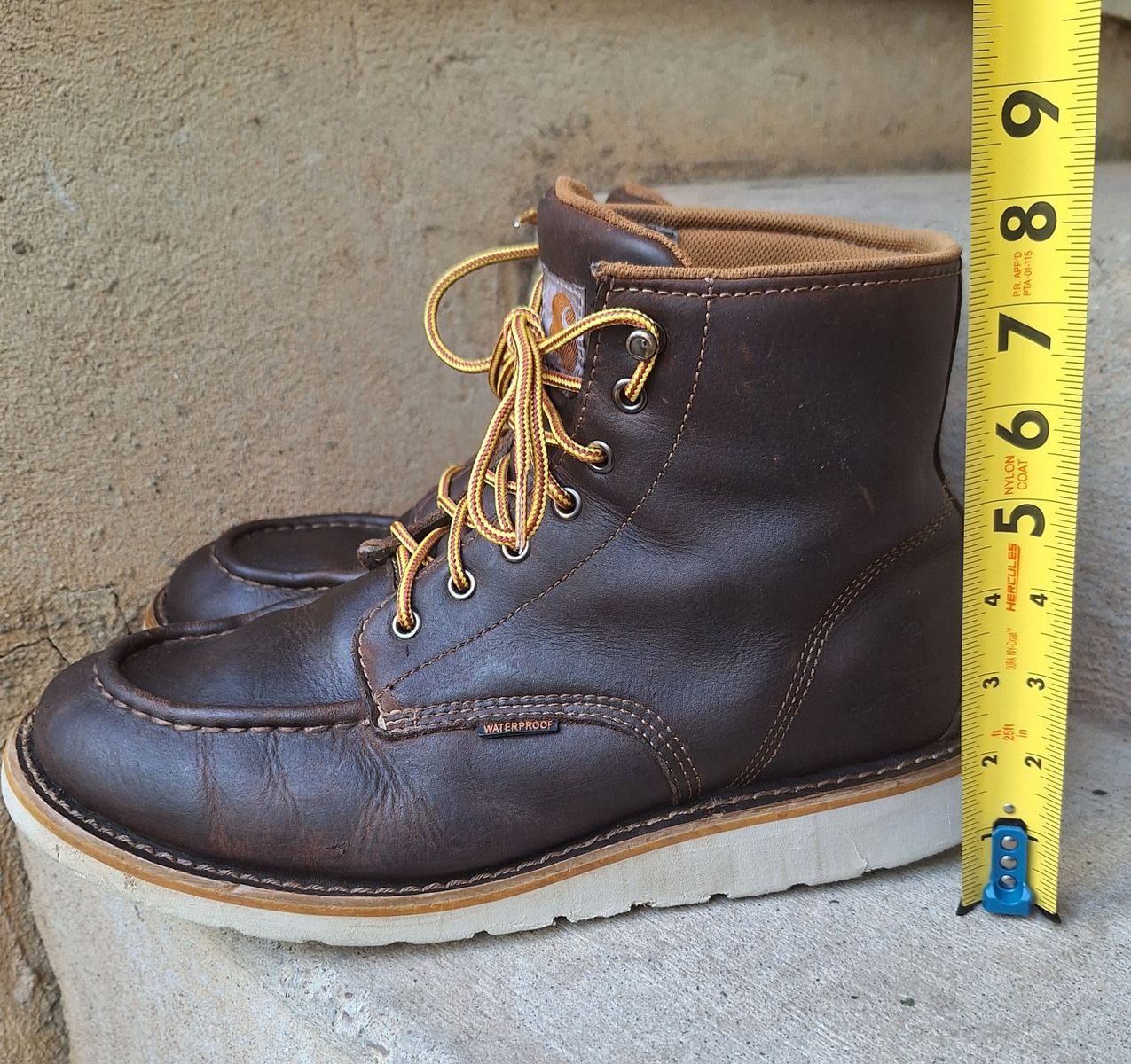 CashAppNice pair of Men's Carhartt waterproof brown leather moc toe work boots in US size 11. The boots have a round toe, ankle shaft style, lace-up closure, and rubber outsole for durability. With a solid brown color these boots are designed for workwear and are suitable for all seasons. The quality and waterproof feature make them a reliable choice for men looking for sturdy and comfortable footwear. I just reconditioned these, put new laces, and new insoles in them. They're ready to go to work. Comes from a clean smoke and pet free environment. Please see photos for closer details, thanks for looking!