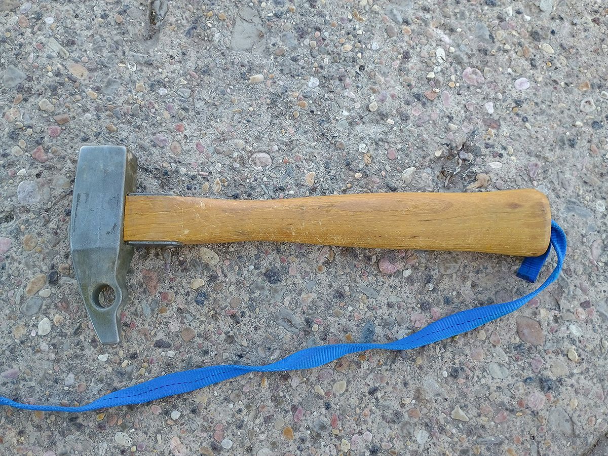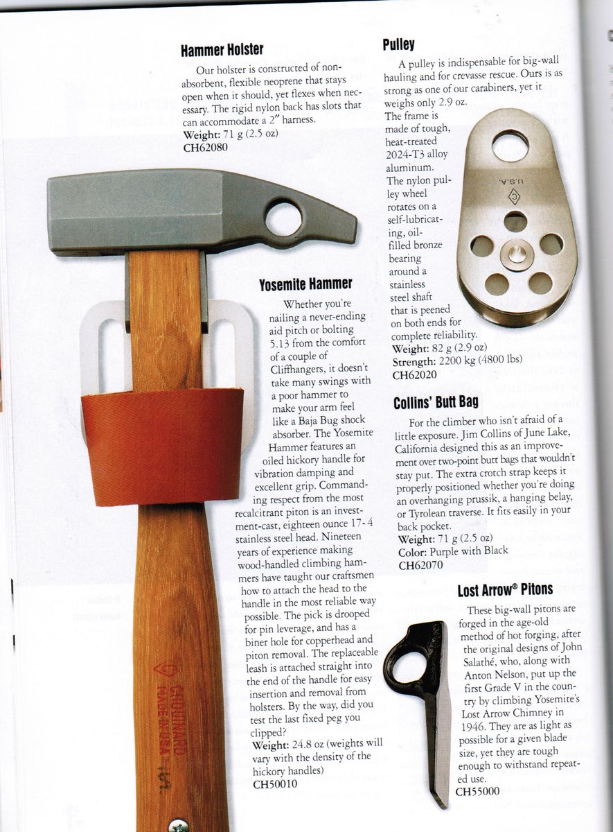 Likely 1990s vintage. Cast stainless steel head / pick with hickory handle. Carabiner hole in the head for piton removal. Replaceable webbing leash (blue) attached to the bottom of the handle tied to a second BD webbing loop (yellow).