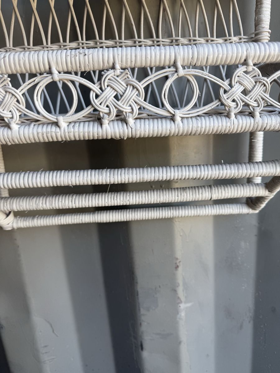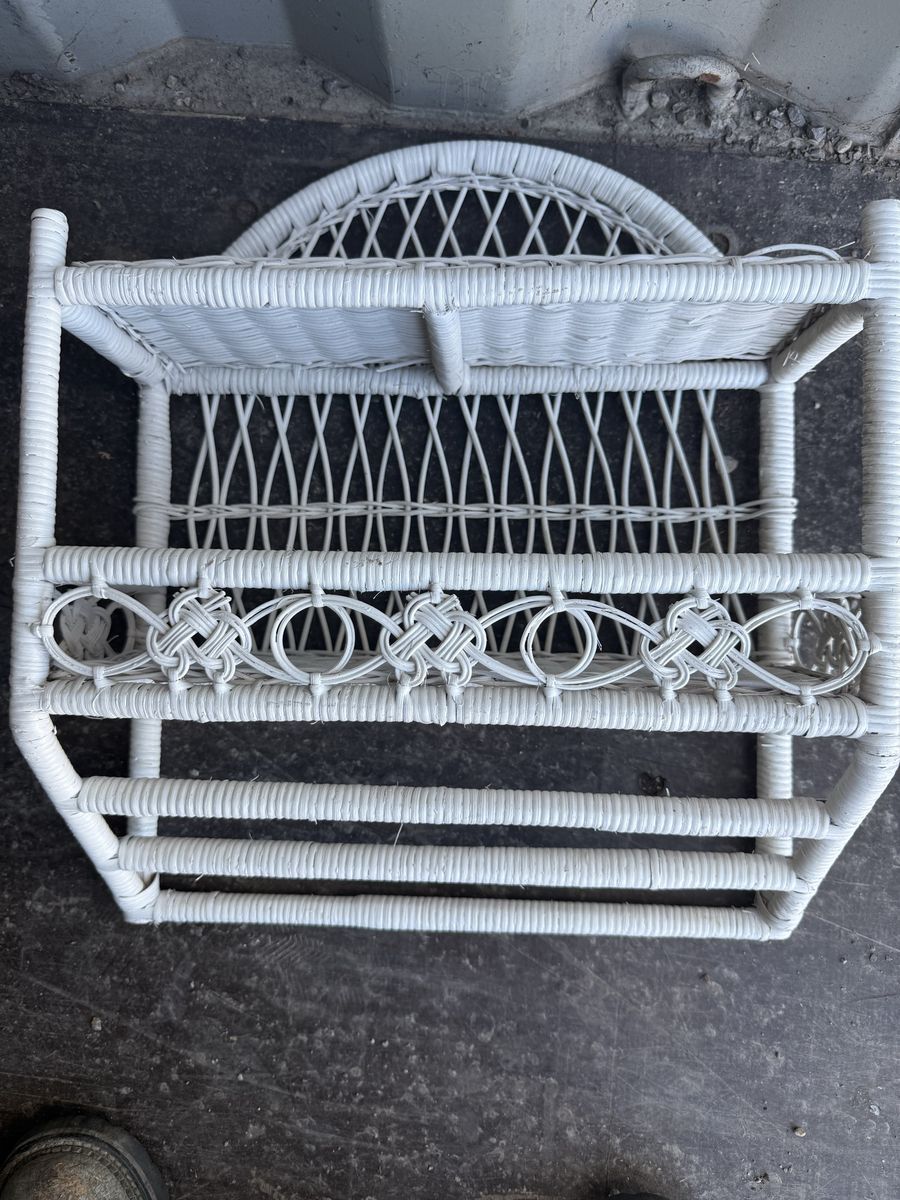 VenmoSmall wicker towel rack with three towel rods, and two shelves great for a country bathroom in great condition.