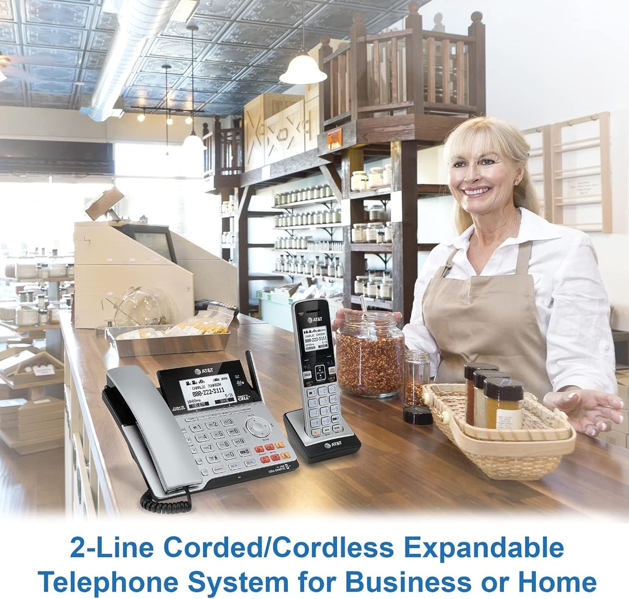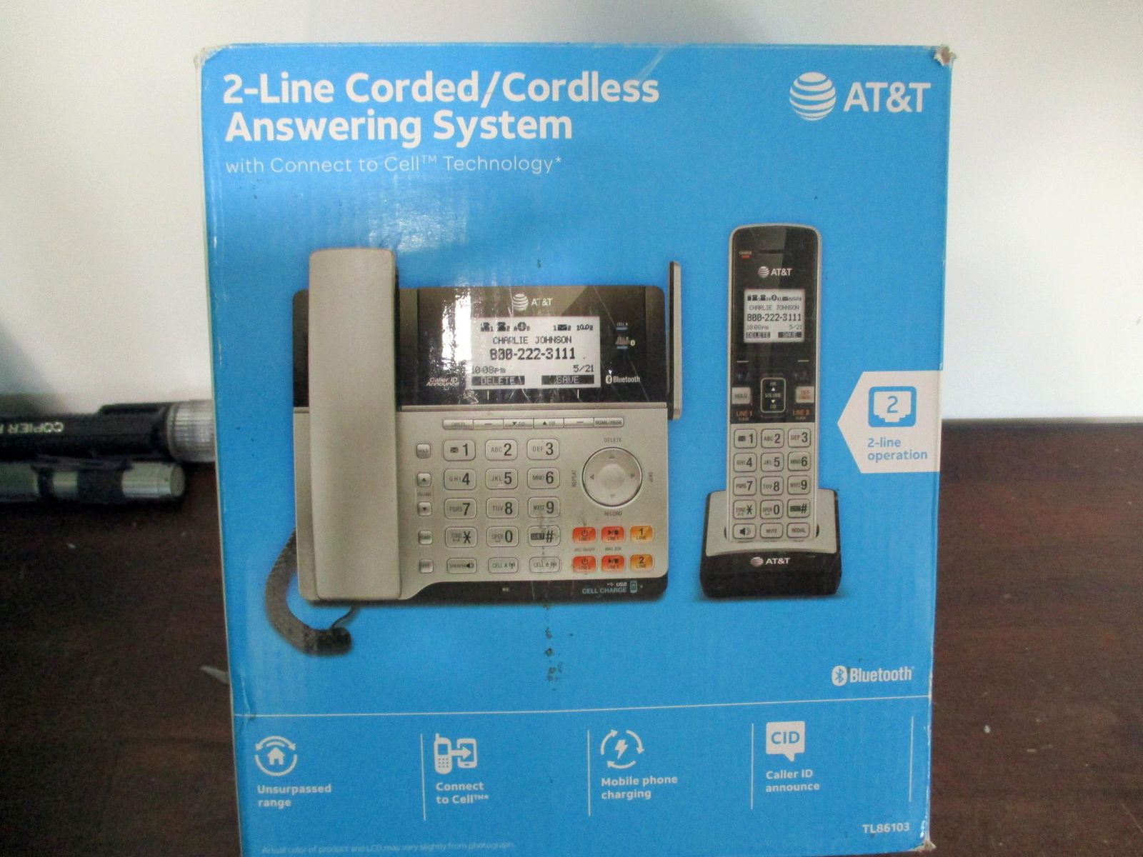 Model: TL86103 2-line phone 2 voice mail boxes with built in digital answering machine 3-way conference all ability bluetooth with "connect to cell" intercom between base and handset Expandable up to 12 portable handsets Caller ID Announcer Color: Silver/black 2 AAA batteries required. (included) Perfect Phone for Work from Home & Small Office - With up to 1,000 feet coverage and connects up to 2 cell phones and 2 landlines, this phone system lets you make and receive calls from your landline or cell phones with ease using either the cordless or corded handset. Connect-To-Cell - By connecting to your mobile phone with BLUETOOTH-enabled technology, this system allows you to make and receive calls from your cellular plan and landline while enjoying the comforts of a home phone system, with or without a landline. Download up to 6,000 cellular phonebook entries onto the cordless handsets. Digital Answering System with 2 Mailboxes - With up to 22 minutes of recording time in each mailbox, the digital answering system grabs calls when you can't and stores the messages in 2 separate mailboxes. Ideal to keep business and family messages separate. Reliable Corded/Cordless Design with line power mode - The corded base has fully equipped with a large backlit display, speakerphone, big buttons keypad for ease of use. The Line-power mode ensures communications using the corded handset during any power outage. Charge your cell phones - With 2 built-in USB ports on the base lets you charge two cell phones at the same time, all the while allowing you to use any of the phone system handsets to make or receive calls from anywhere in the home Cordless Handset equipped with thoughtful details facilitate you to work anywhere at home: Speakerphone; Belt clip; 2.5mm headset jack (headset not included); Push-to-talk button ship weight 4 lbs