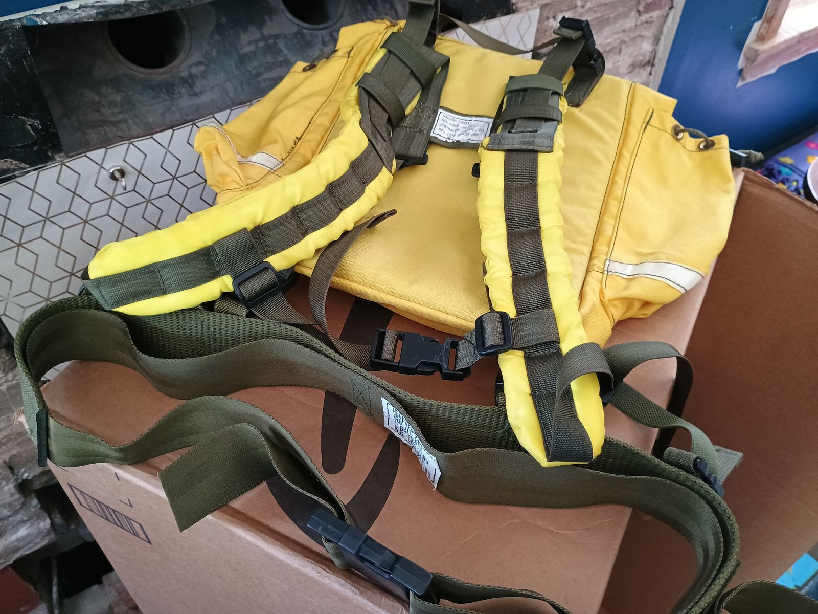 Good condition 1988 Forest Service yellow field pack with belt. Includes the main backpack, padded harness, and equipment belt.