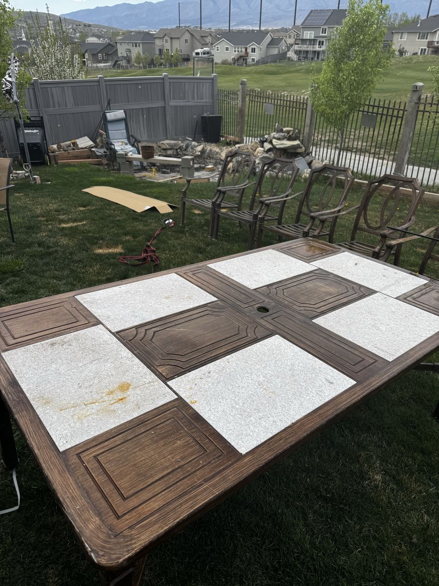 ApplePayStylish set of 6 metal patio chairs. Metal and granite slabs table dimensions are 76“ x 44“. Chairs have decorative oval design on backrests and slatted seats. Bronze-like finish shows some wear on armrests and seat slats. 2 are loungers. Need gone