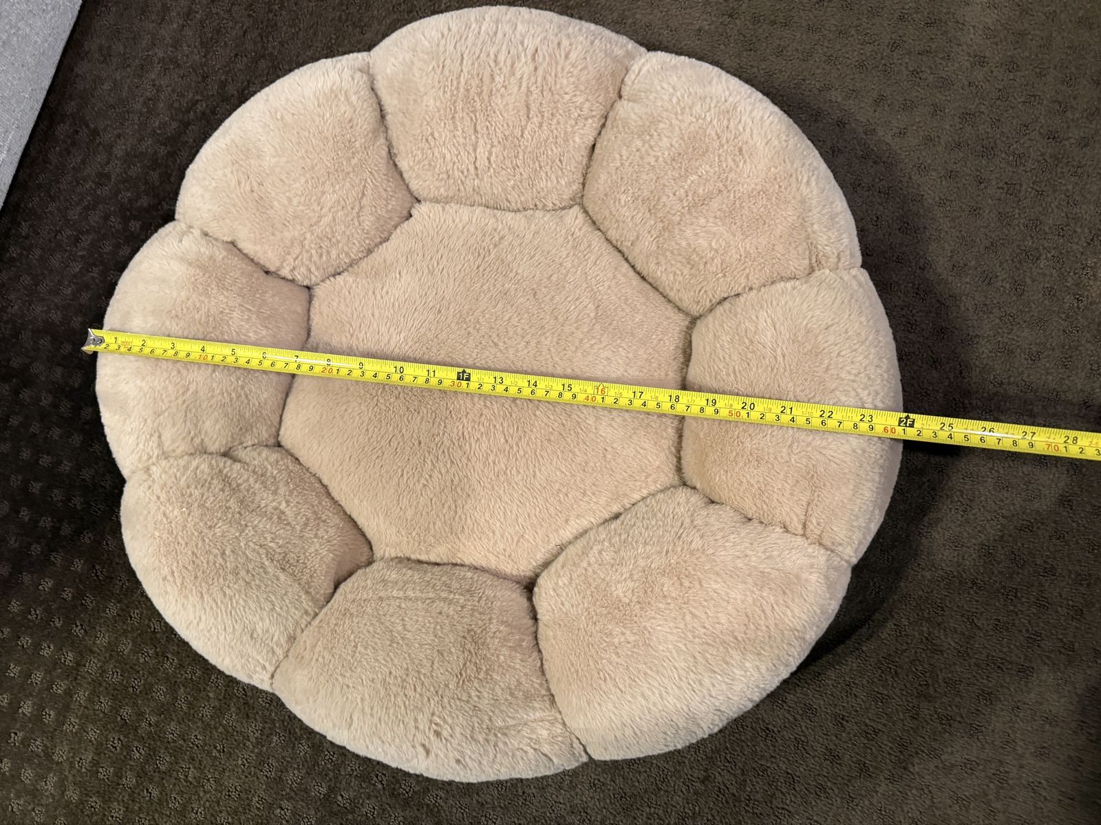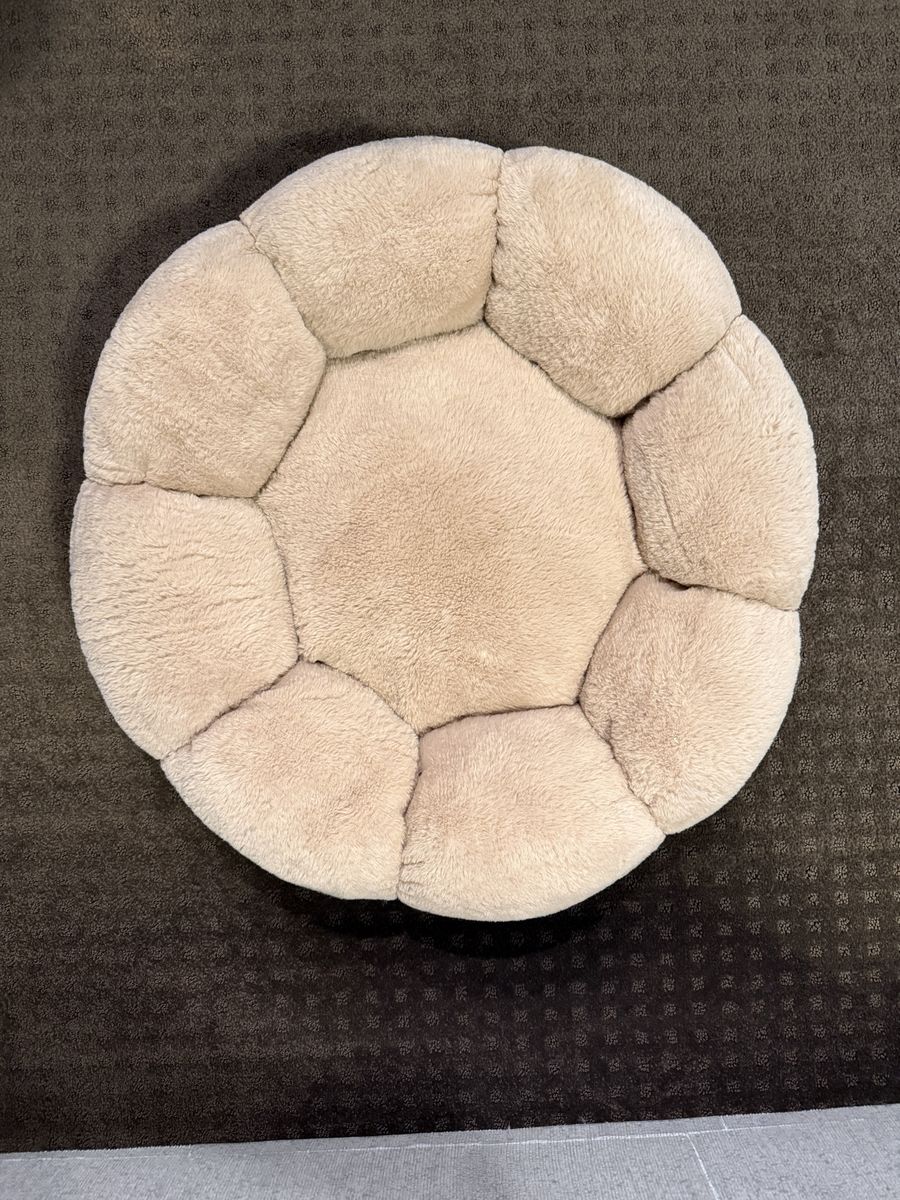 VenmoRound cat bed. Ridiculously soft. Light brown/tan color. Approx 24” across and 7” tall. Despite sitting in our living room for about a year, it’s never been used. For some odd reason this bed was not to the liking to any of our 3 cats, lol.