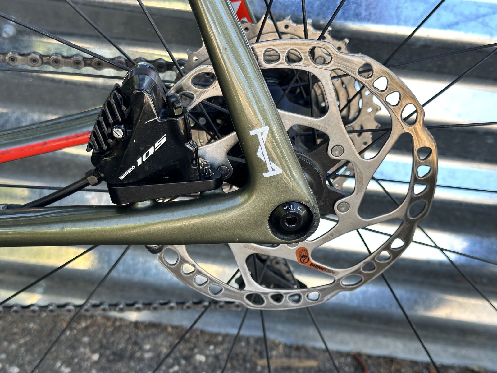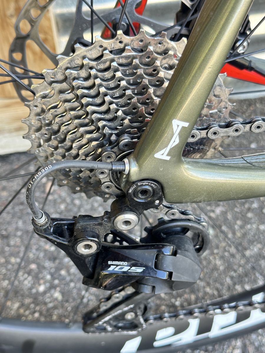 50-33 compact double chainring. The 33 ring is a special size, instead of the stock 34 chainring, is a custom upgrade — for easier climbing. (You Spin, You Win!) Original 34 available upon request.