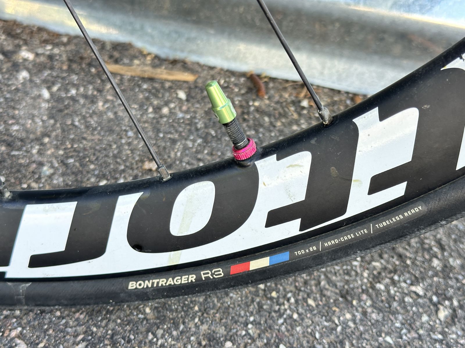 Bontrager 28mm wide tires, tons of life left. Deluxe tubeless stem and metal caps.