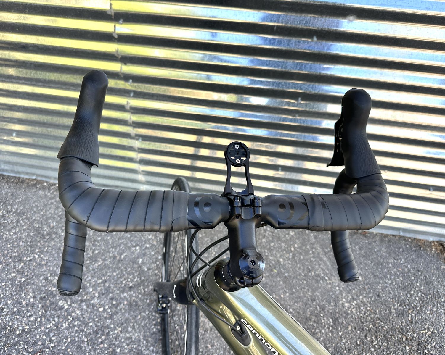 I replaced the alloy handlebar with a aerodynamic carbon fiber unit. Comfortable flatish design for long hours in the saddle. Brand new bar tape just installed.