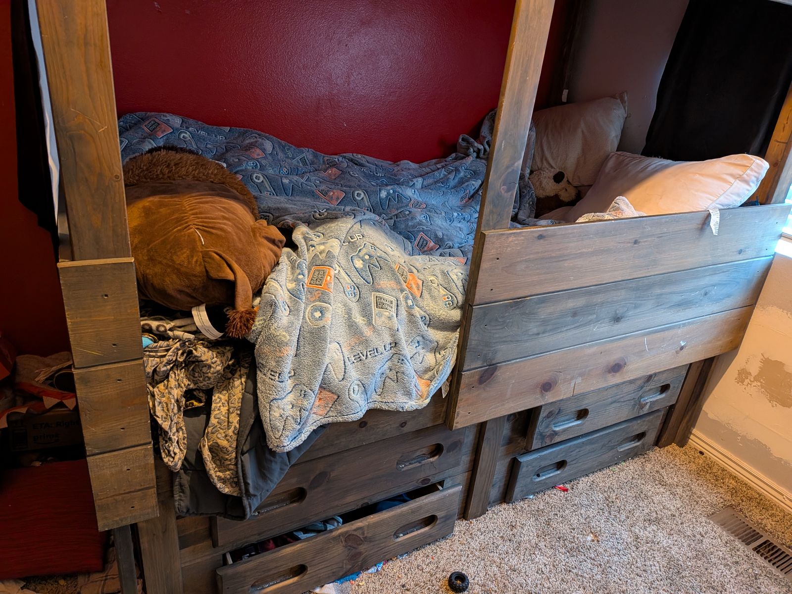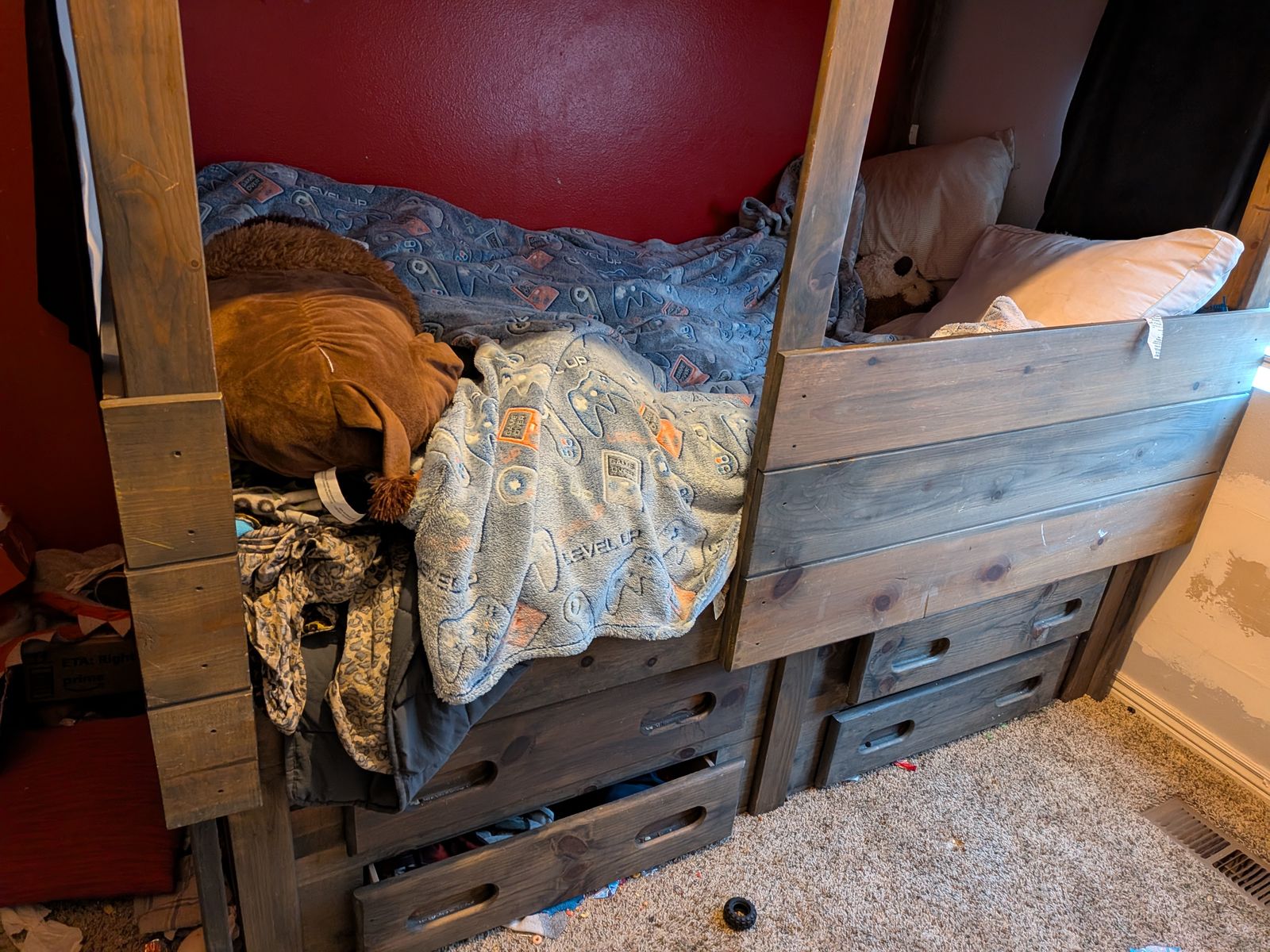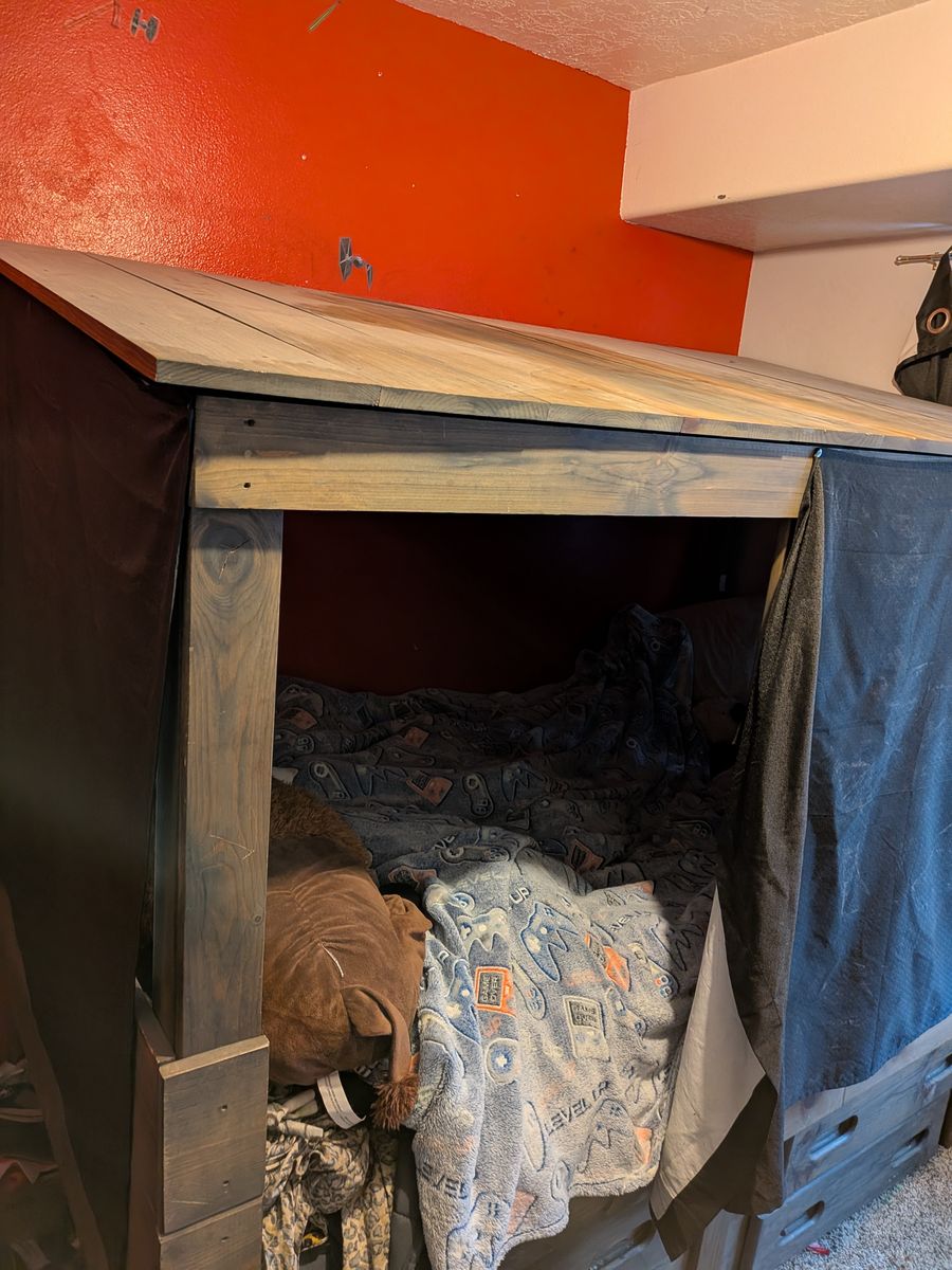 VenmoKid's twin size bed with drawer storage in great condition. Bed has been taken apart, with the needed hardware labeled and ready to go. Great for creating a fort or other hideaway. Willing to deliver within a 25 mile radius for $30.