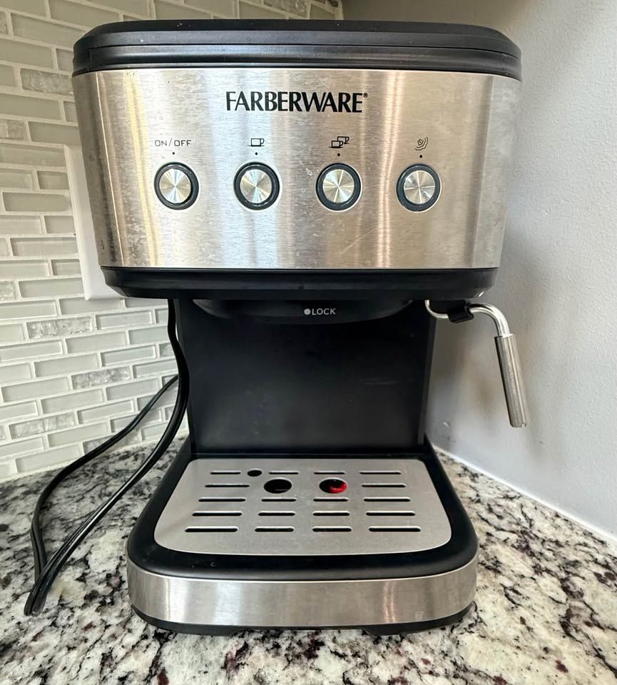 ApplePayFrom product website: “Farberware 20-Bar Espresso Maker…brews espresso shots, lattes, and cappuccino with a full-service espresso maker…Equipped with single and double cup stainless-steel filters and frothing wand. 1.5-liter water tank and drip tray are detachable for easy cleaning…The 20 Bar powerful pressure and boiler heating system heats up water to the perfect temperature for homemade lattes and cappuccinos while a high-pressure frothing wand can steam milk for foam…The Farberware 20-Bar Espresso Maker brews authentic barista-quality espresso beverages.”