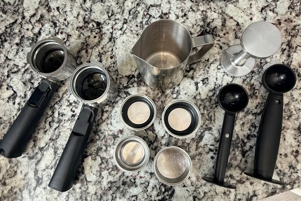 Including the original porta-filter and two filter pods as well as an additional set, two measuring spoons with tamps, stainless steel double tamp, and stainless steel frothing pitcher.