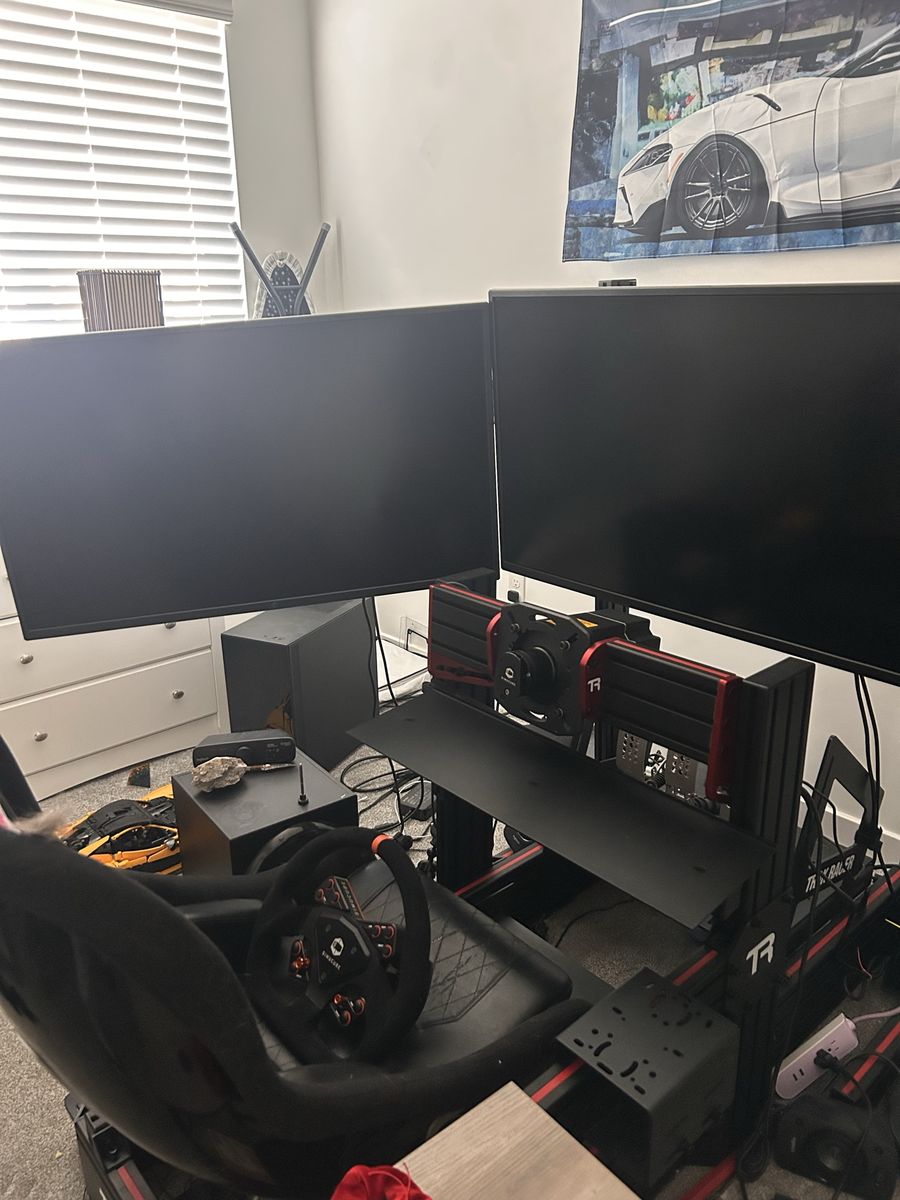 Selling full racing sim minus pc. Comes with trak racer chassis, gt seat, simicube wheel and steering system. 3 giant monitors, don’t know sizing but that are the largest you can fit on the monitor mount that is also included. 5 point sound system, buttkicker, and 3 pedal heusinkveld set. This sim is very big and heavy. You will need to disassemble to move, and I would suggest coming with the more than one person as again this sim is huge and very heavy. Paid 10k, asking 3k OBO, cash only.