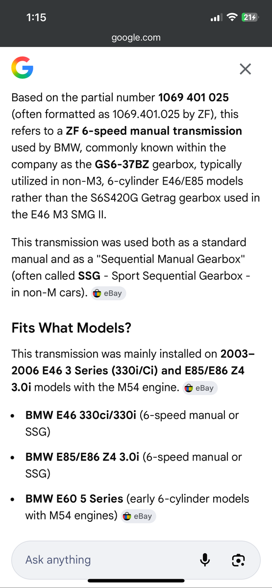 Based on the partial number 1069 401 025(often formatted as 1069.401.025 by ZF), this refers to a ZF 6-speed manual transmissionused by BMW, commonly known within the company as the GS6-37BZ gearbox, typically utilized in non-M3, 6-cylinder E46/E85 models rather than the S6S420G Getrag gearbox used in the E46 M3 SMG II.