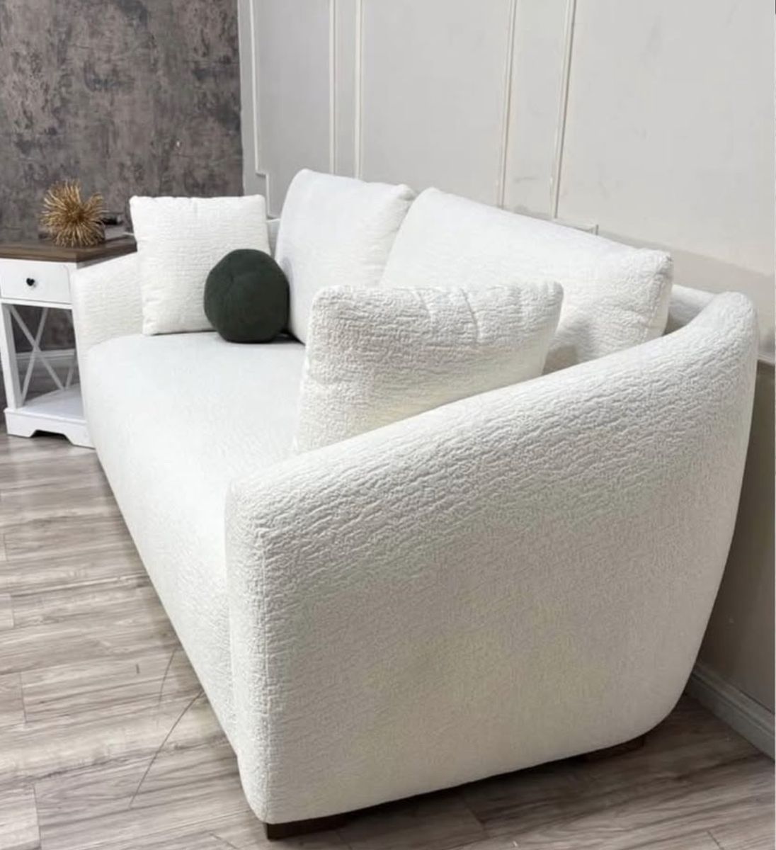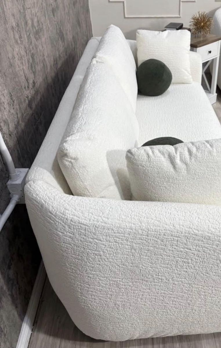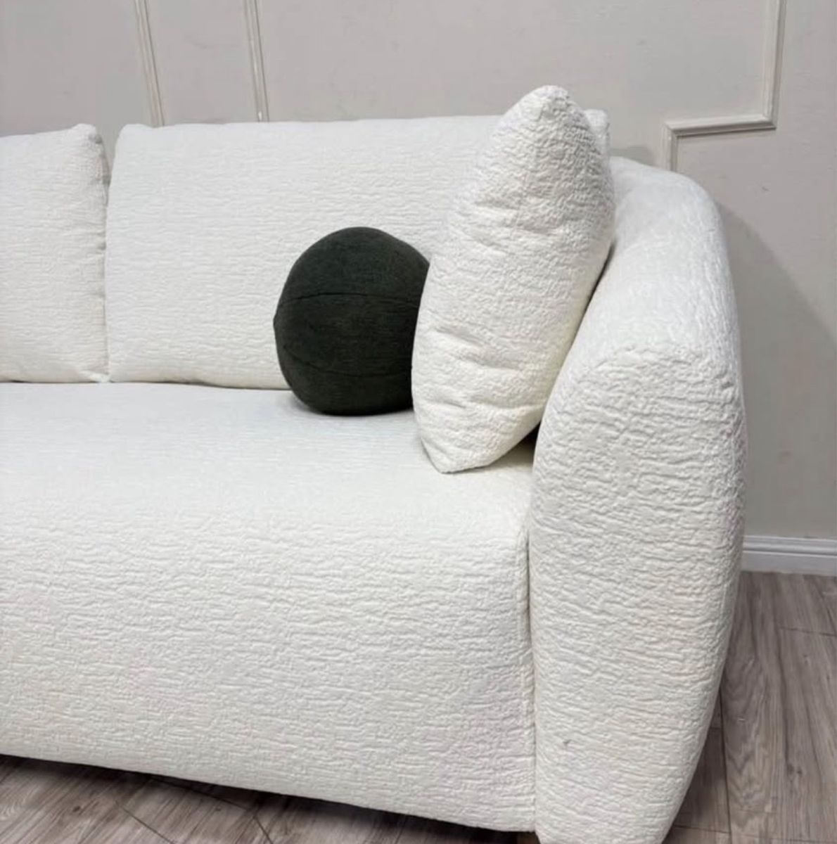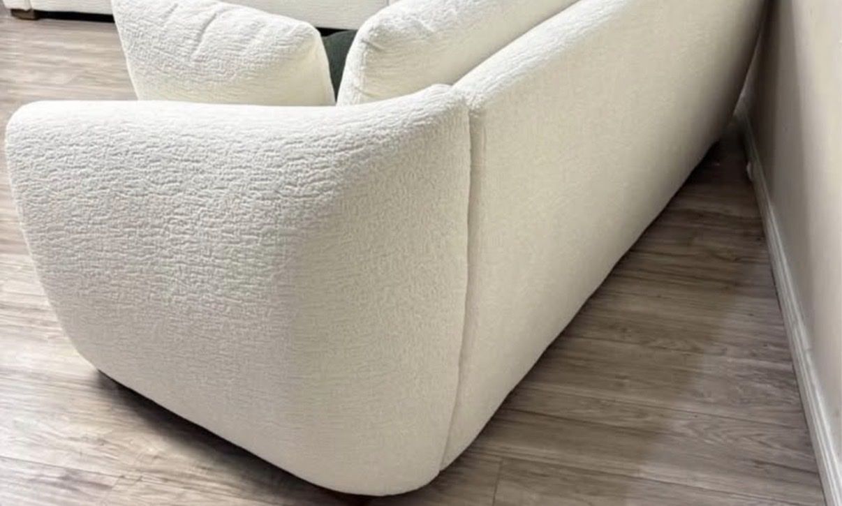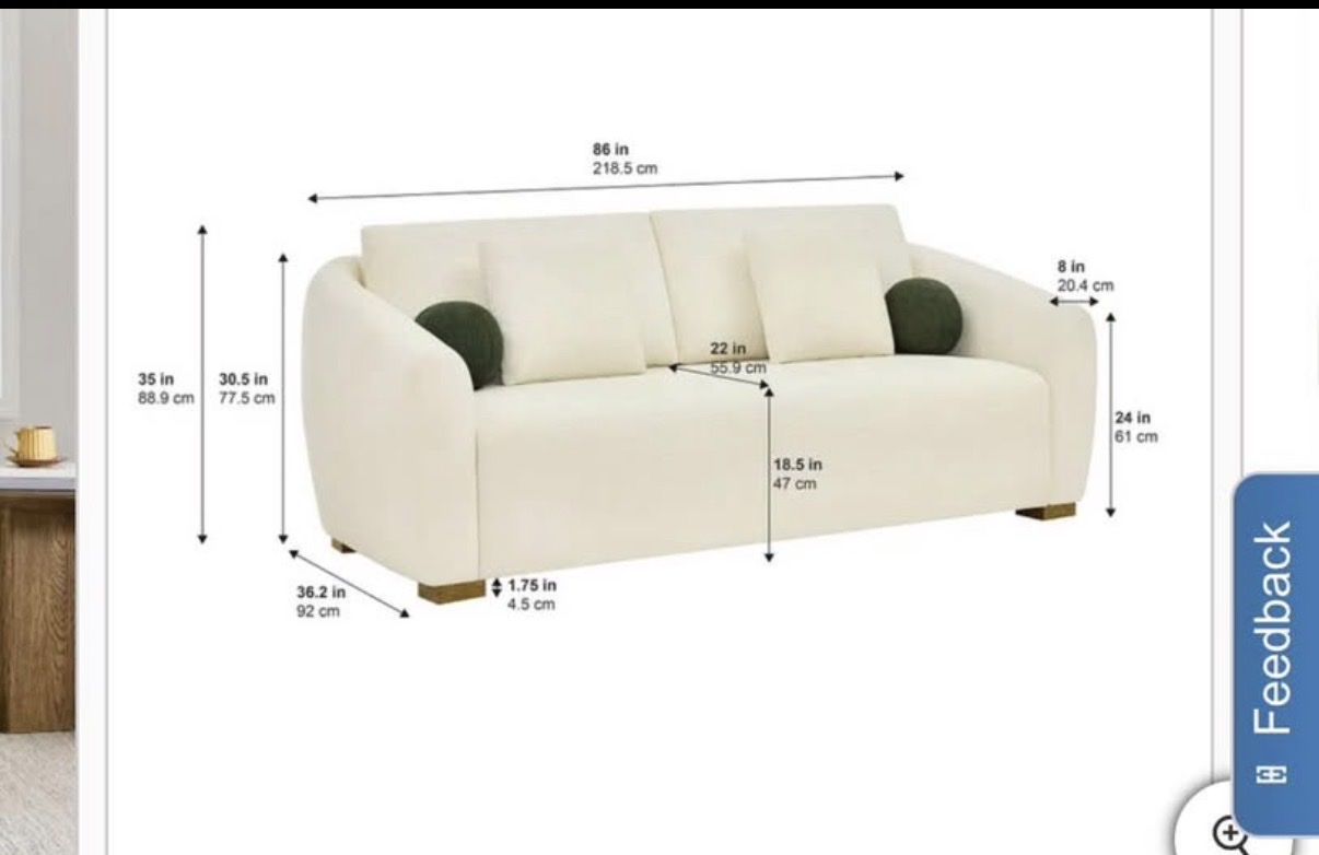 Modern Sofa with Curved Arms Waterfall Seat with Pocket Coil Support 4 Accent Pillows Included Solid Wood Legs Loose, Reversible Back Cushions