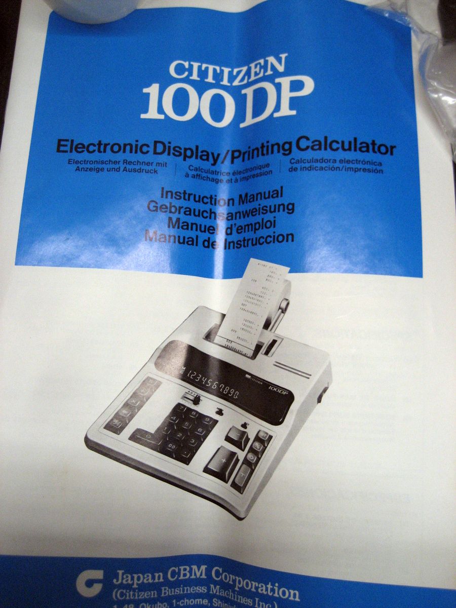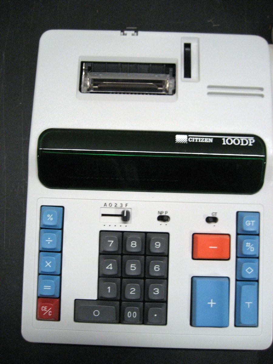 Buy This $20 - Retail Value $129.95 We have many of these Now located in Eagle Mountain, UT - WE WILL SHIP - JUST ASK FOR SHIP COST ! NEW Citizen 100DP Desk Calc 10 digit color GT function 7.75"w x 10"Lx 2"h w/warranty BRAND NEW in original Citizen box - sealed (only opened one to check contents) Brand: Citizen Model: 100DP Black / Red printing Comes with: new calc 100DP user operations manual roll new paper complete with paper arms new original ink Roller new Original Dust Cover power cord unique to this model 2.5 lines per second printer 10 digit 10 key GT function switch sub Total Total