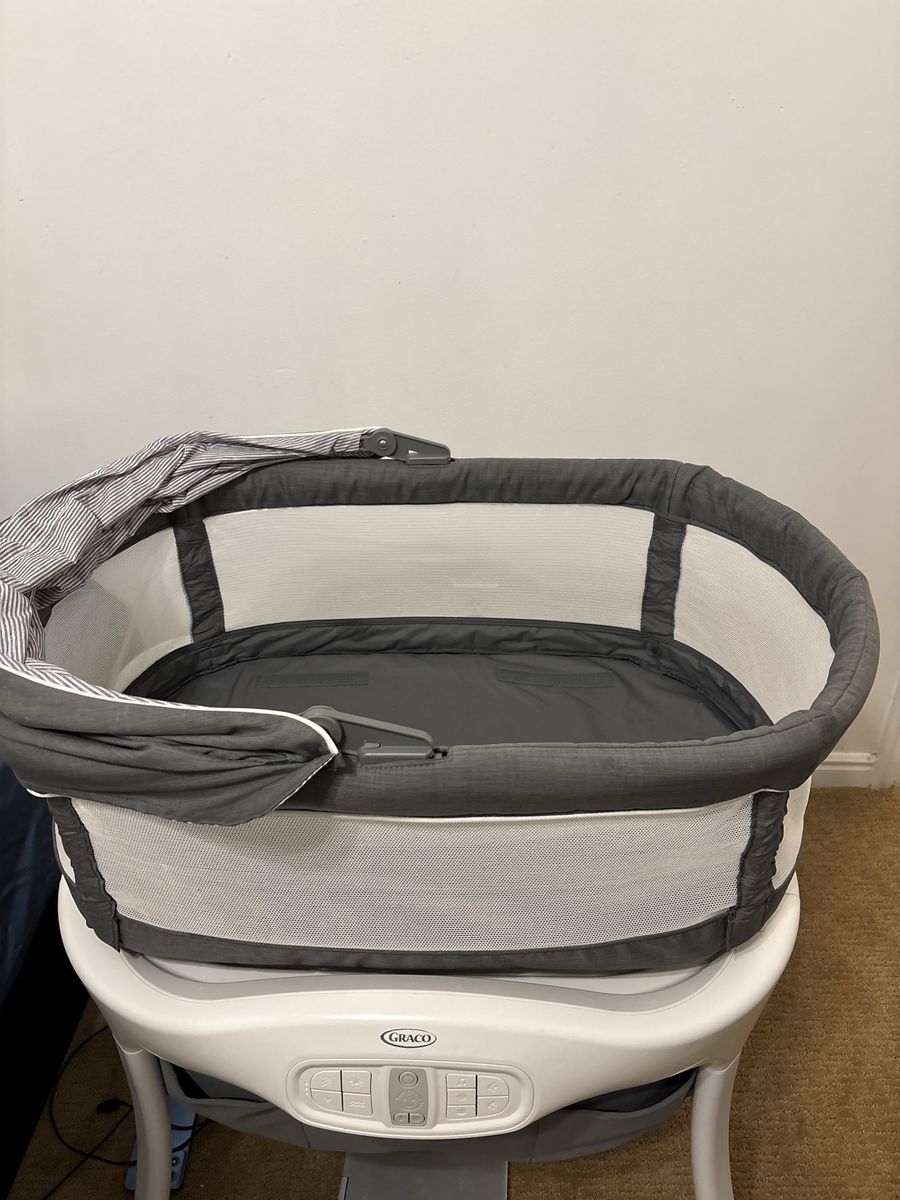 VenmoDoes not work. I have the charger. Everything is clean with no stains. Bassinet does move back and forth so you can push it yourself. Selling as a bassinet. $70 obo