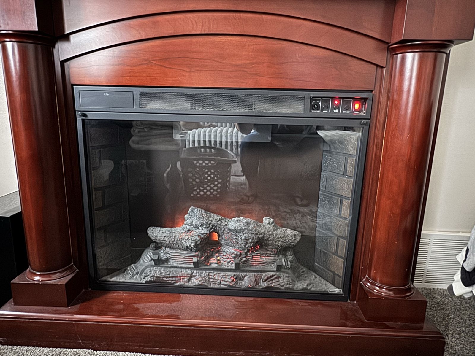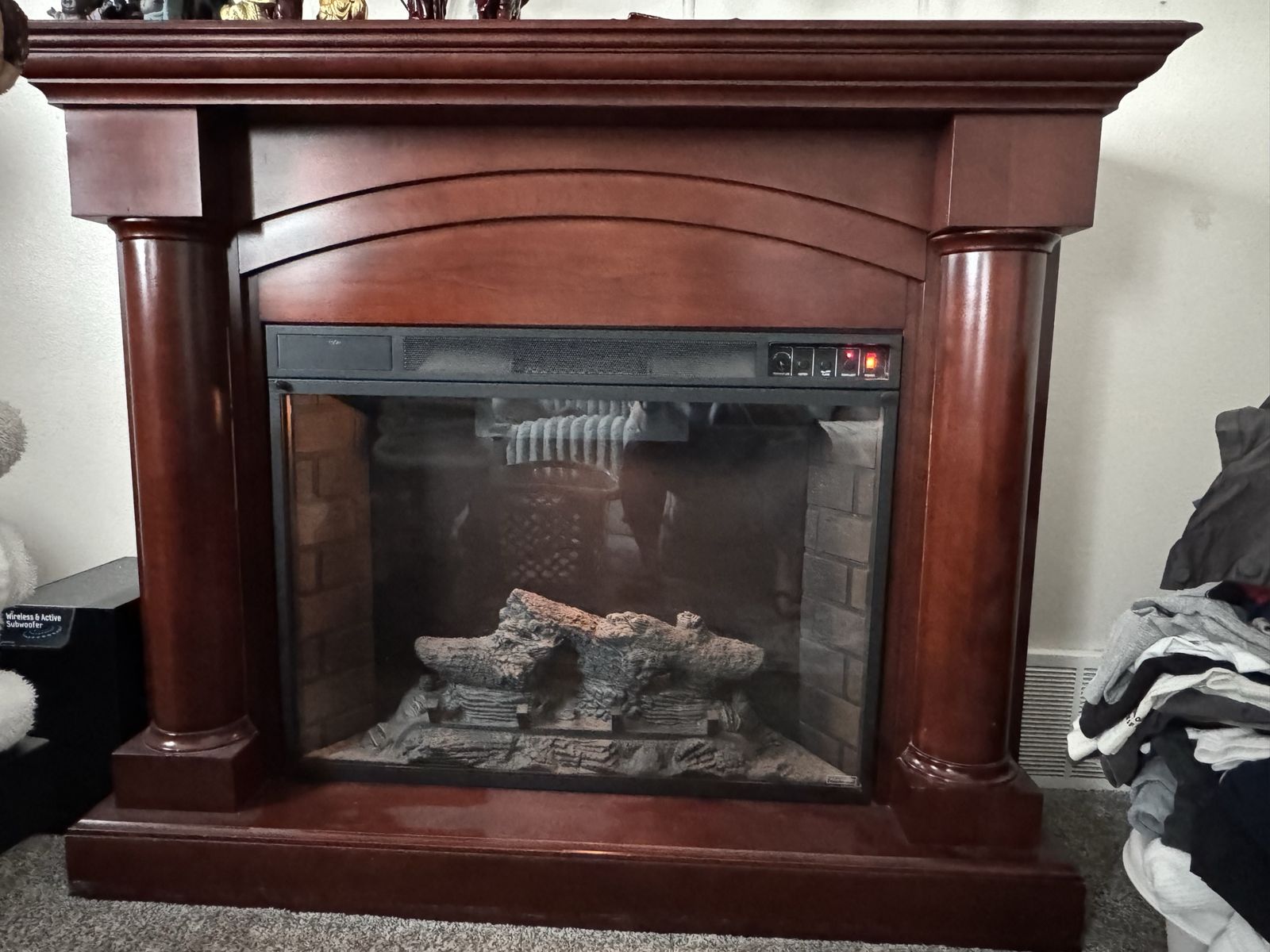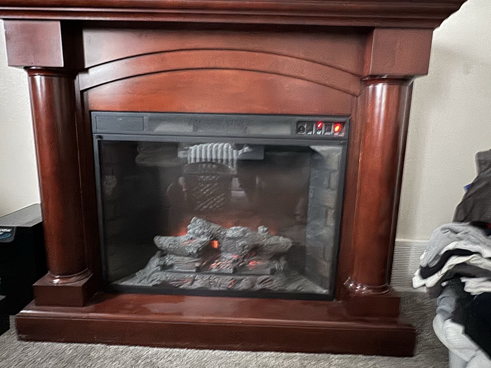 VenmoAsking $60 or best reasonable offer Dark wood color. Good condition because of the minor scratches and the imperfection in the top coat as shown in the picture. Comes with remote and works perfectly. Has a down light option, can be used to heat a smaller area with the flame on or off.
