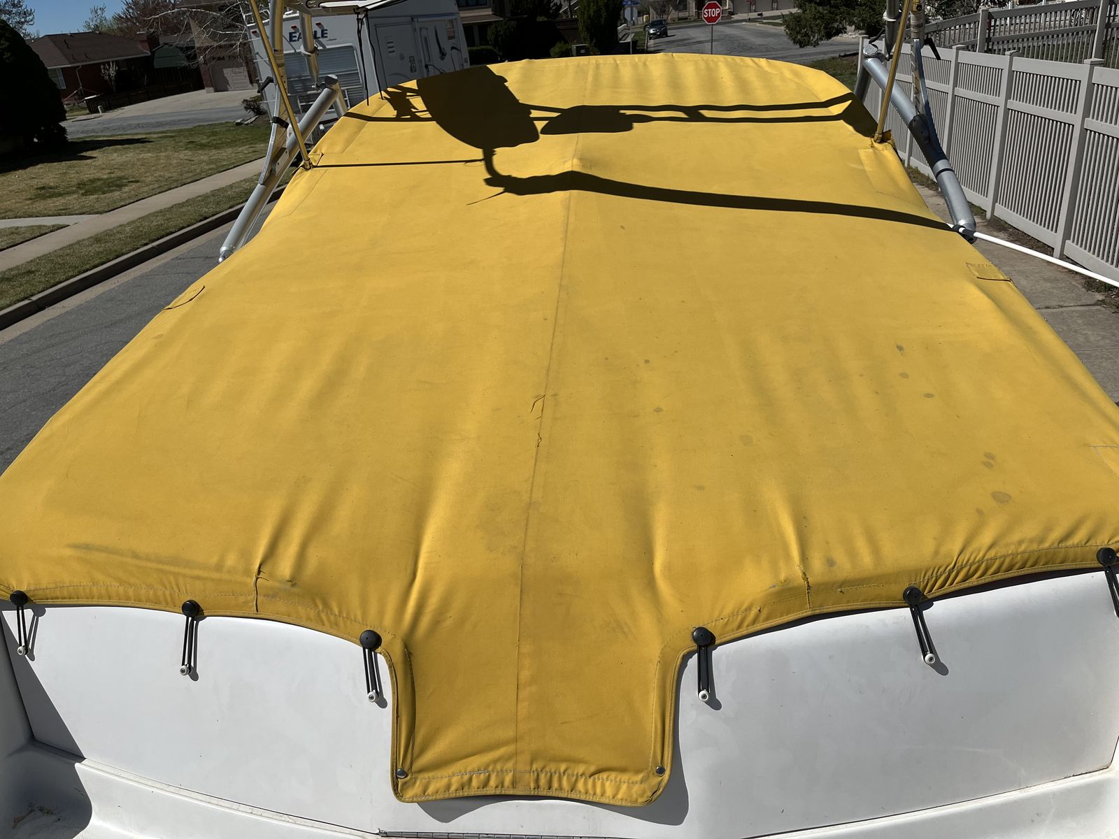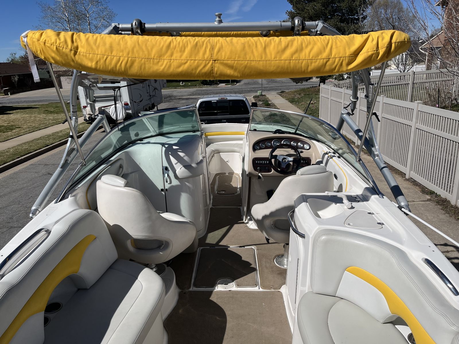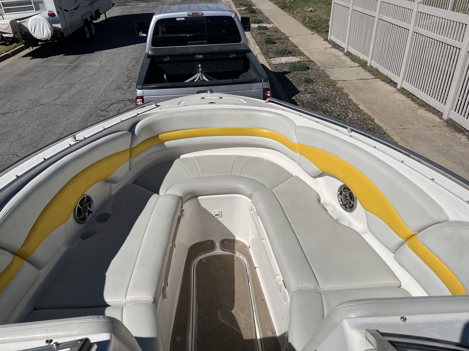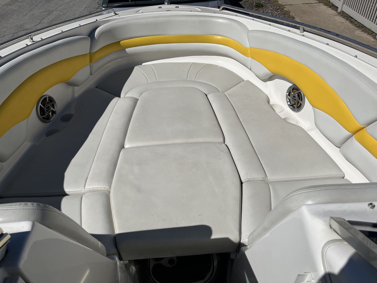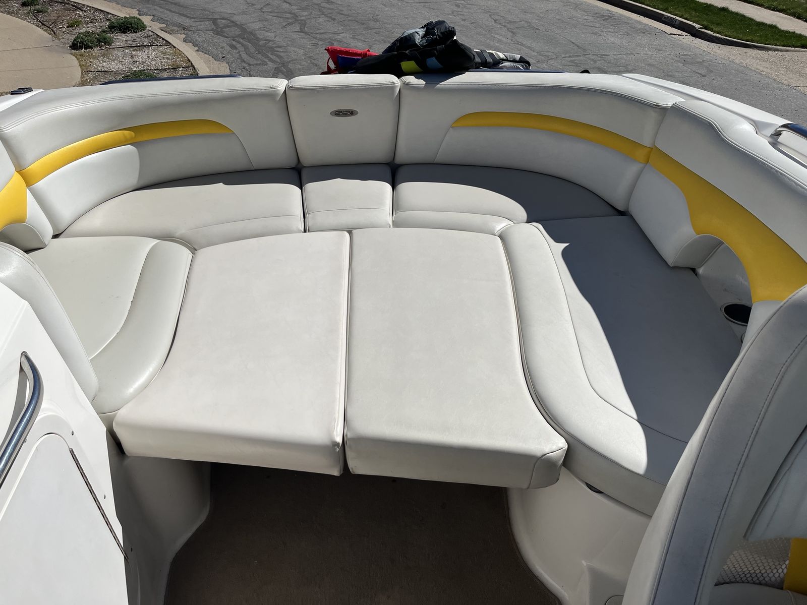 Upholstery: in great condition, comfortable and visually appealing. Comes with additional cushions which make up a bed in front and a second bed in the rear.